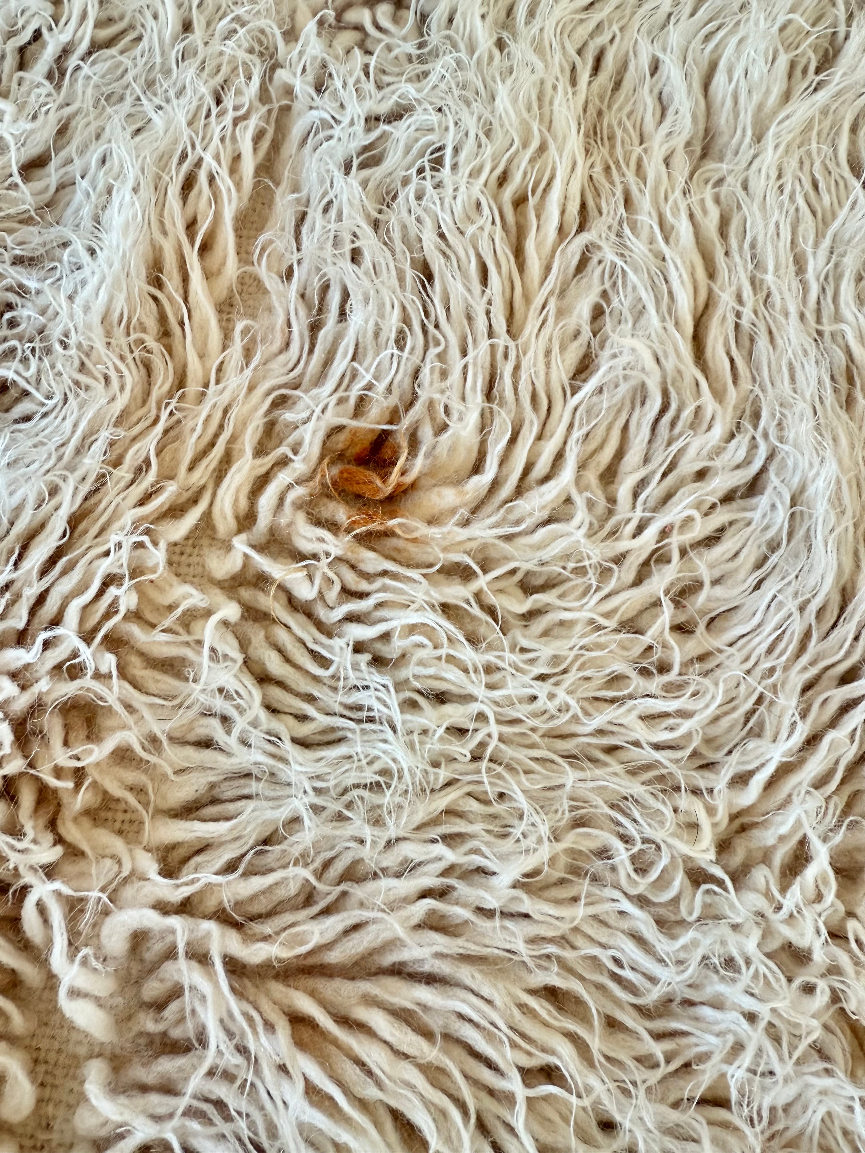 織り方はざっくりとしていて、いかにも家庭で織られてきた手織りの織り物。紡いだ長い羊の毛を織り込んでいます。