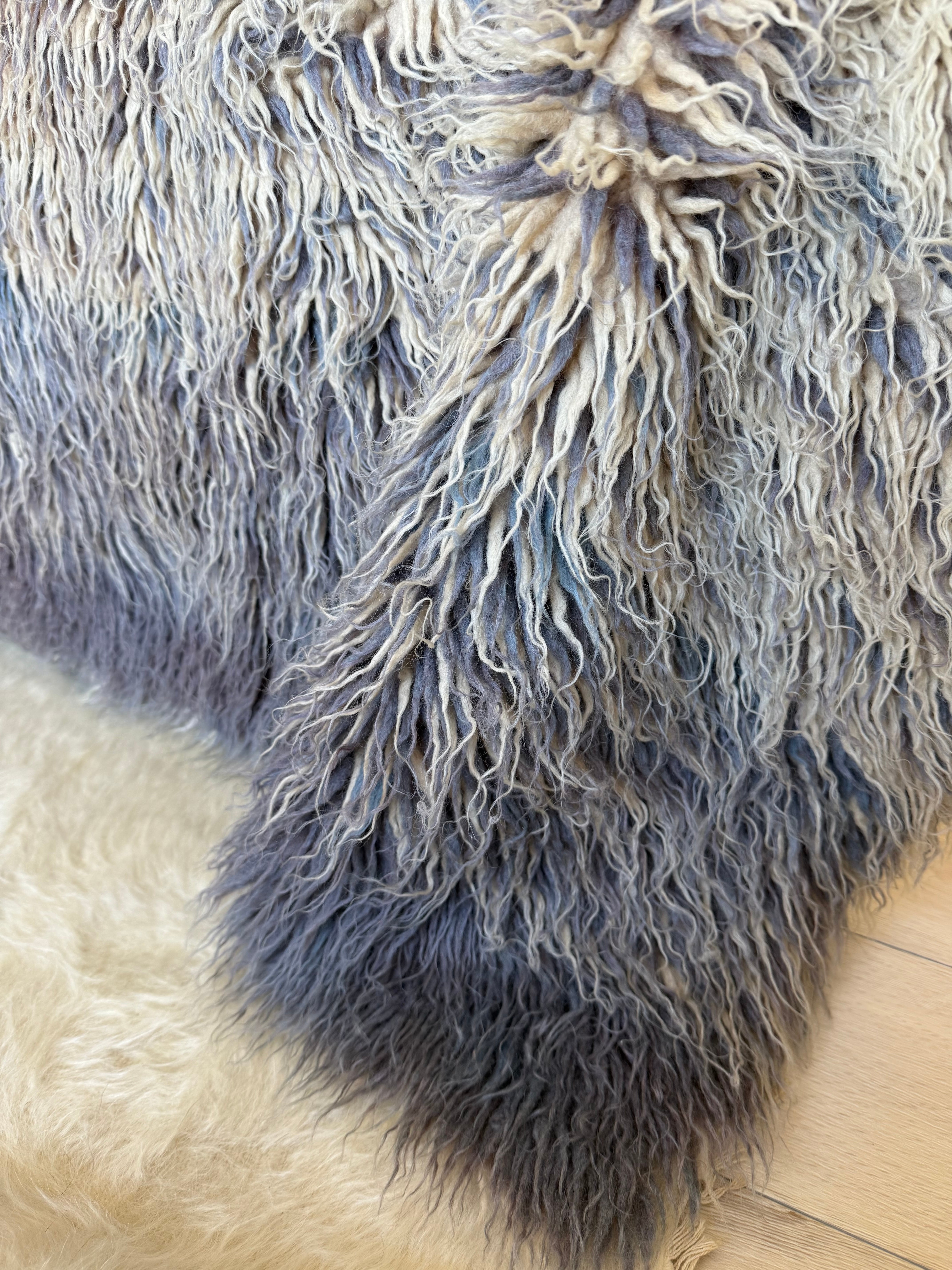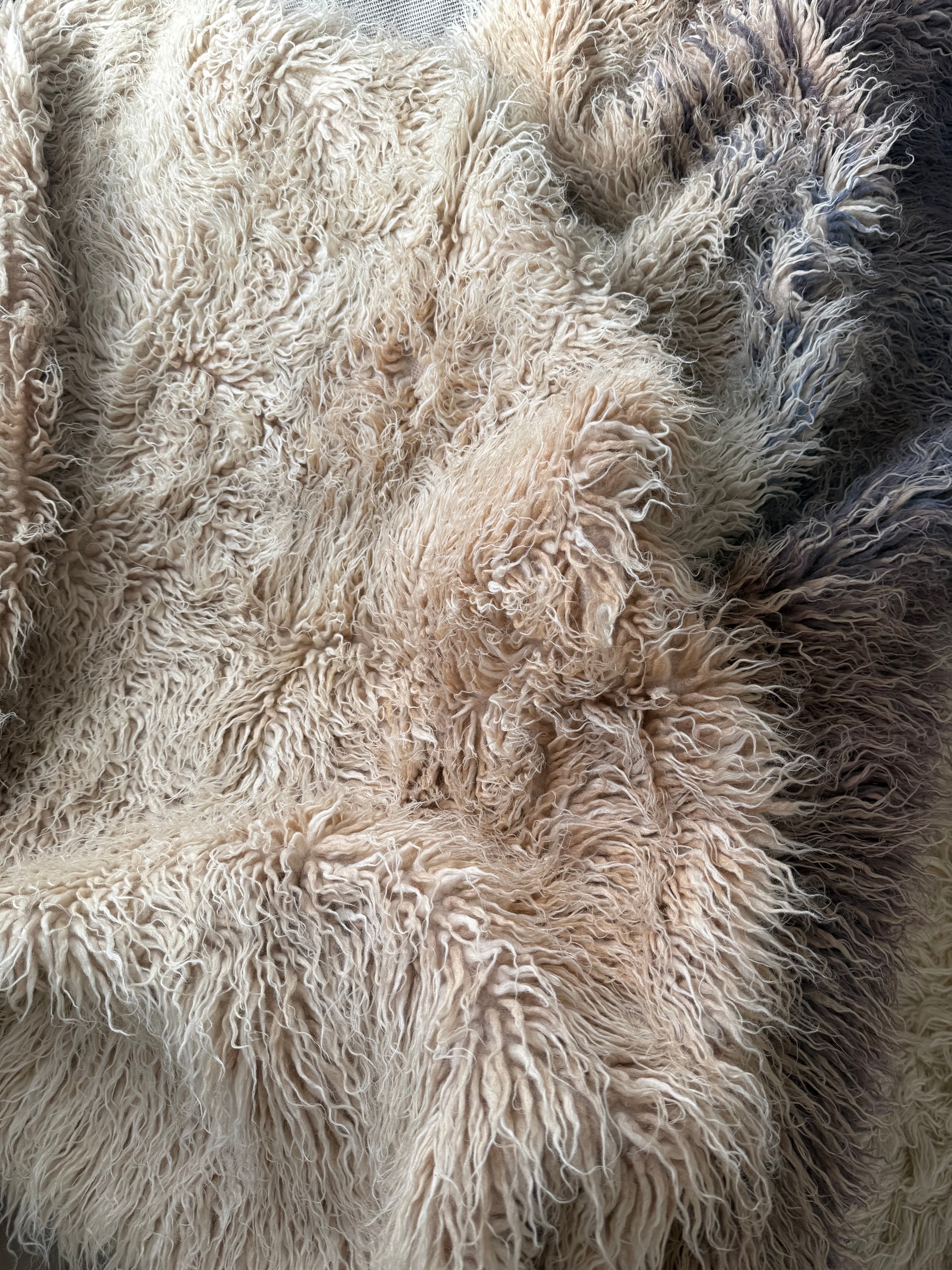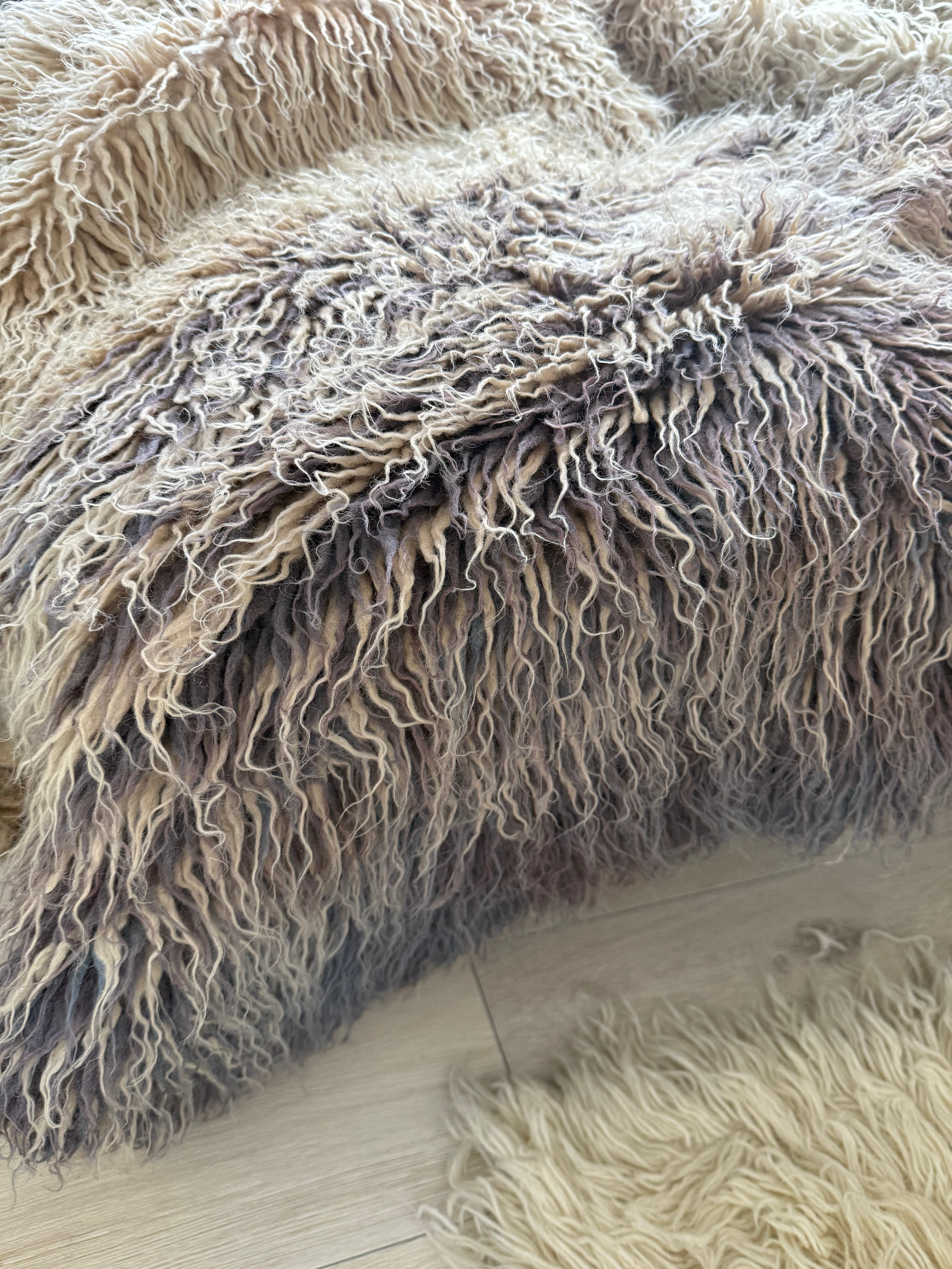 山岳地帯で暮らす遊牧民たちが自らの暮らしのために織ってきたもので、寒さを凌ぐためにこのように毛足が長い織物を作るようになったようです。