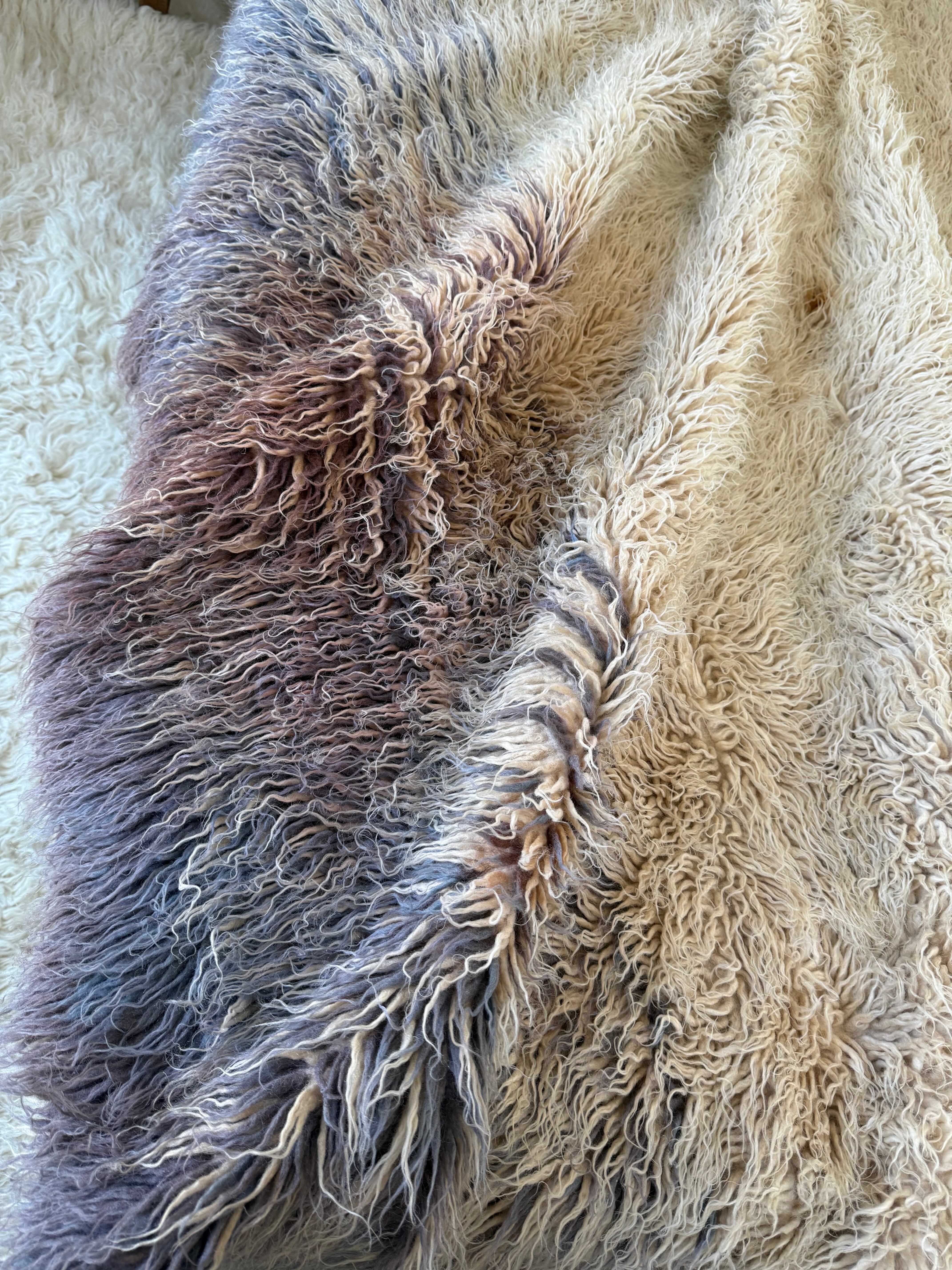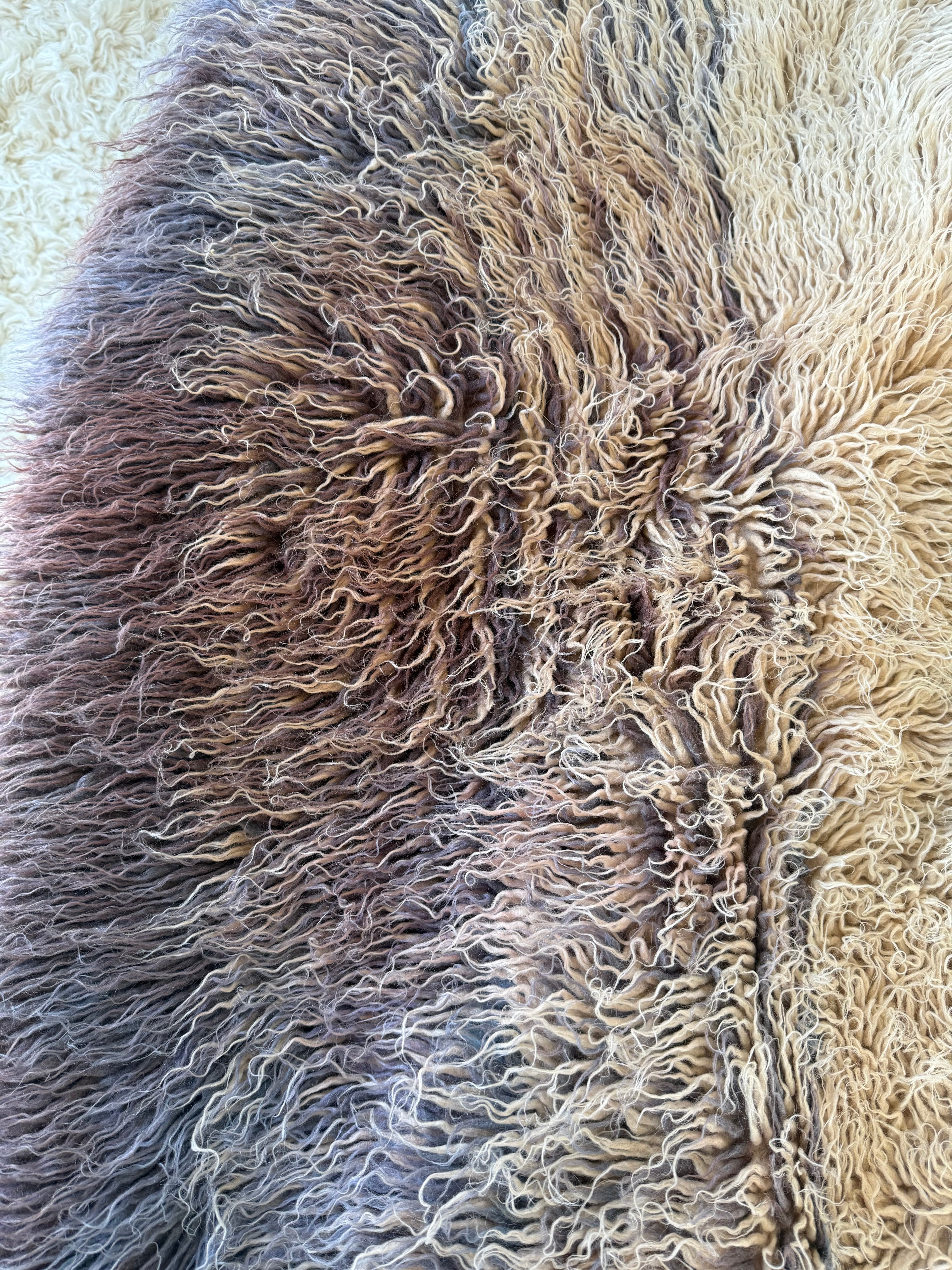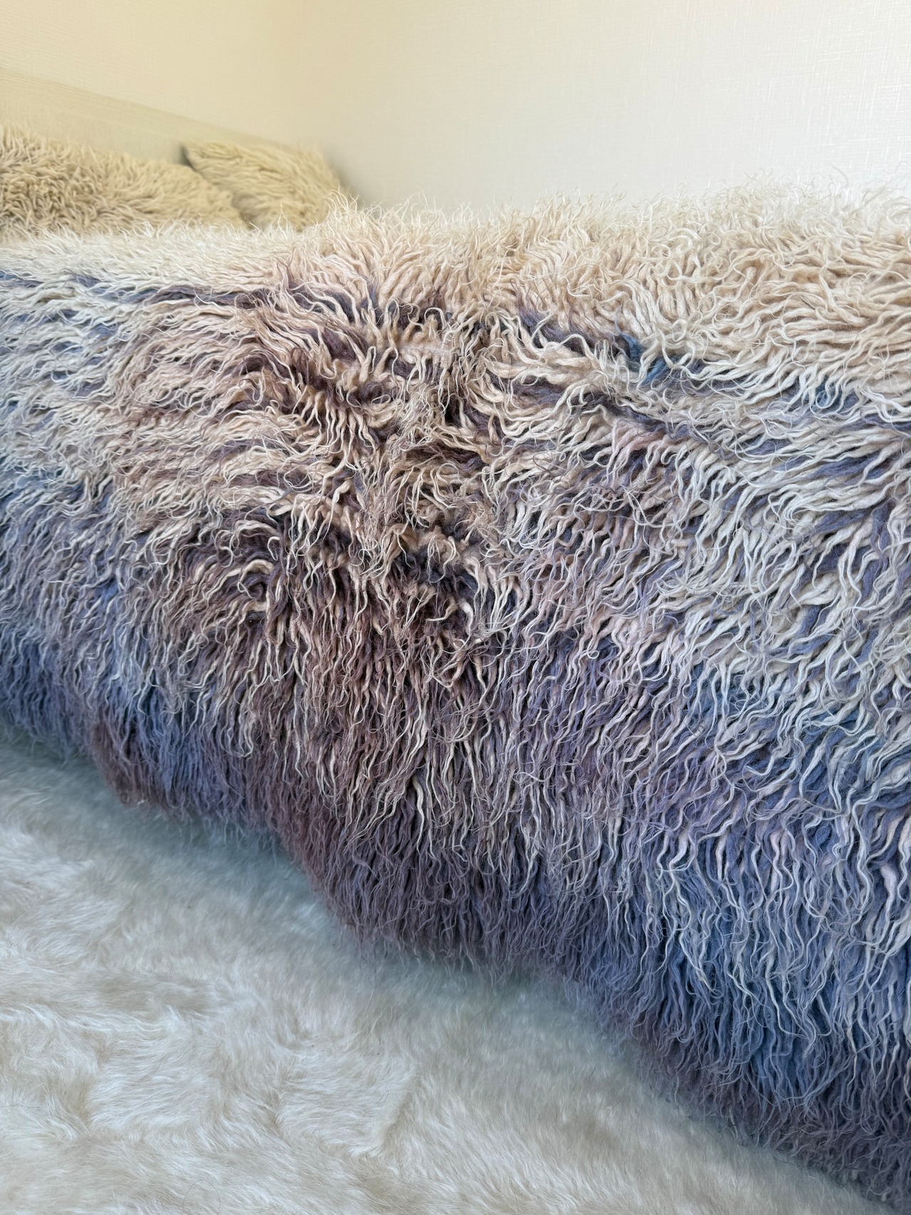 両端を濃い紫からピンクベージュに染めており、よく見ると染めている部分は紫と無染色の羊の毛のボーダーになっています。