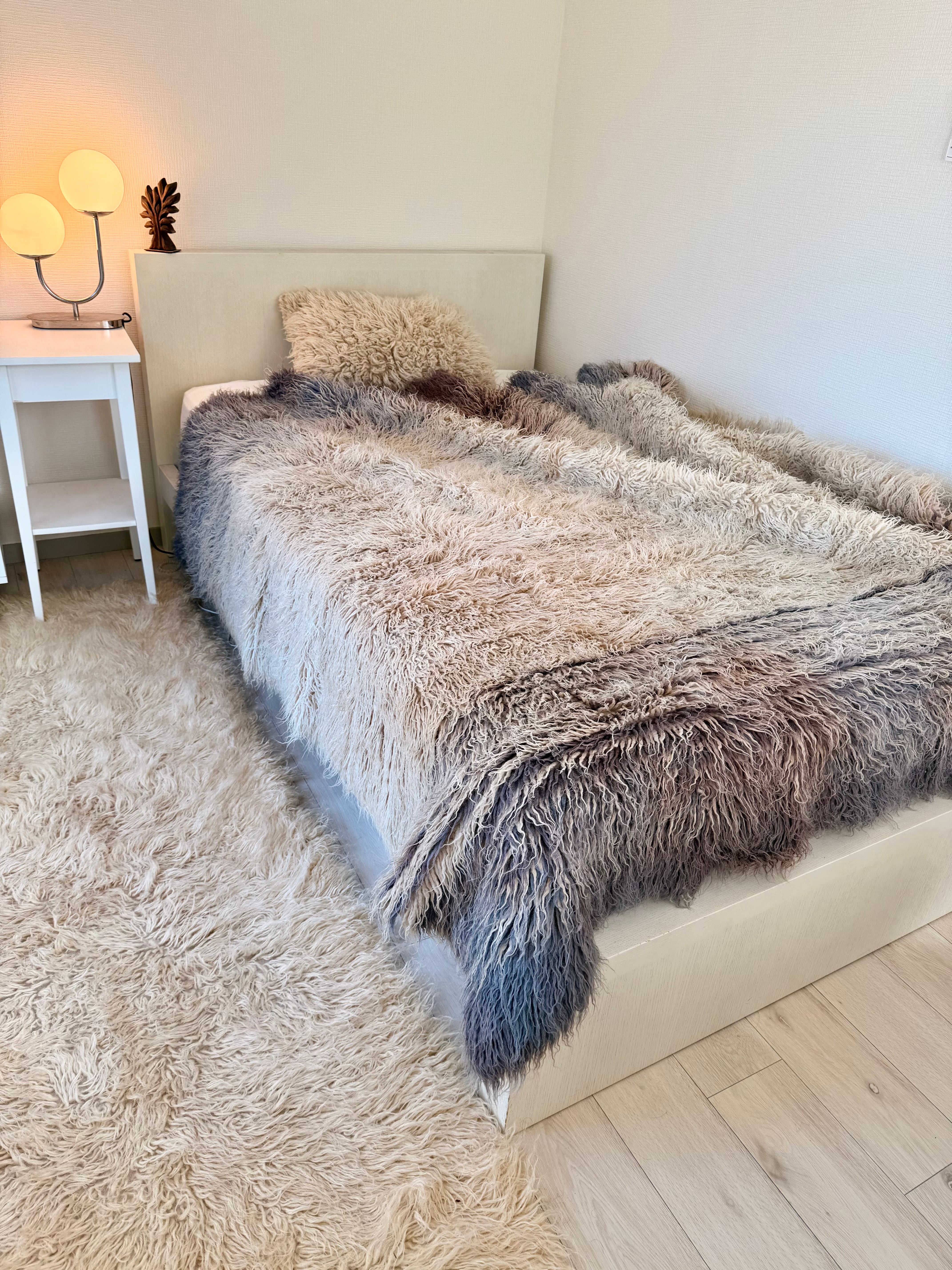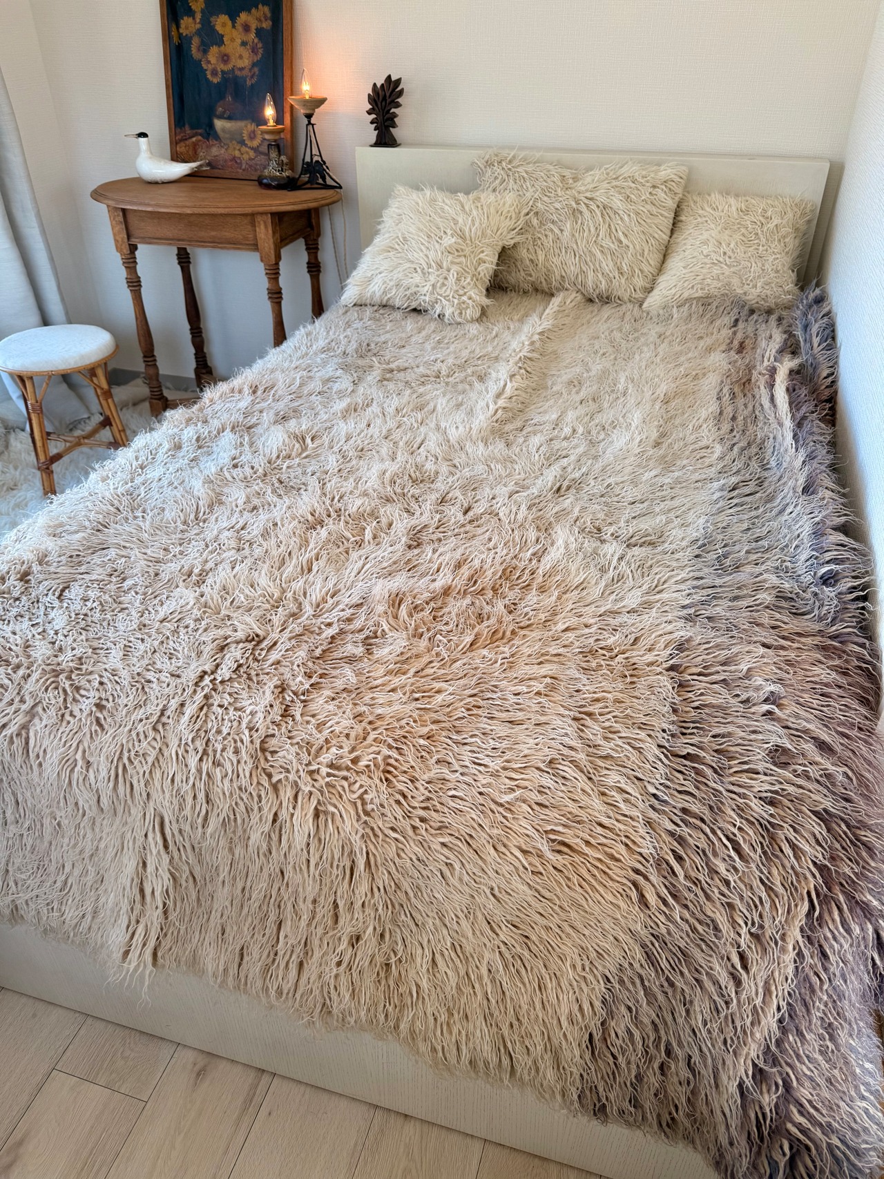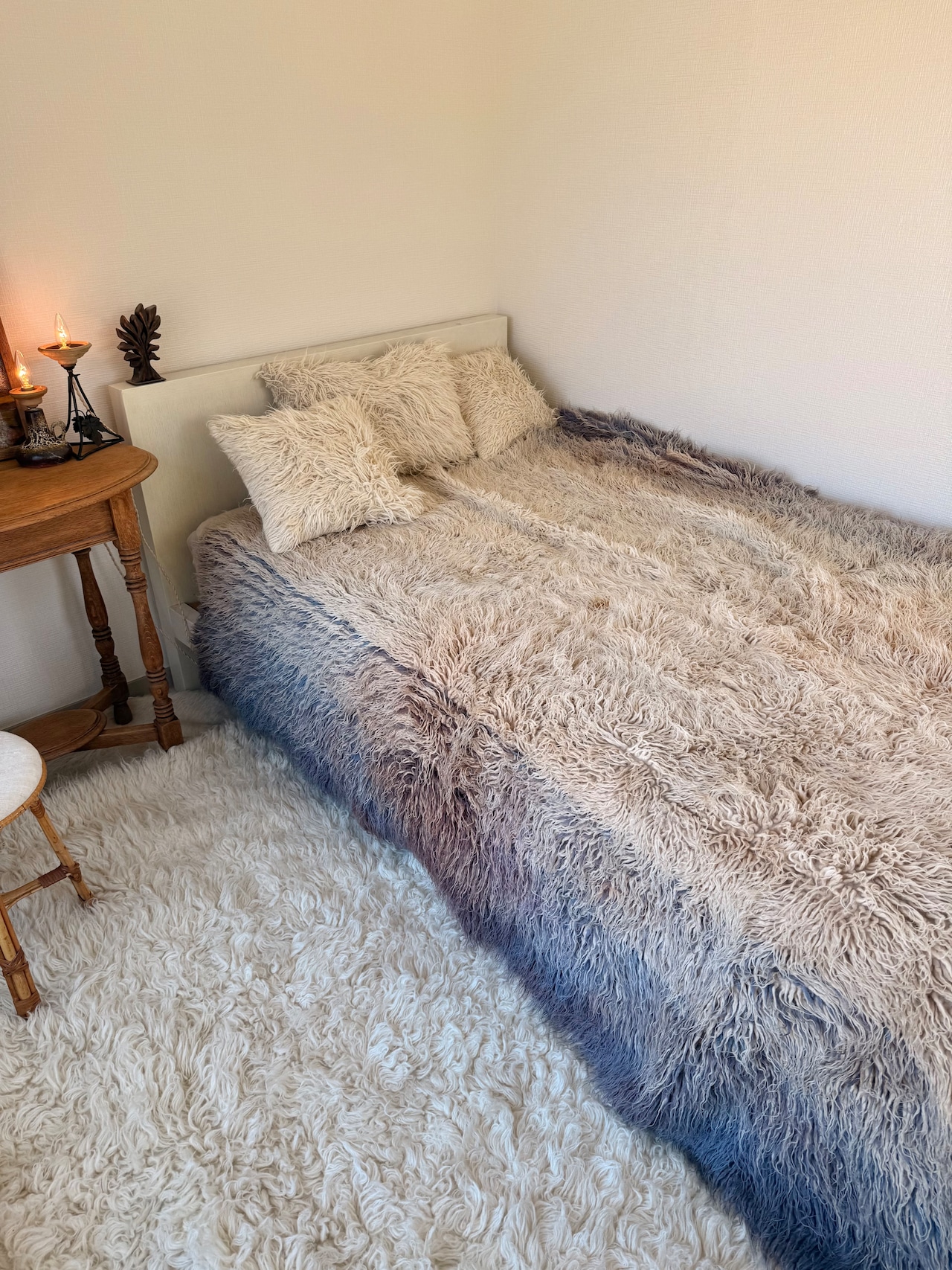 ローテーブルの下に敷いたり、写真のようにベッドの上にかけてもお使いいただけ、