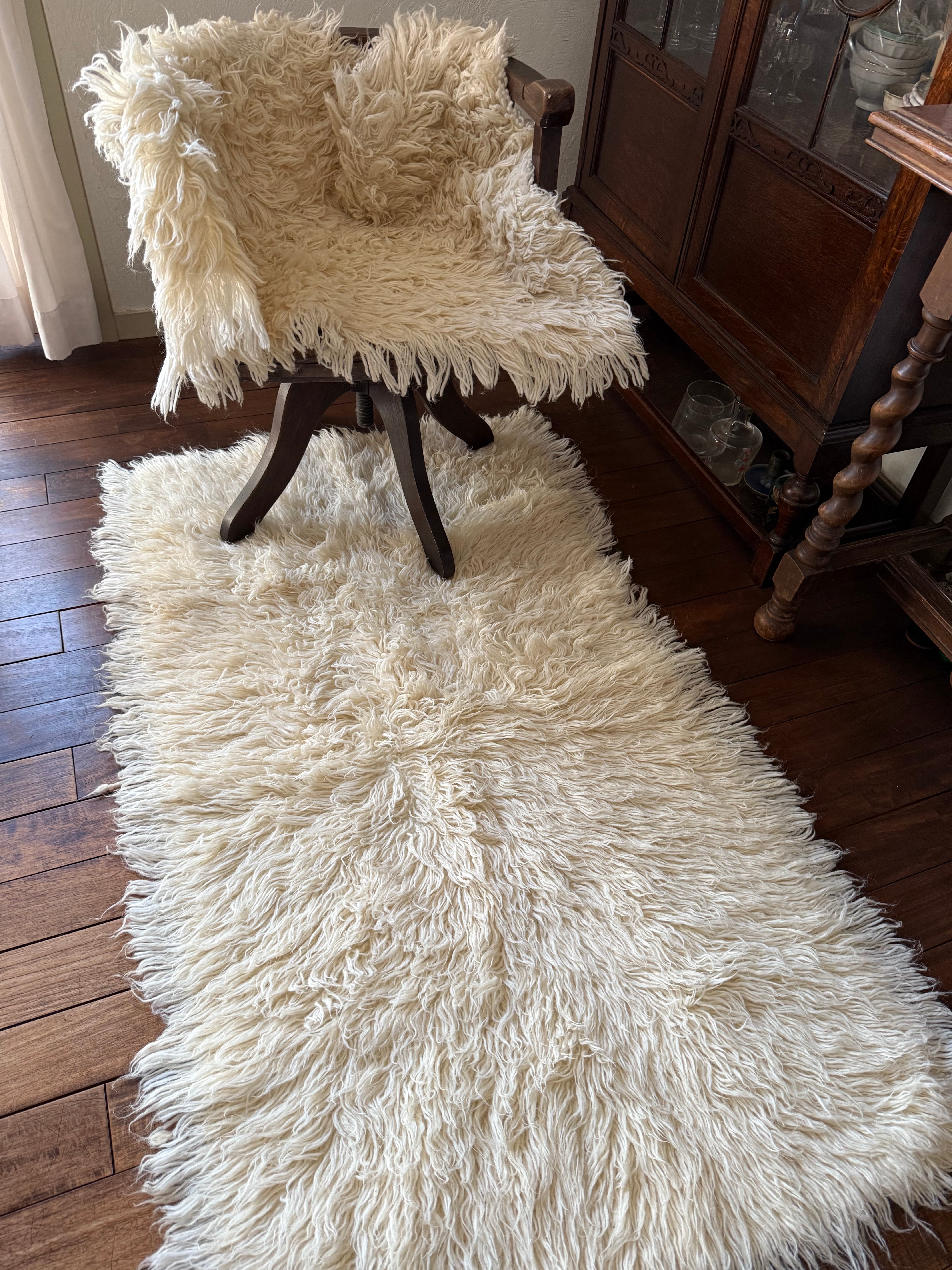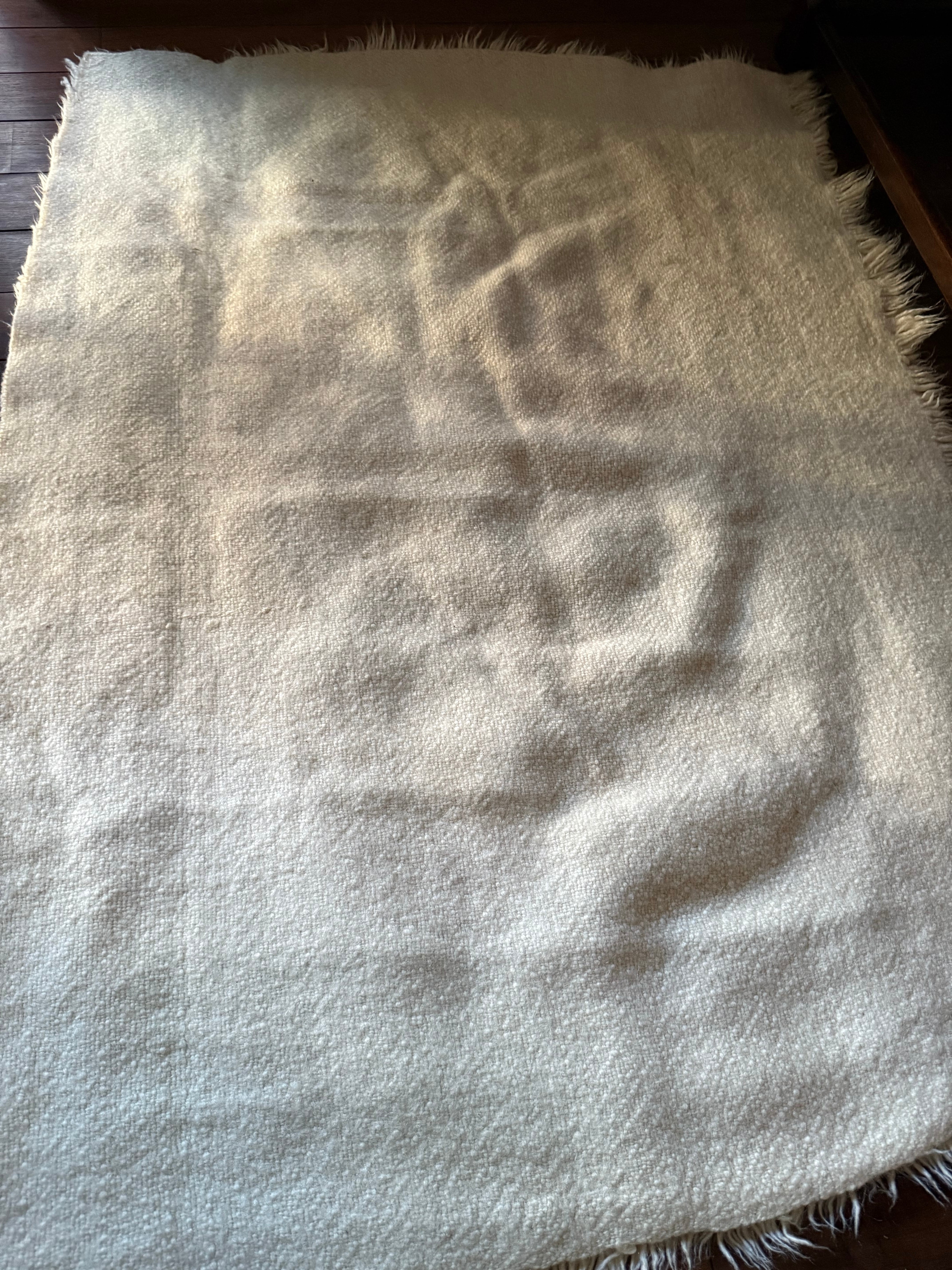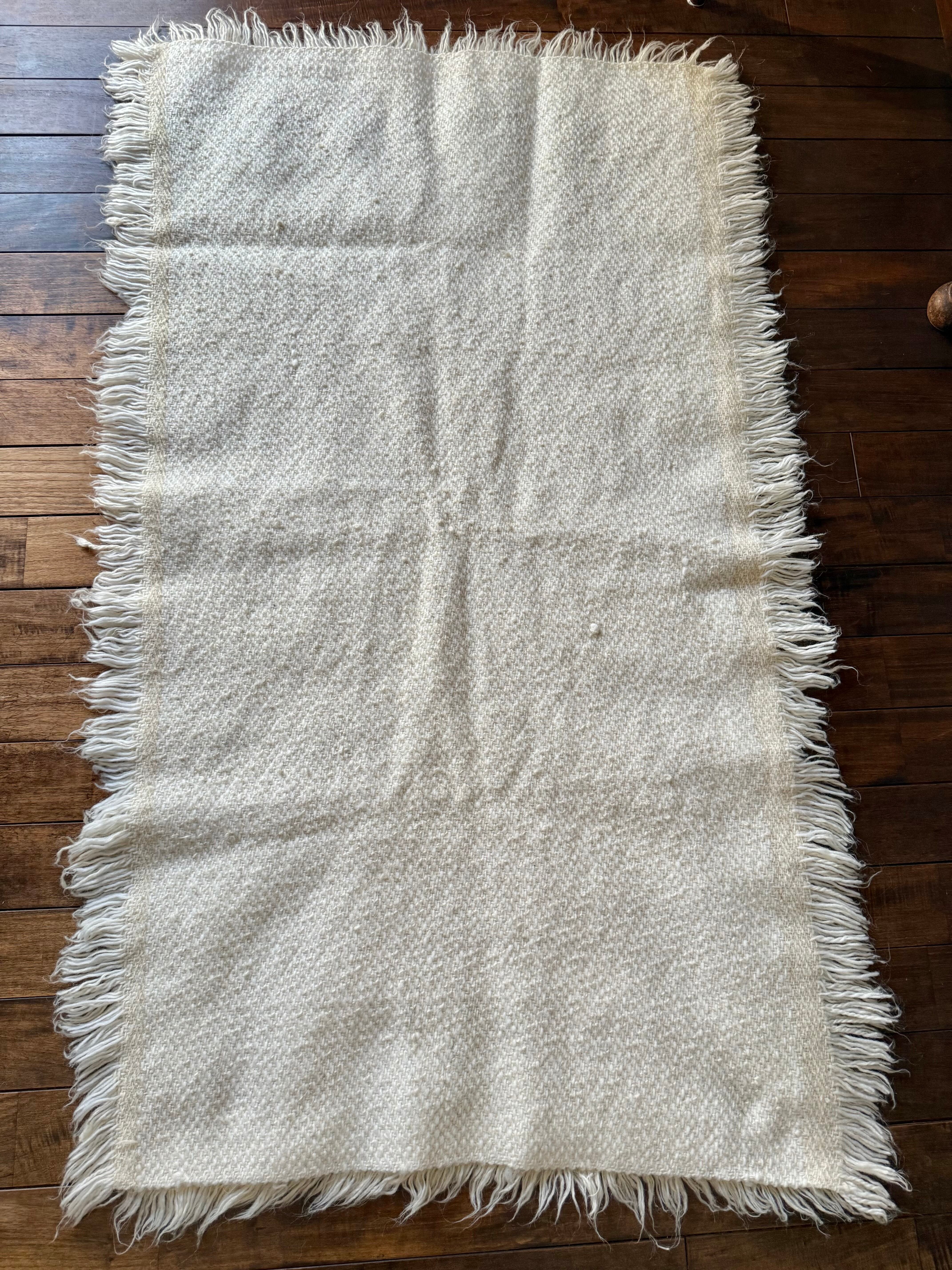 織り方はざっくりとしていて、いかにも家庭で織られてきた手織りの織り物。紡いだ長い羊の毛を織り込んでいます。