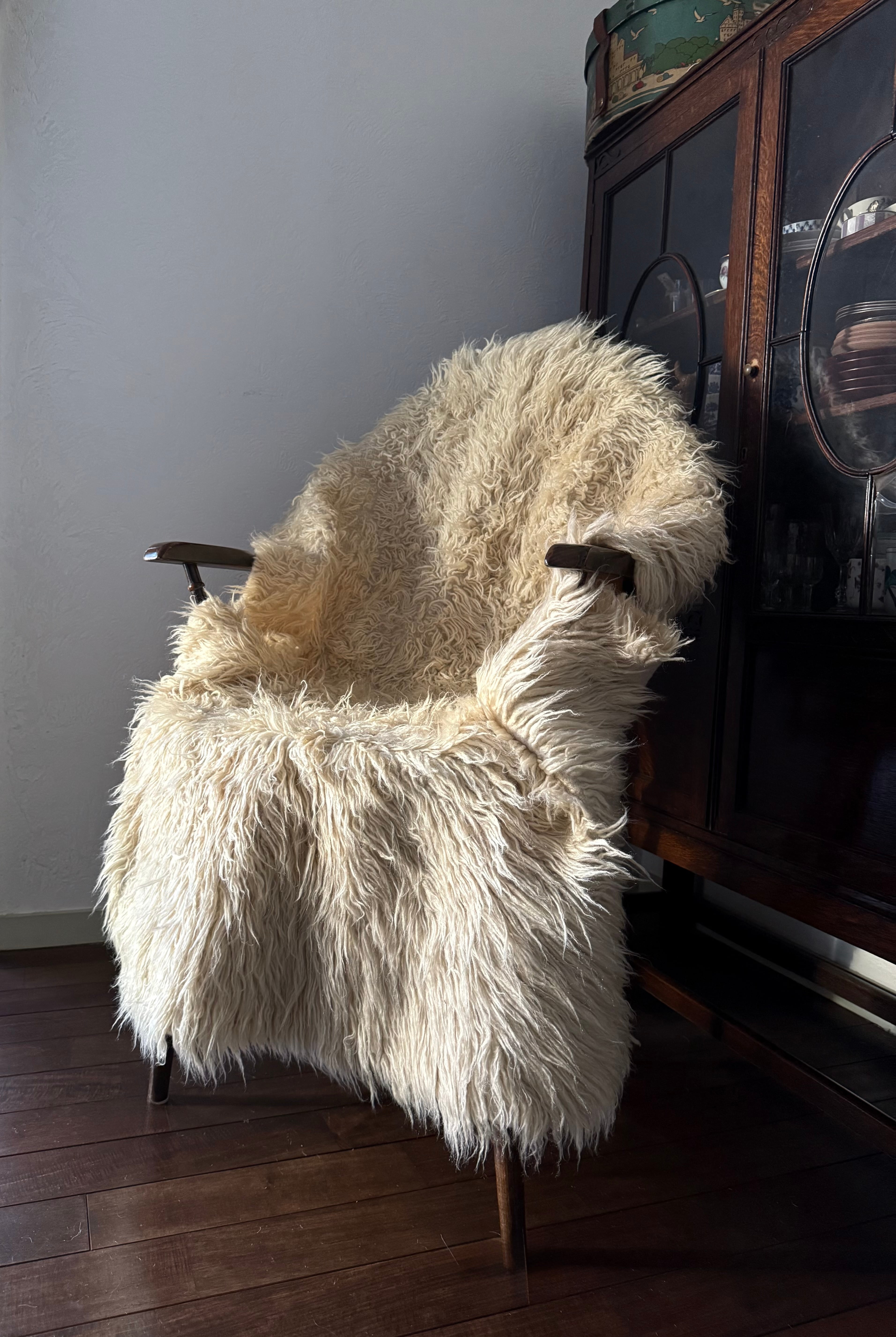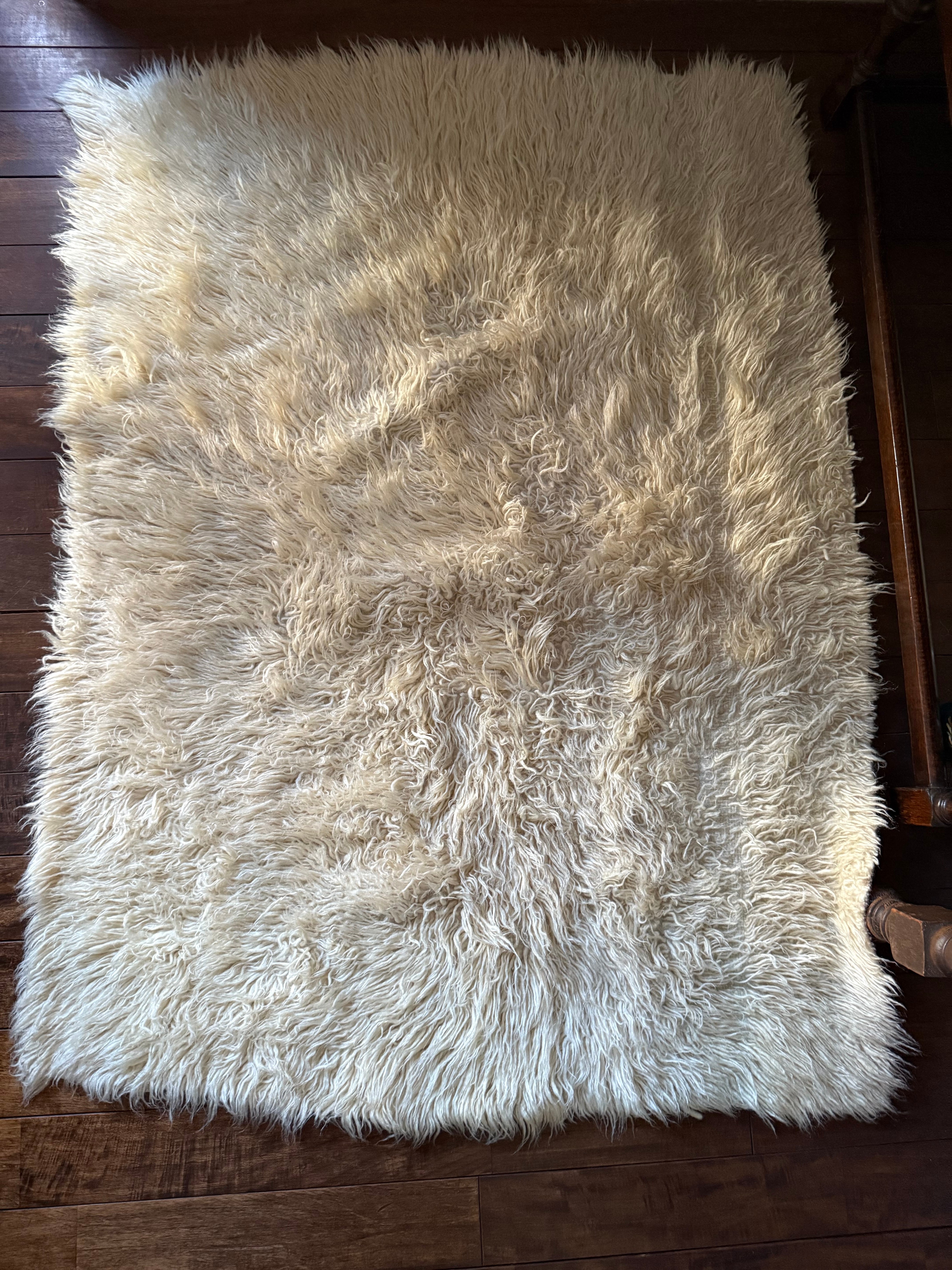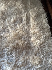 クリームがかったホワイトで、毛に艶があり、光にあたると艶やかに輝きます。