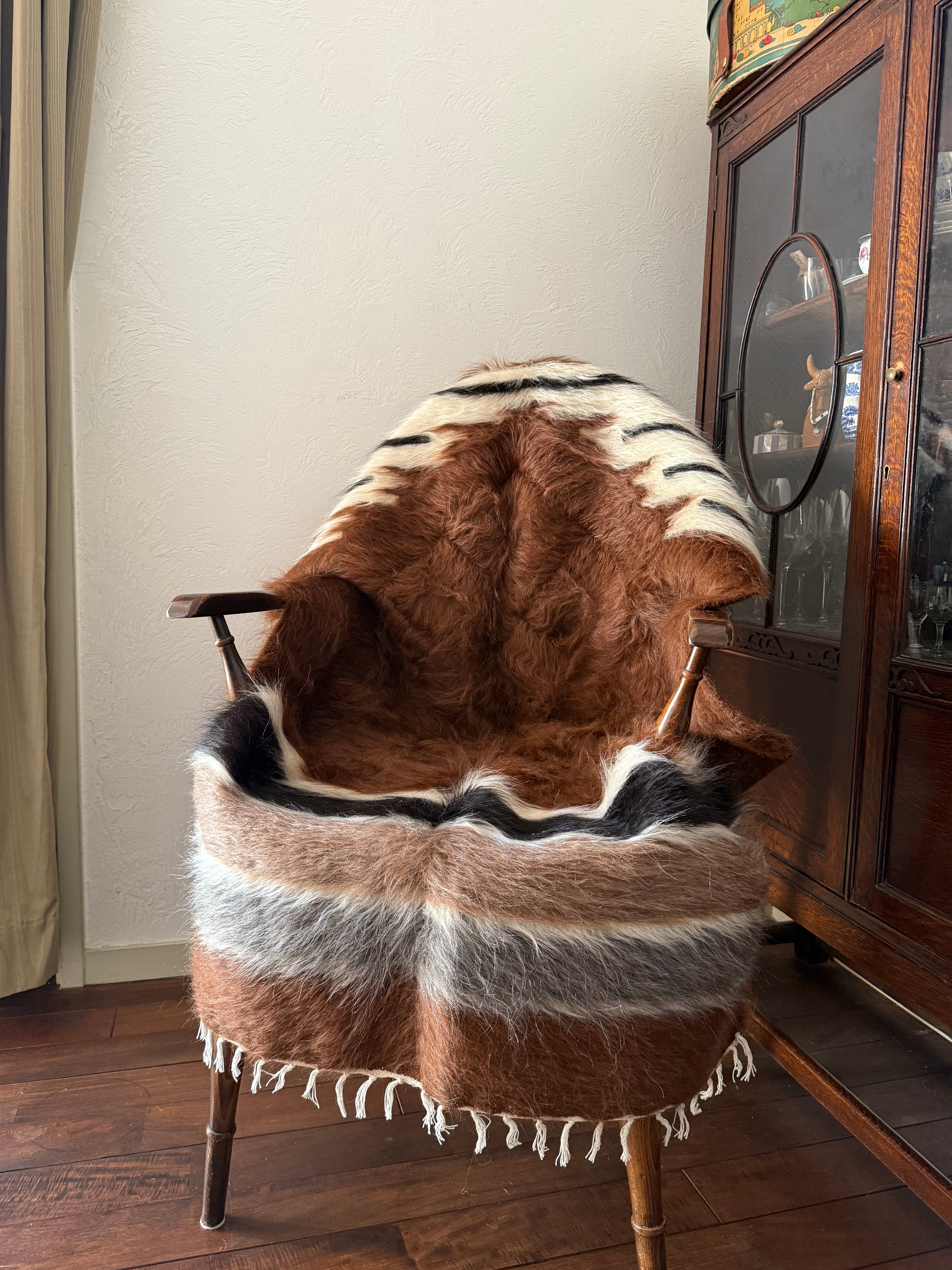 バッターニエは、アンゴラ山羊の毛で織られています。現代の私たちが慣れている羊毛やナイロン、コットンなどより、ツヤとハリがあり、薄着や肌着などで座ると、少しちくちく感を感じられる方がいらっしゃいます(特に裏側)。こちらは個人的にはあまり感じませんでしたが、感覚には個人差がありますので、ご理解の上ご購入ください。