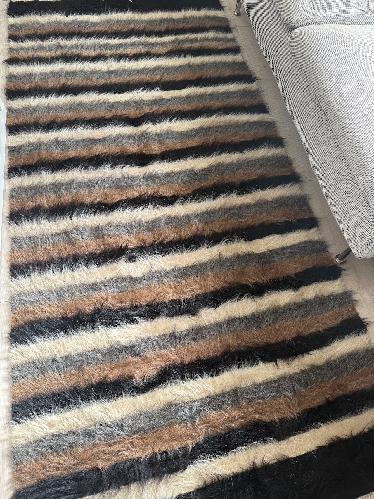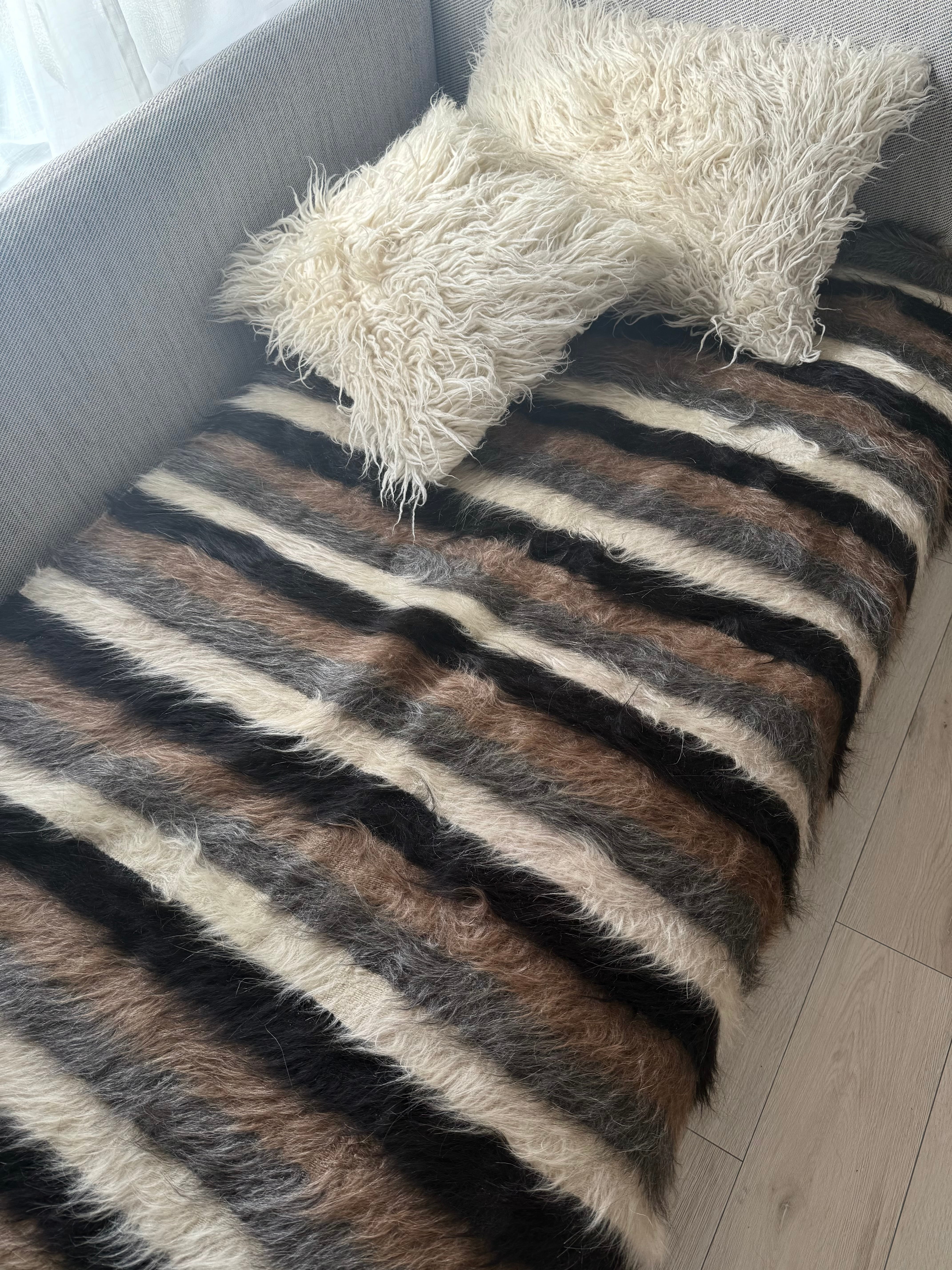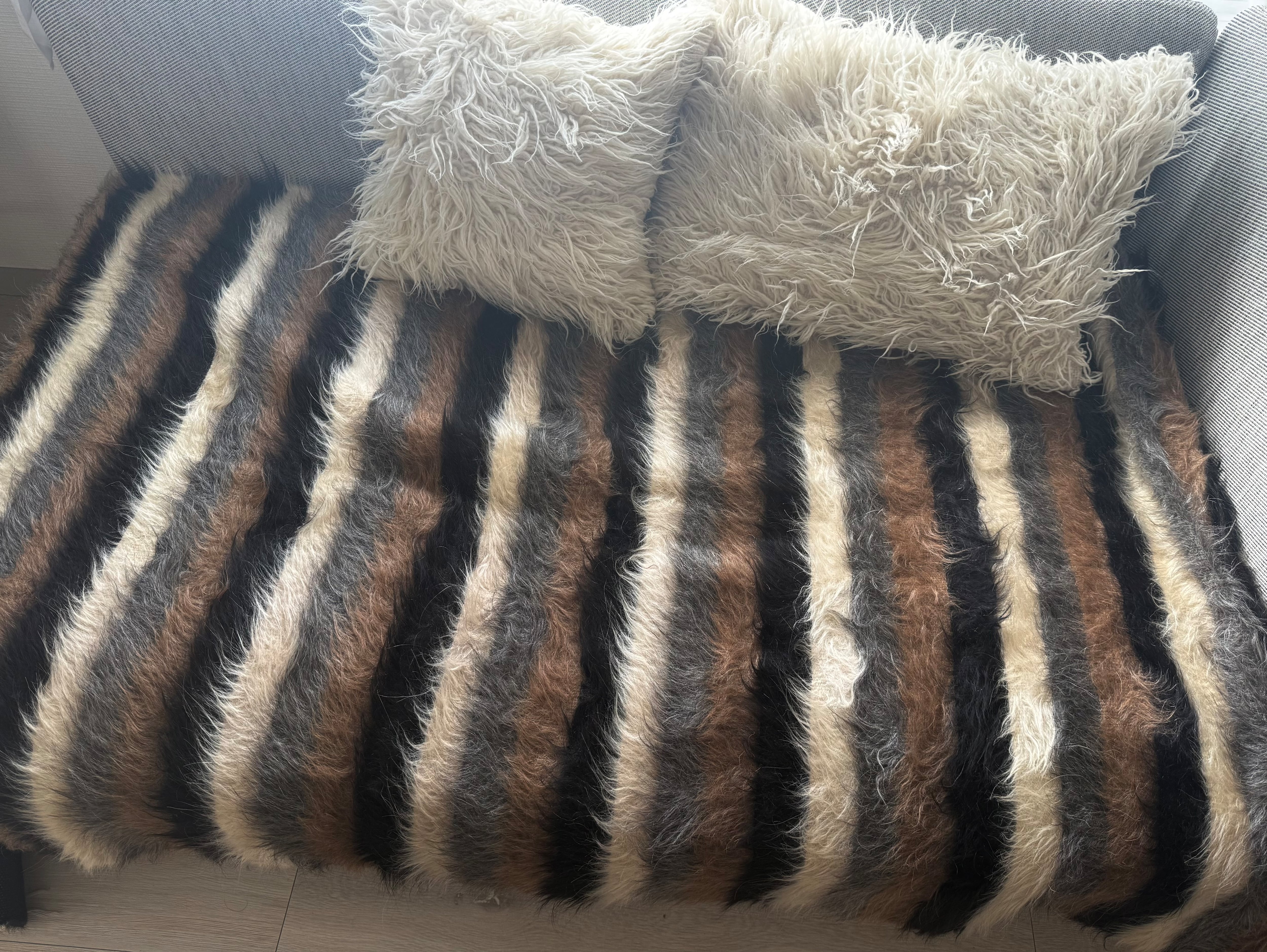 山羊の毛そのままの色を生かし、染めずに織られているバッターニエは、クリーム、黒、茶色、キャメル、グレーがメインの色合いです。