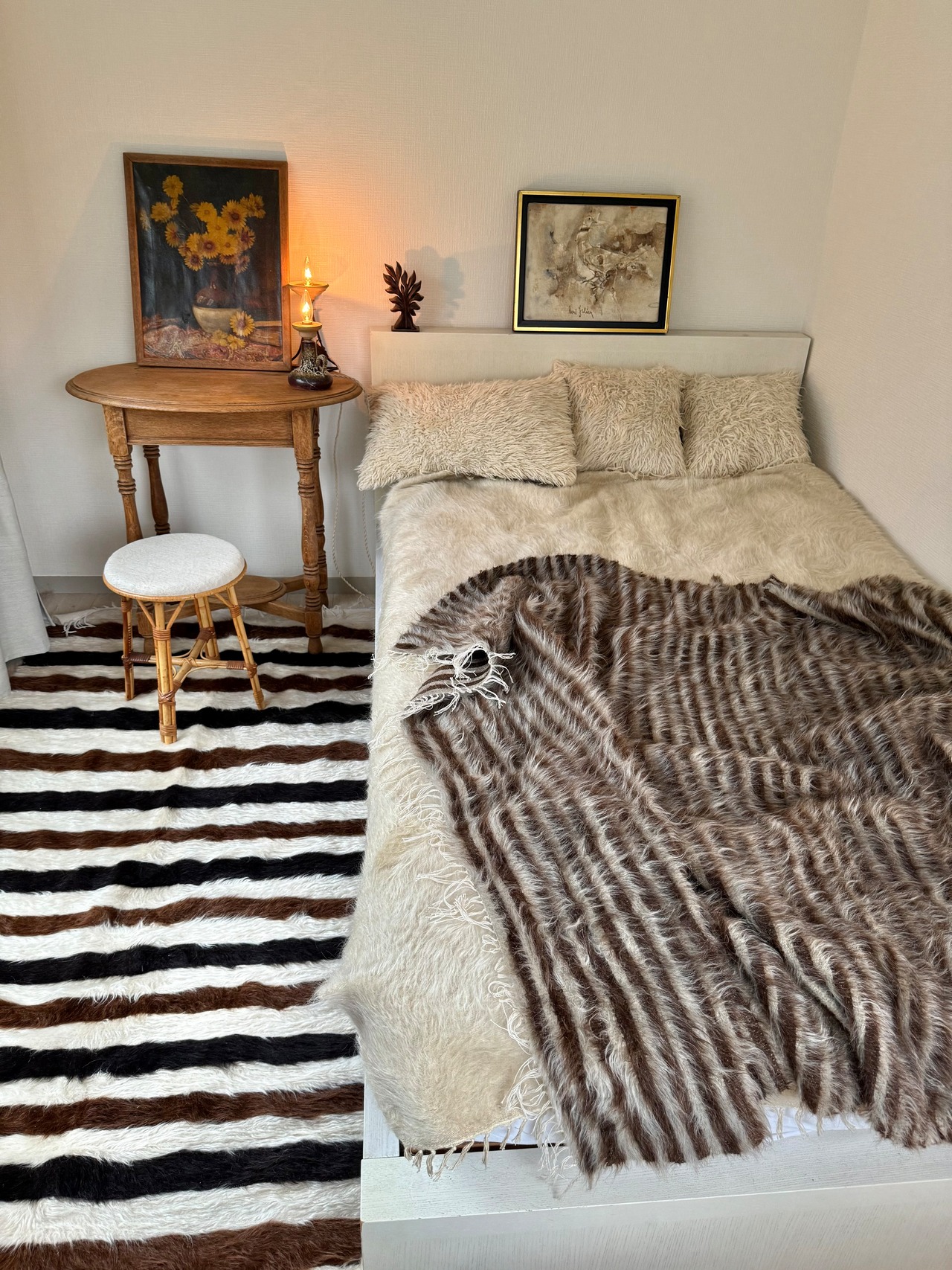 秋冬の少し厚めのコットンのスカートやチノパン、ジーンズなどでしたらほとんどの方が気にならないと思いますし、足元に敷かれたり、ベッドスローとしてベッドの端にかけたりしてもおしゃれです。