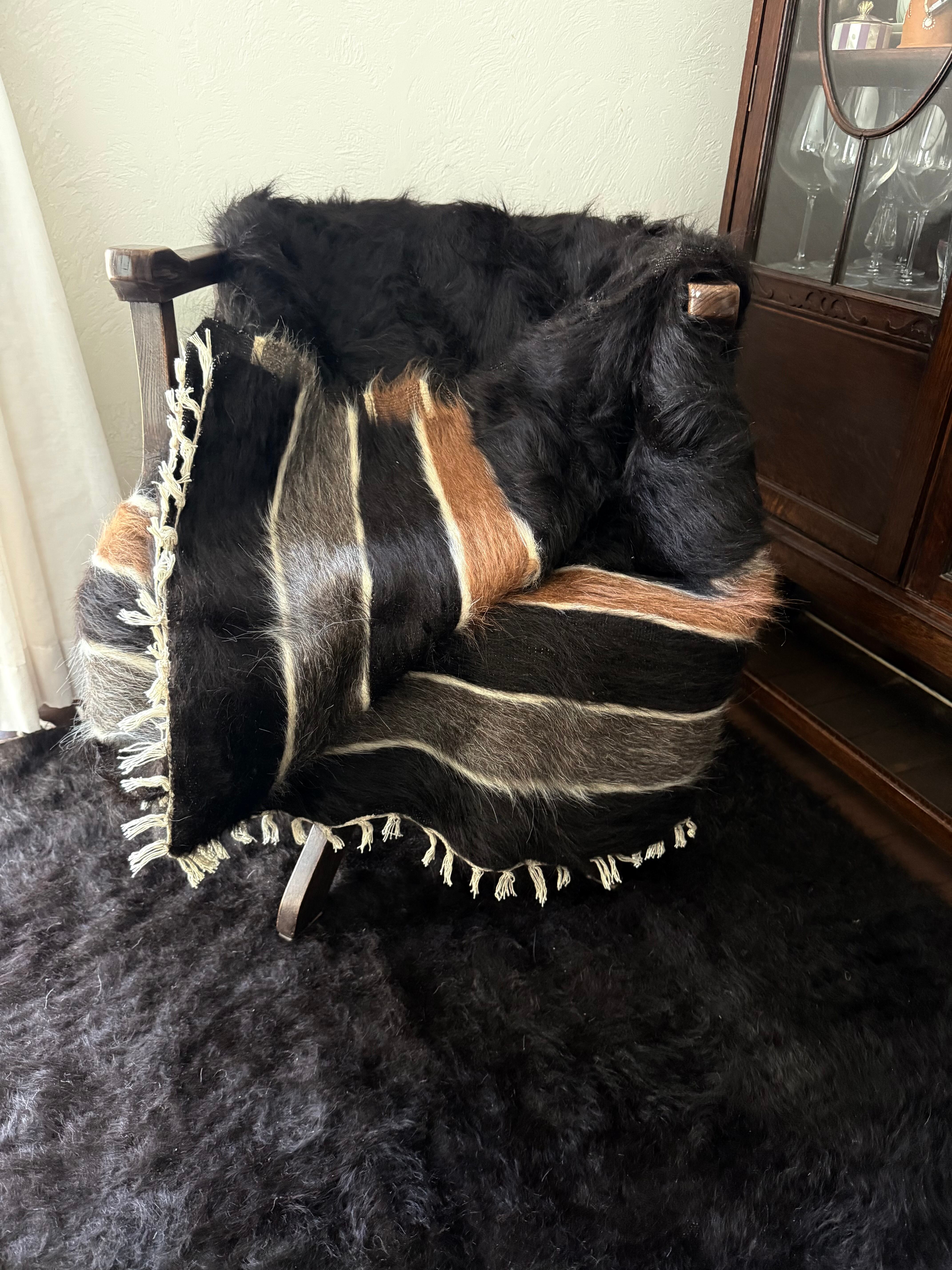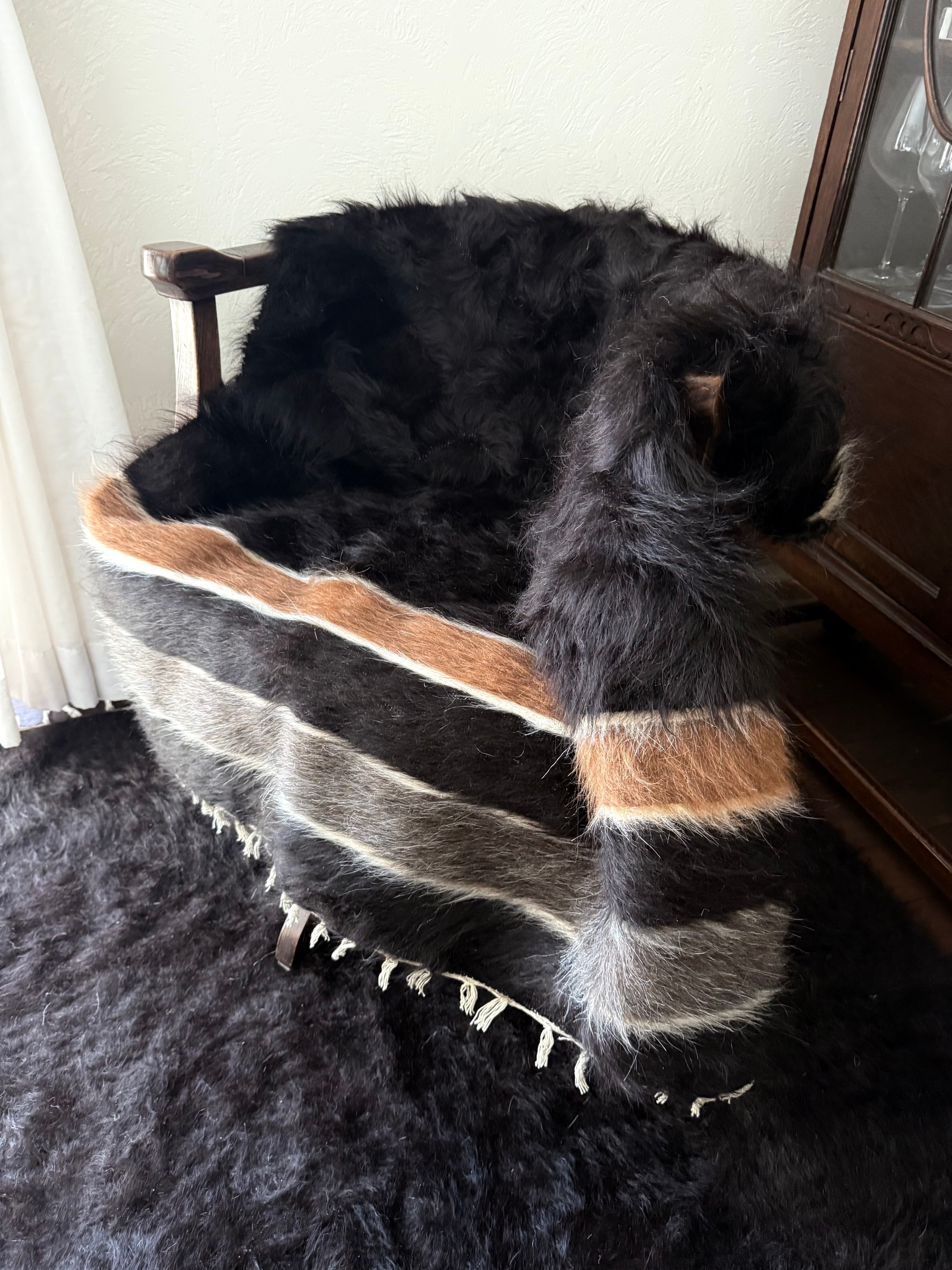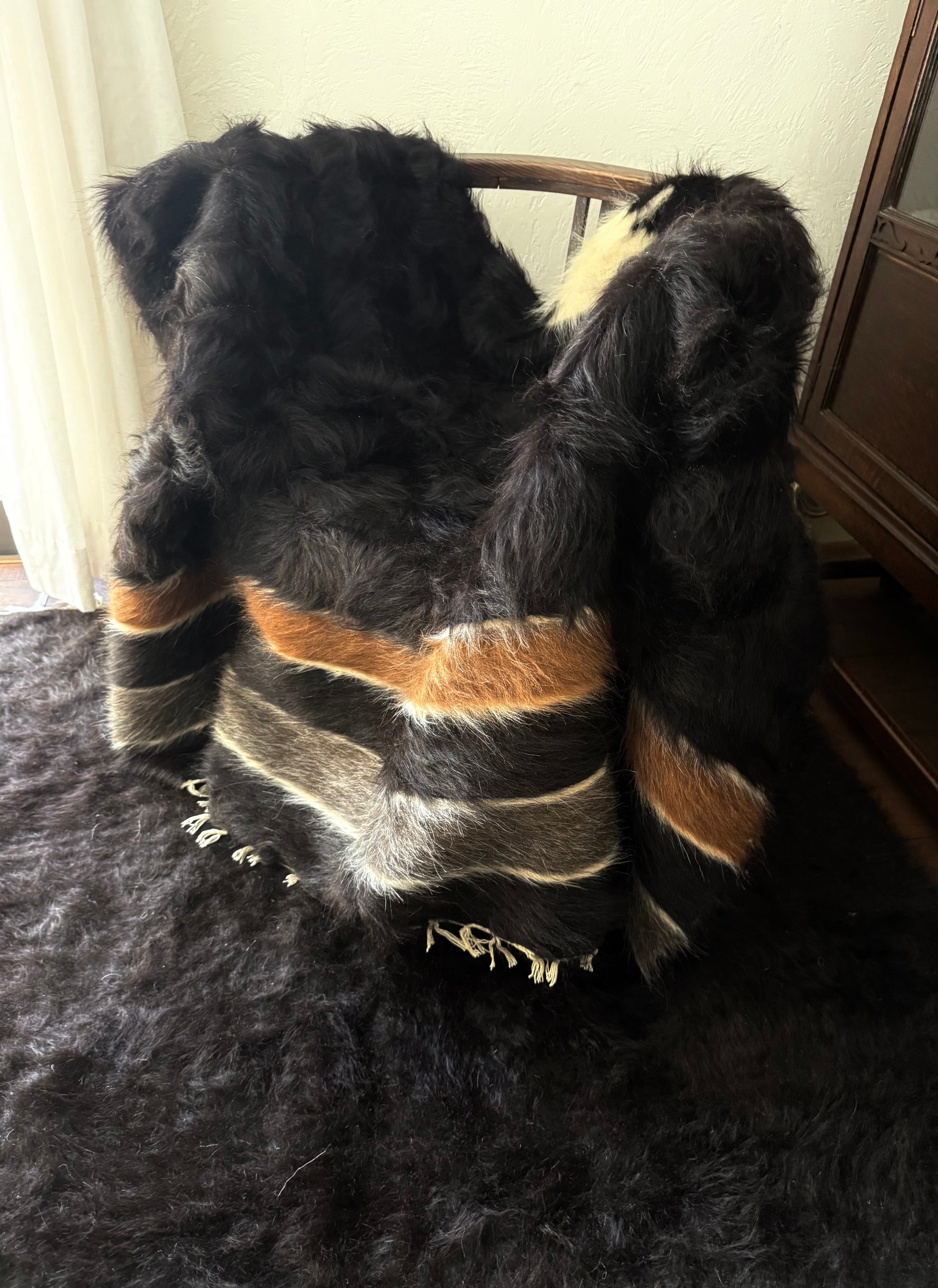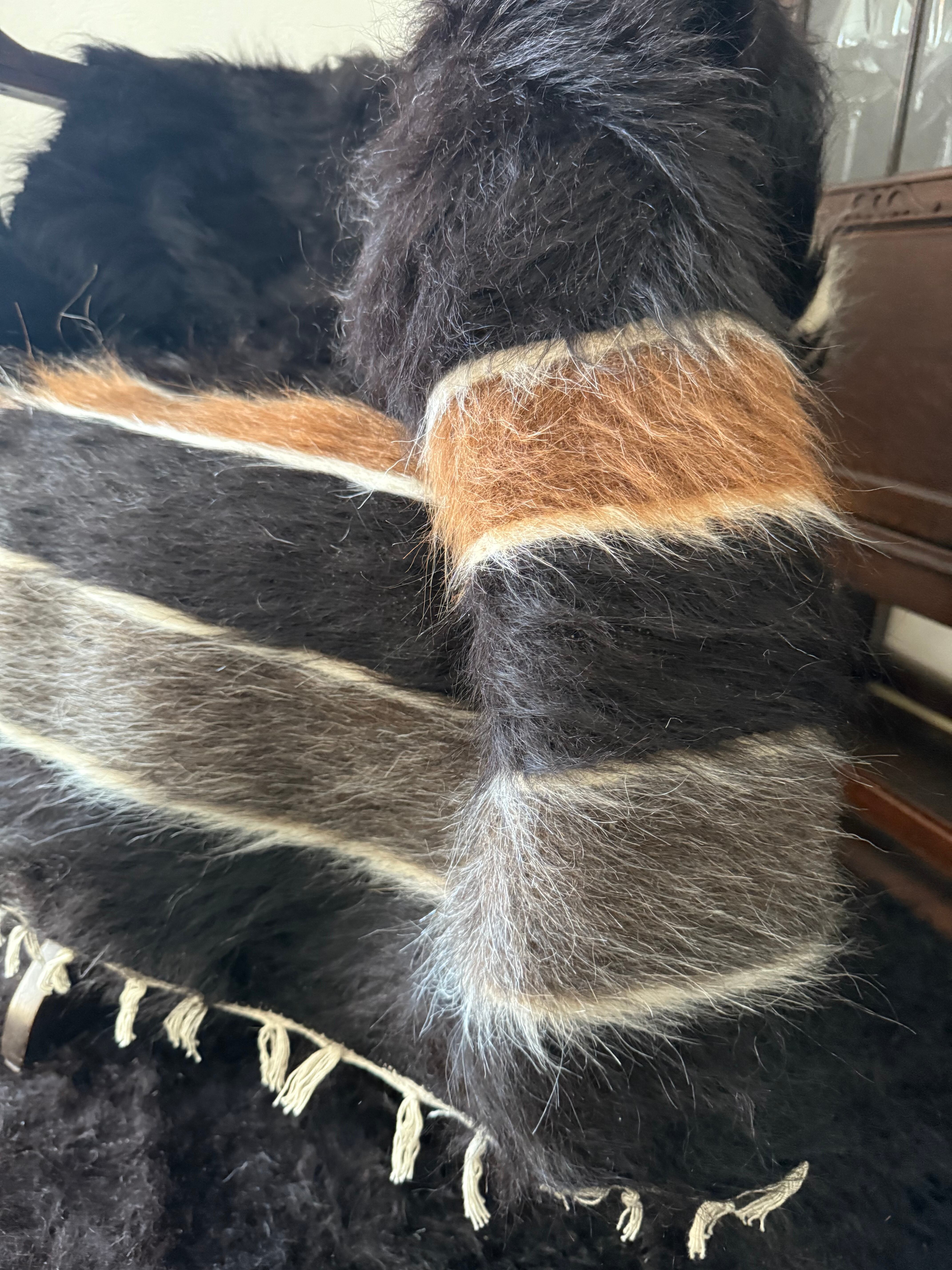 ブラックの毛は非常につややかで、ヴェルヴェッドのようです。中心の星は豊かな白い毛で、両端のラインには、こちらも艶のあるキャメルとグレーの毛が使われています。