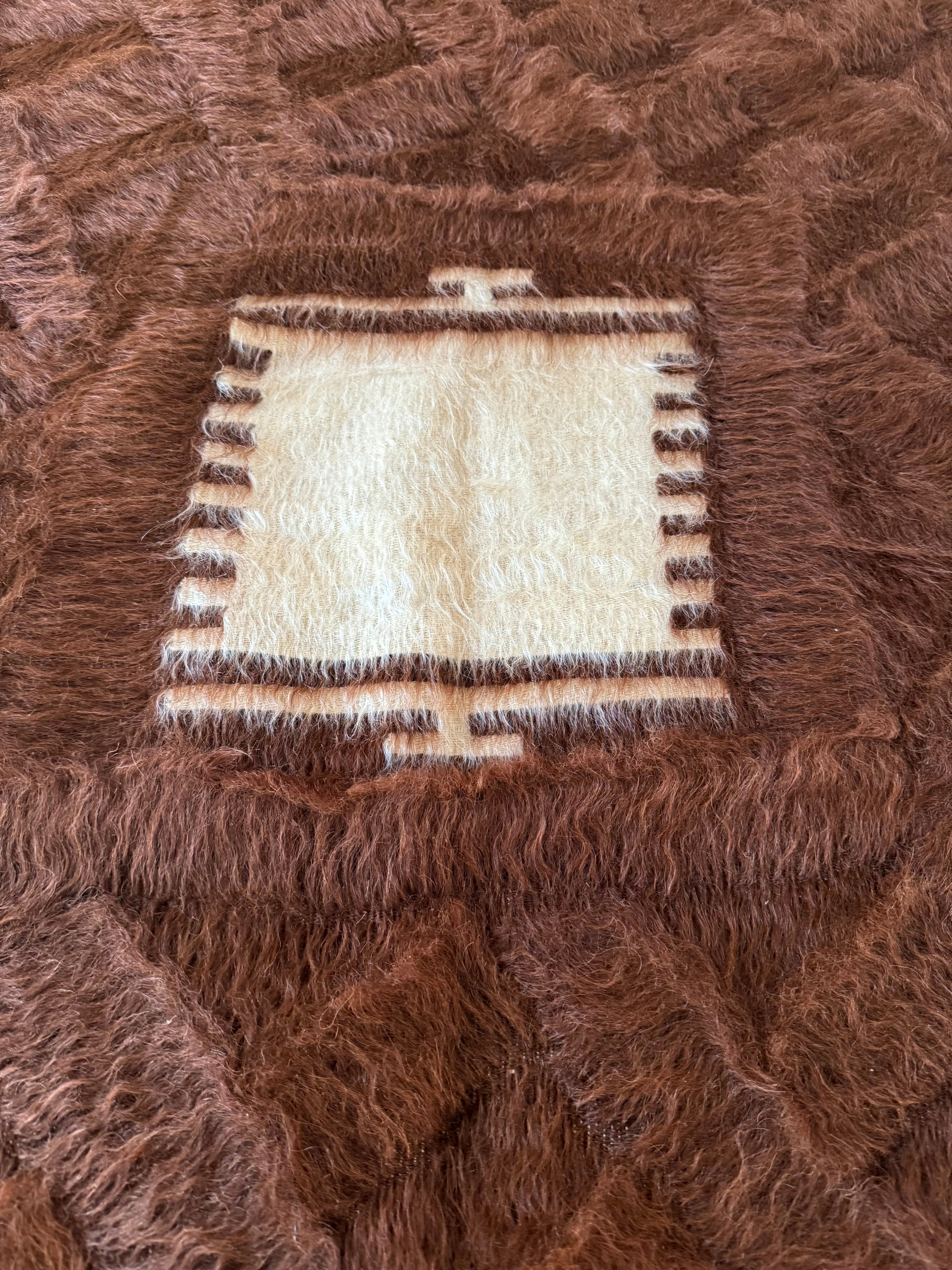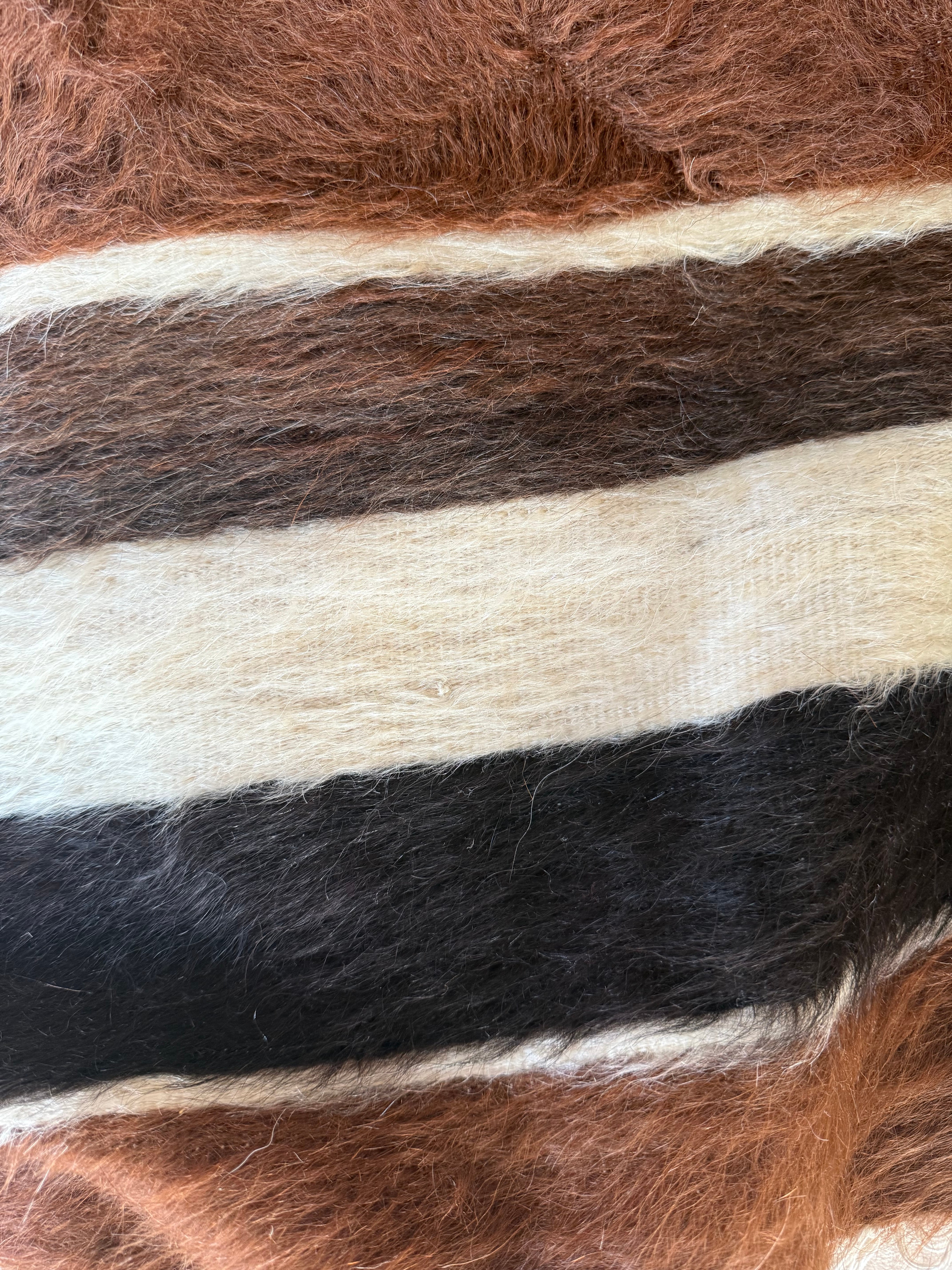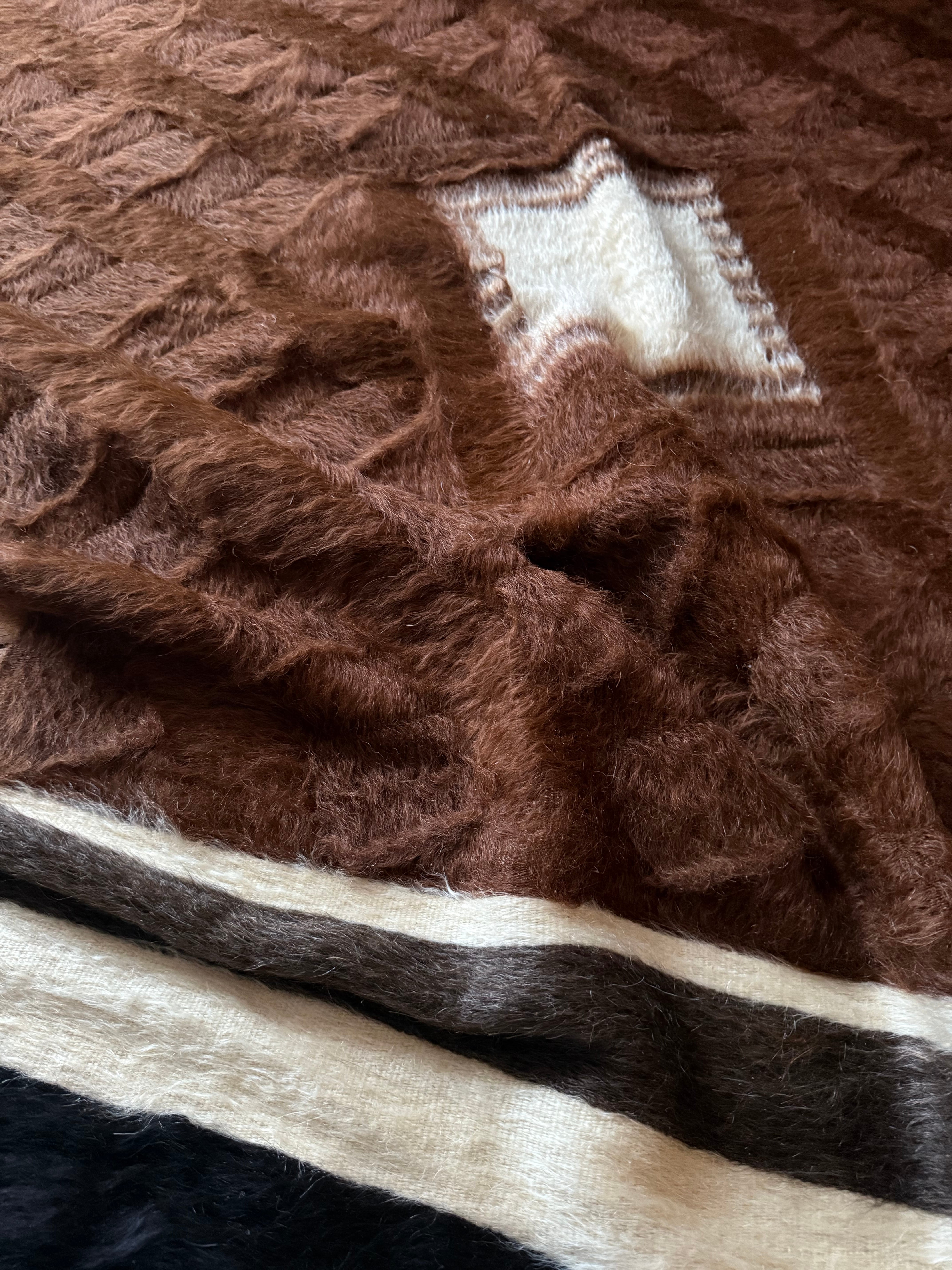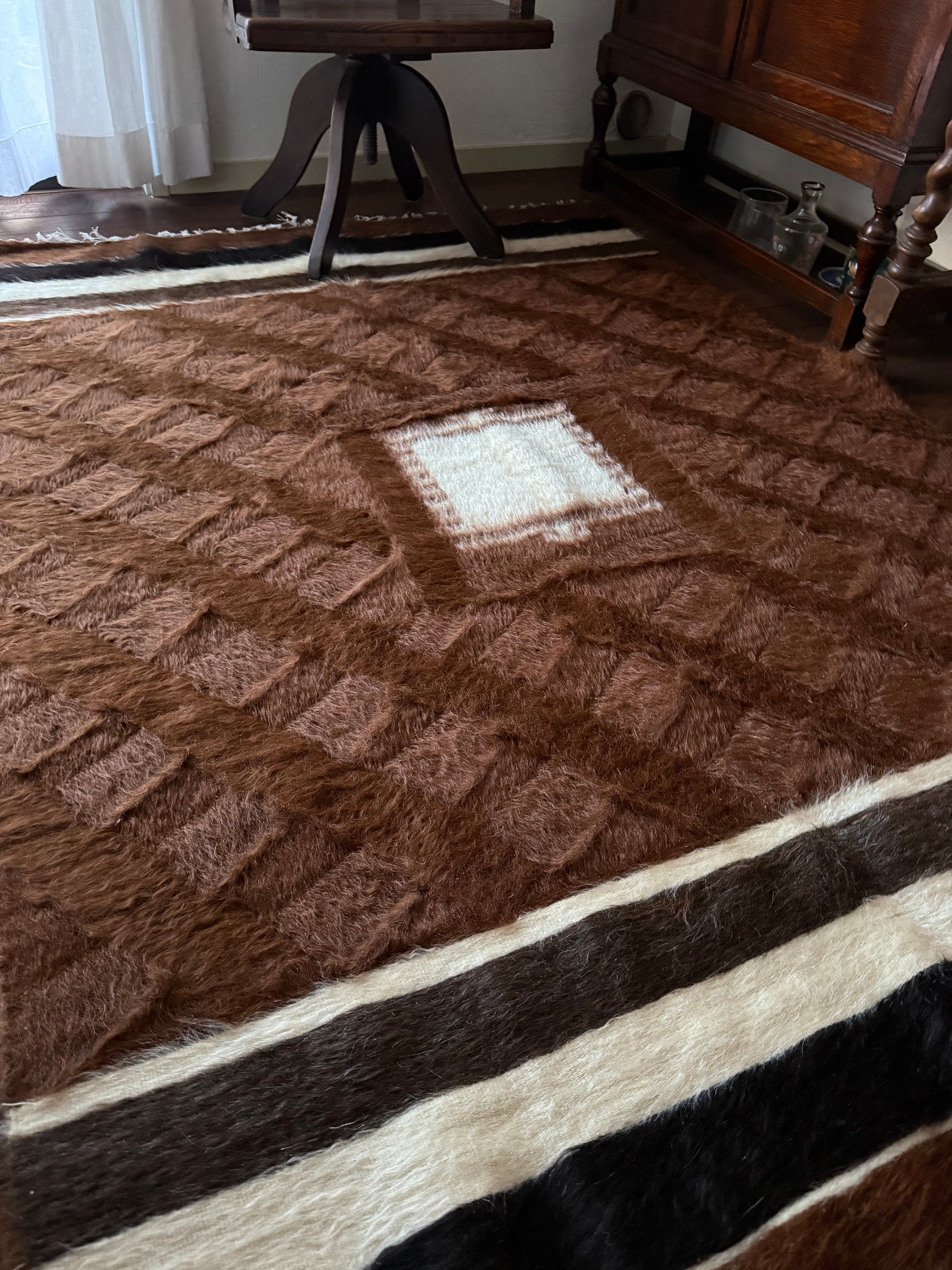 ブラウンの毛は非常につややかで、ふさふさの毛並みです。とても状態のいい1級品で、ダイヤ柄の織りもこの上なくはっきりと出ており、美しくダメージがみつからないものです。