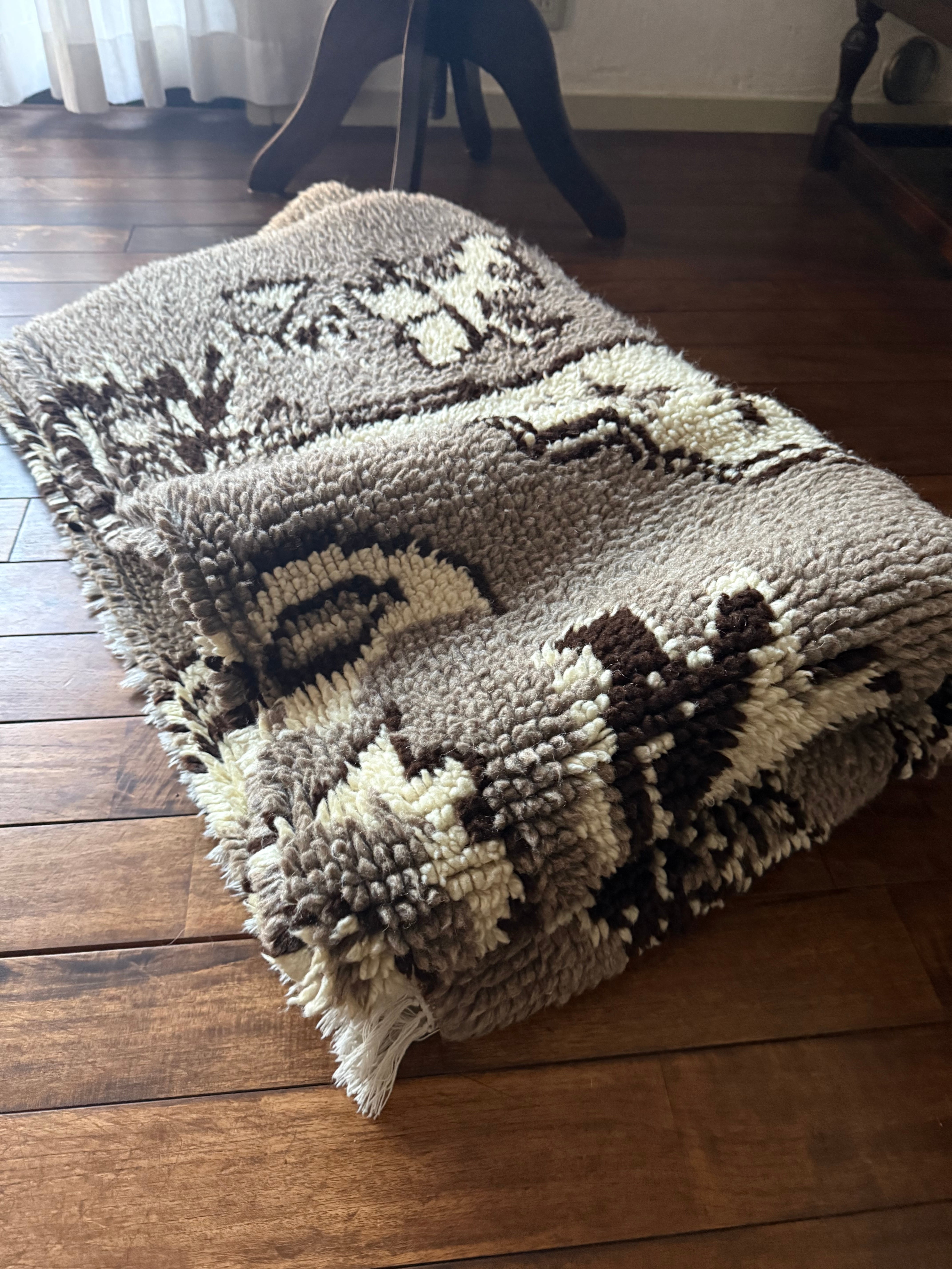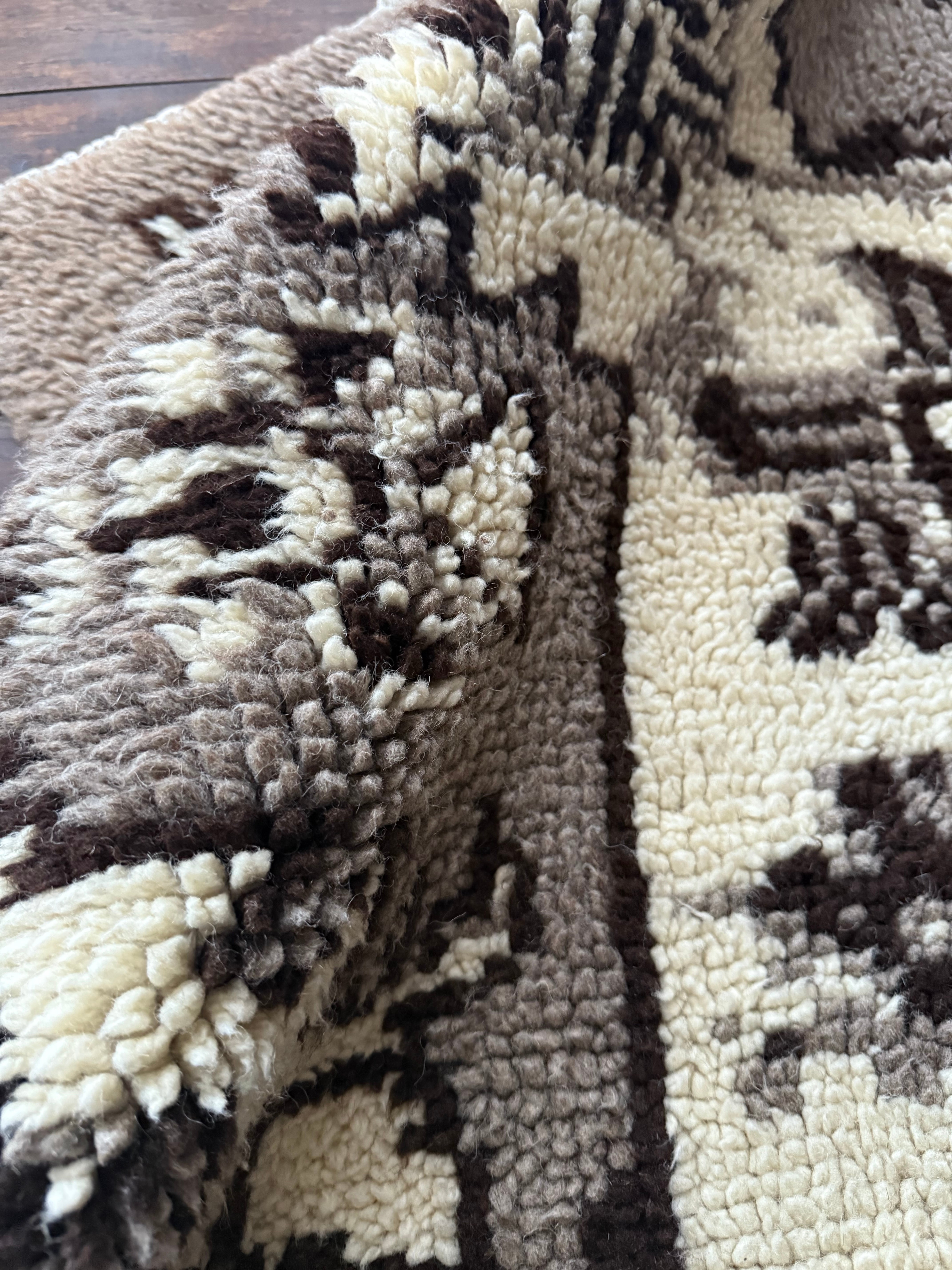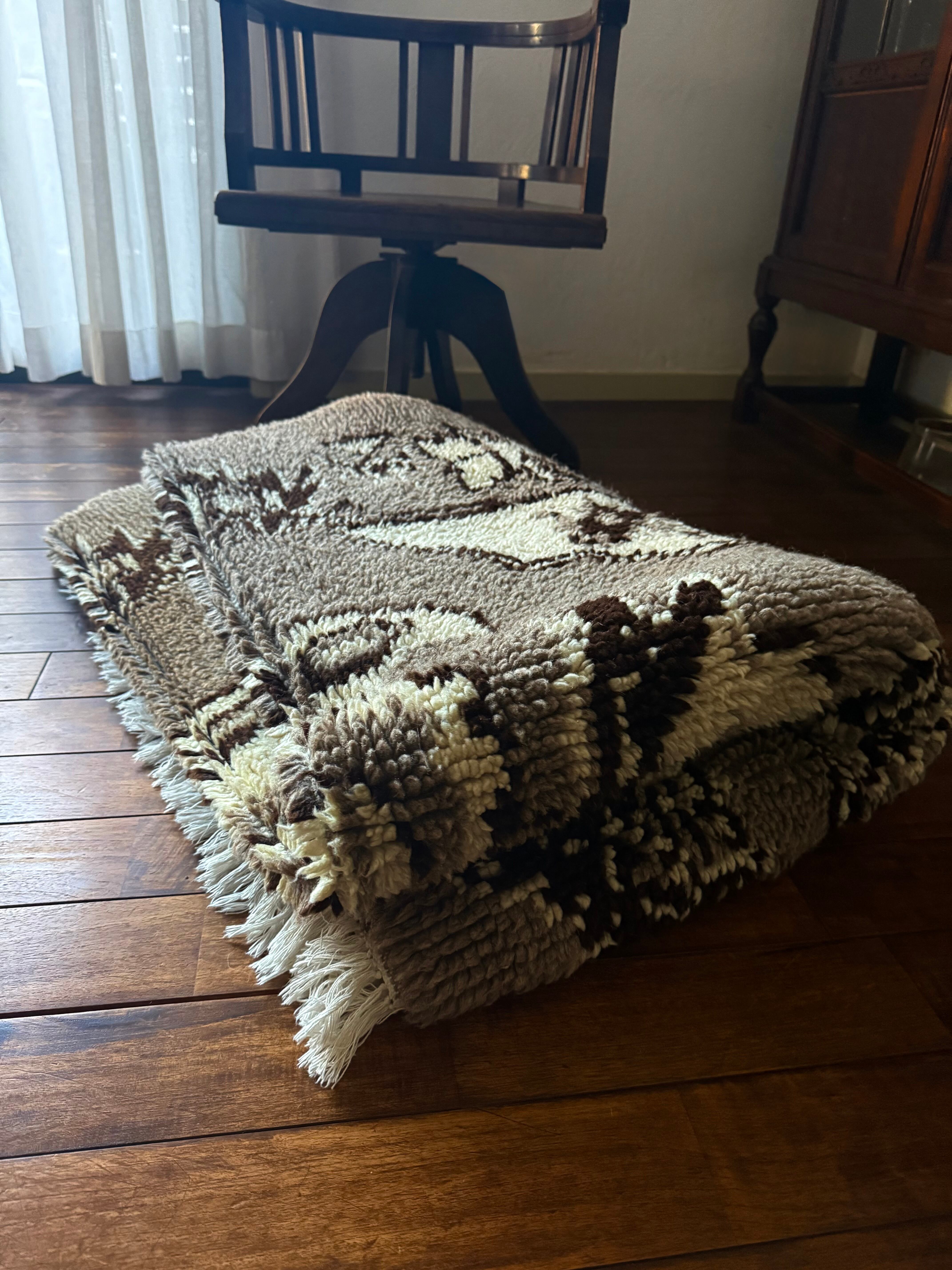 山岳地帯で暮らす遊牧民たちが自らの暮らしのために織ってきたもので、寒さを凌ぐためにこのように毛足が長い織物を作るようになったようです。