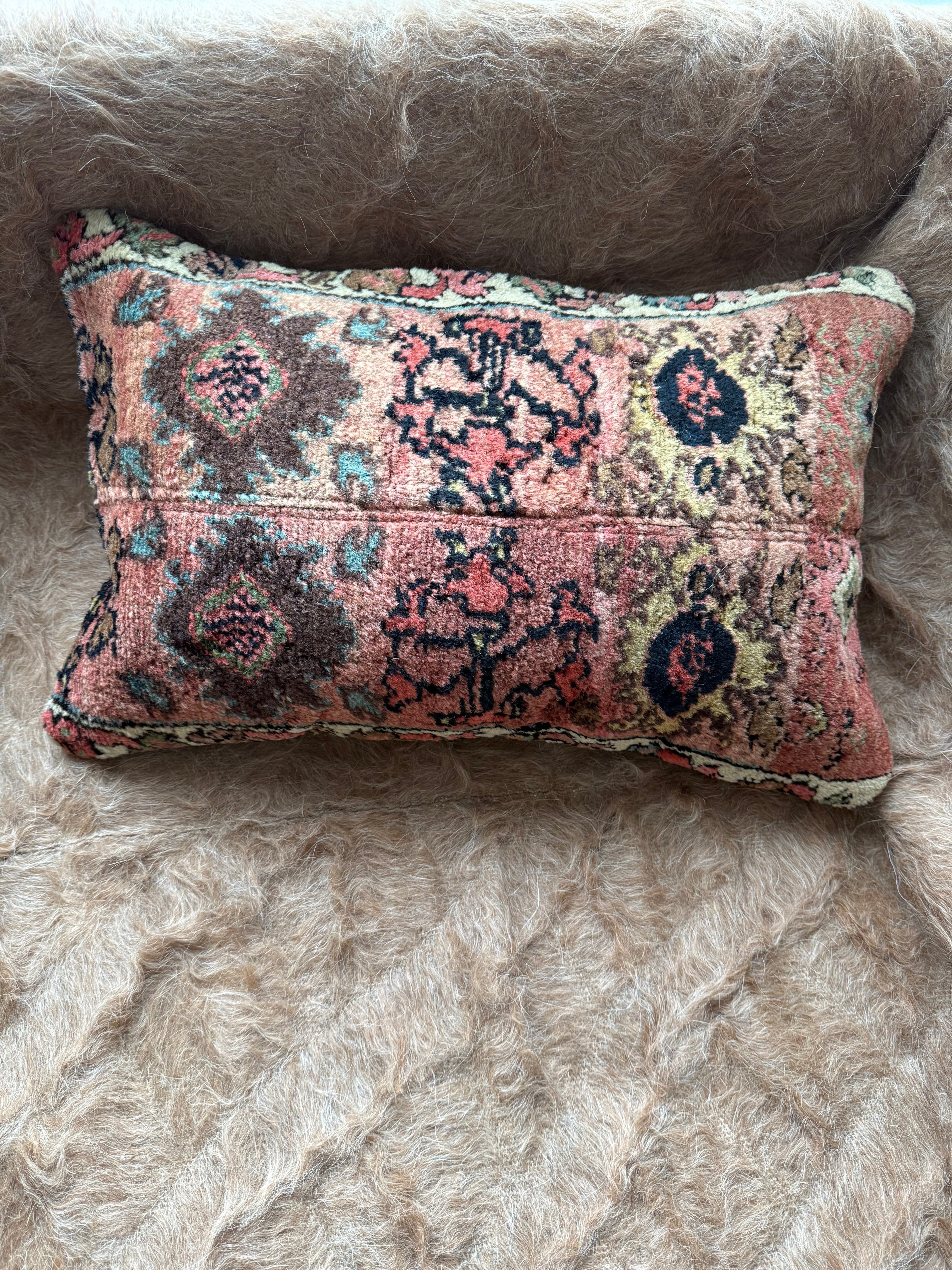 ラグの端の部分を中央で縫い合わせ、ほぼ毛が薄くなっていない豊かな部分を生かして作られています。