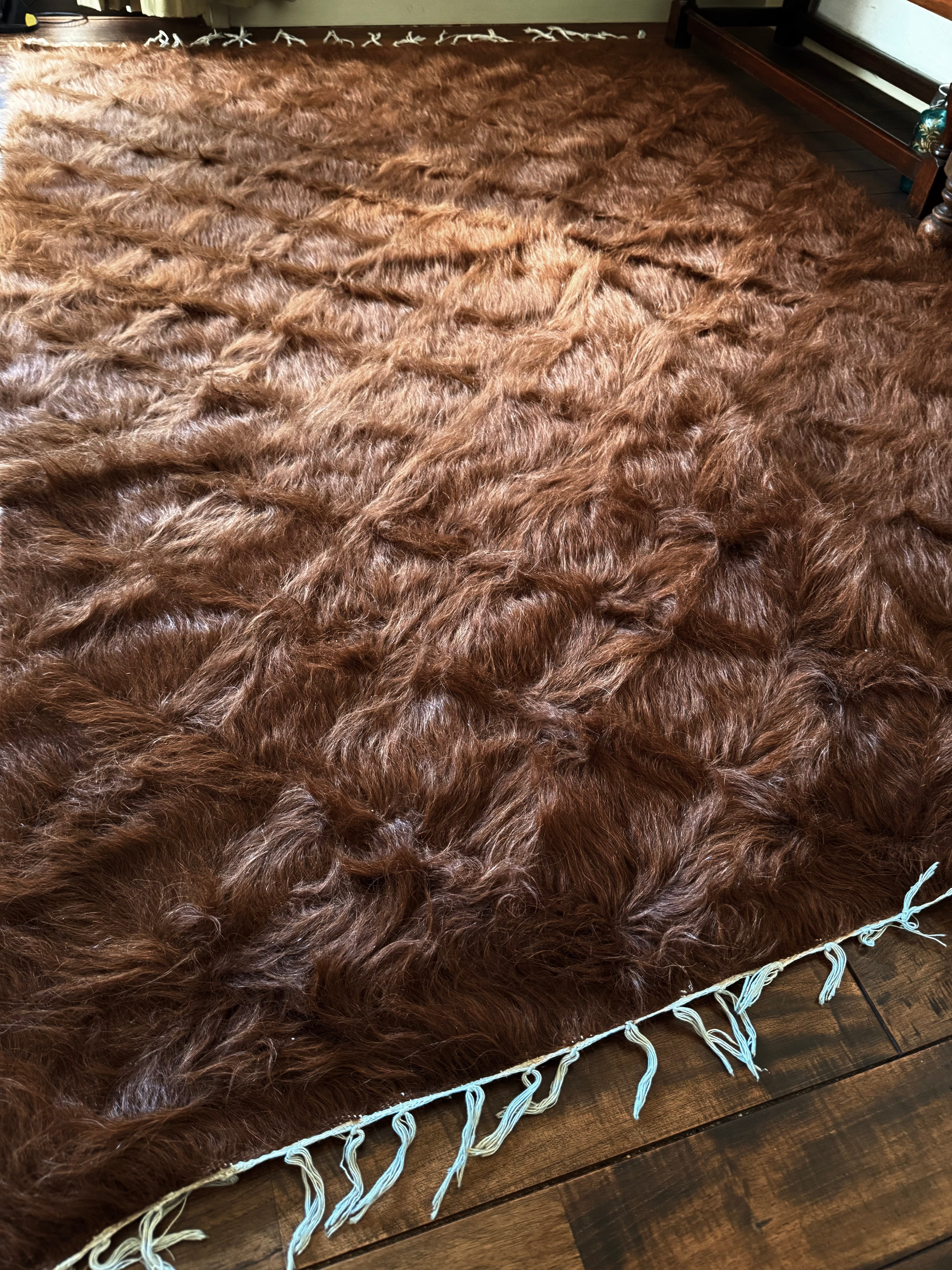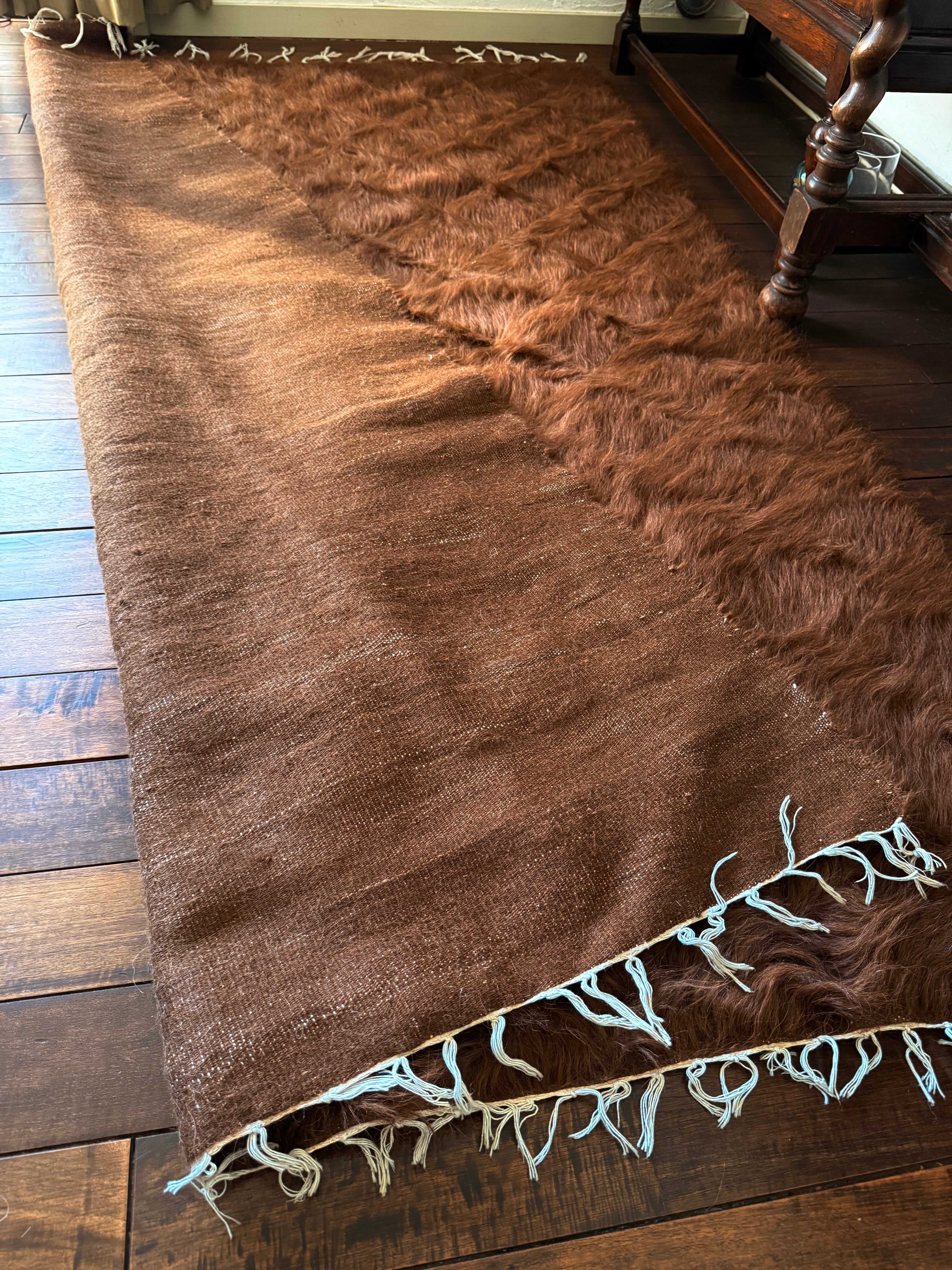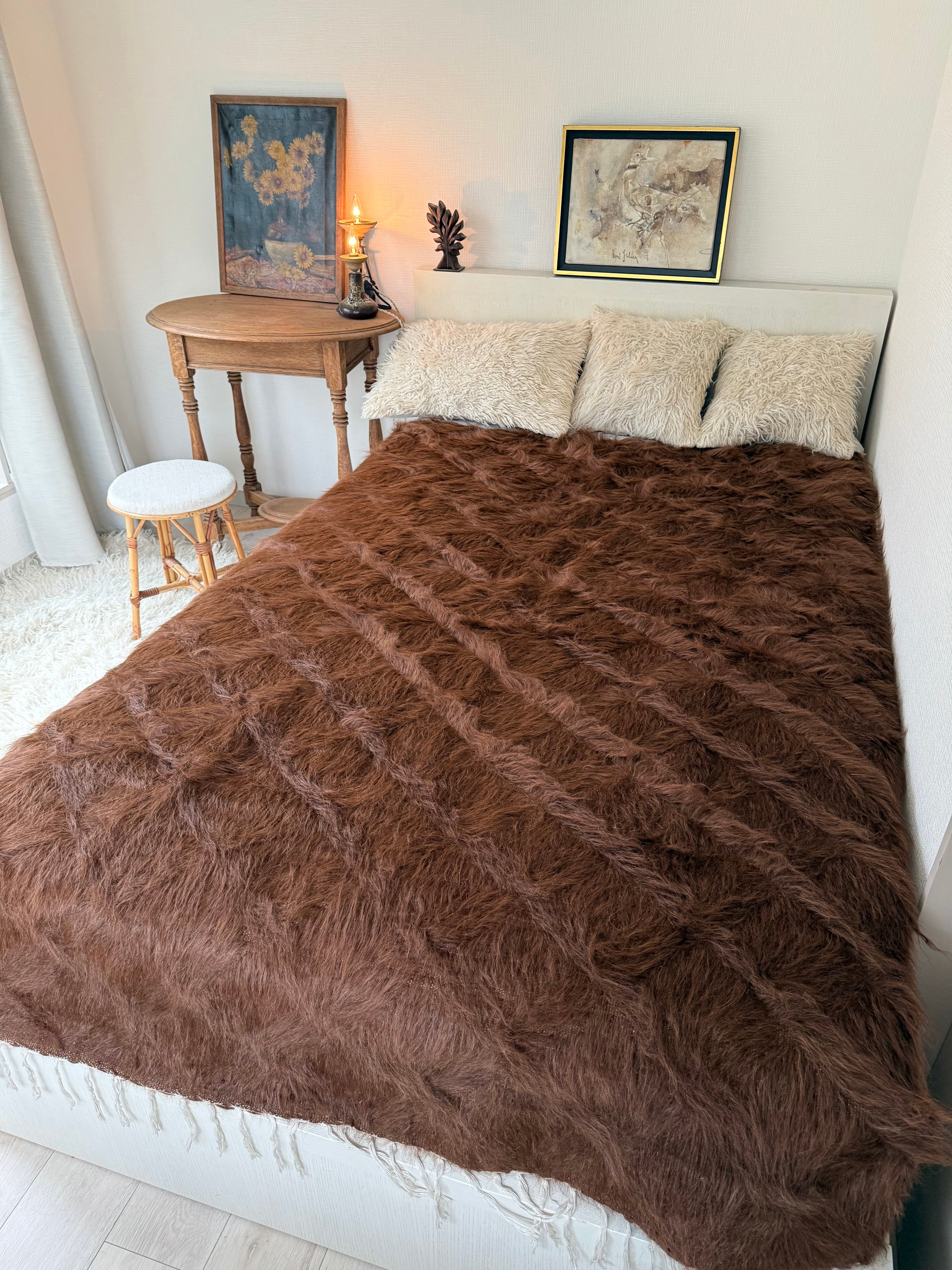 (アンゴラ山羊の毛は現代に私たちが慣れている羊毛やナイロンなどよりも、ツヤとはりがあります。だからこそ輝くのですが、肌着などで座られるとちくちくと感じる方もいらっしゃるかもしれません。普通のコットンのスカート、パンツ、チノパンなどや、秋冬の服で座られたらどなたでも気にならないと思います。もちろん足元に置かれる分にはさらさらとしてとても気持ちがいいと思います)