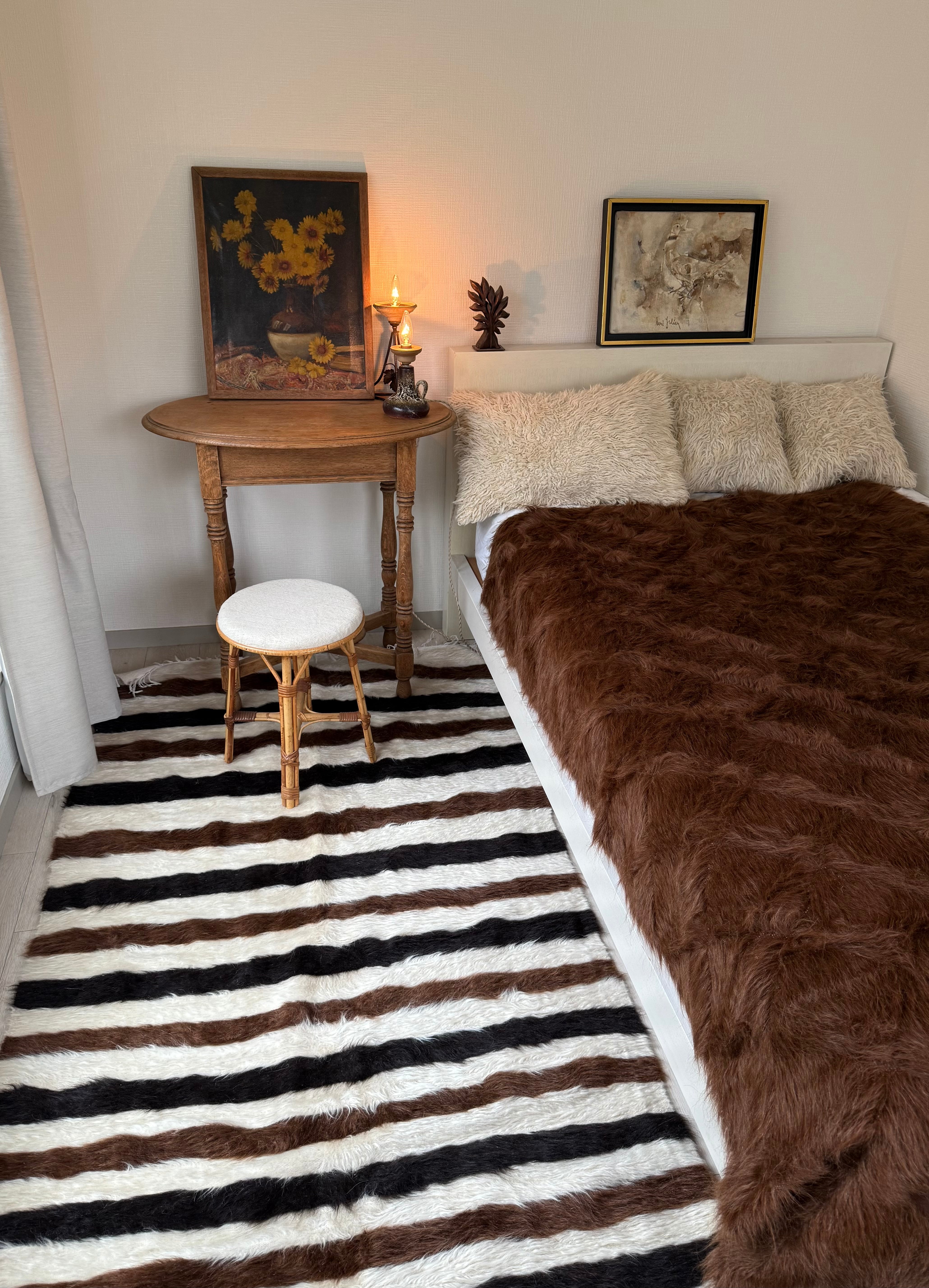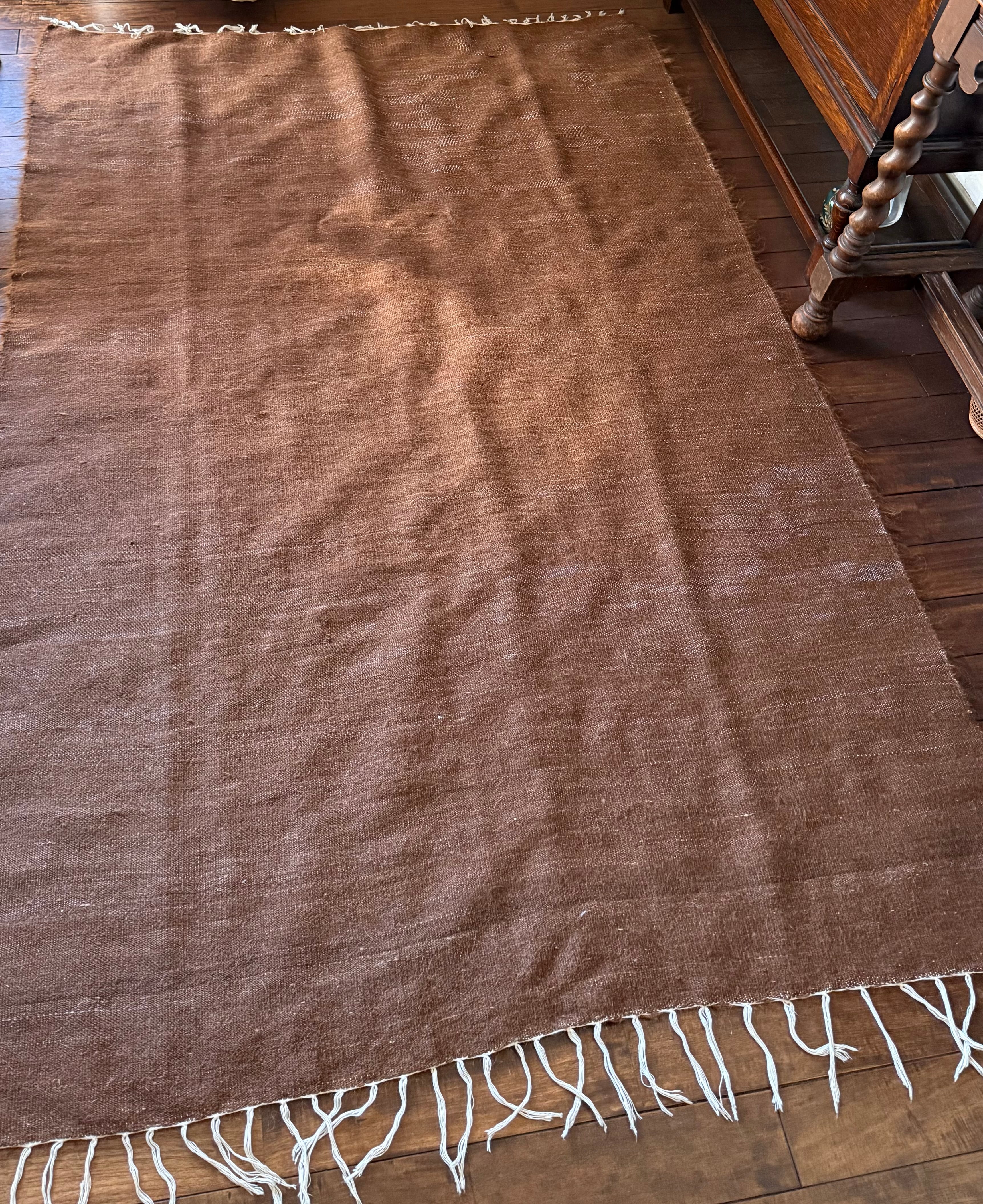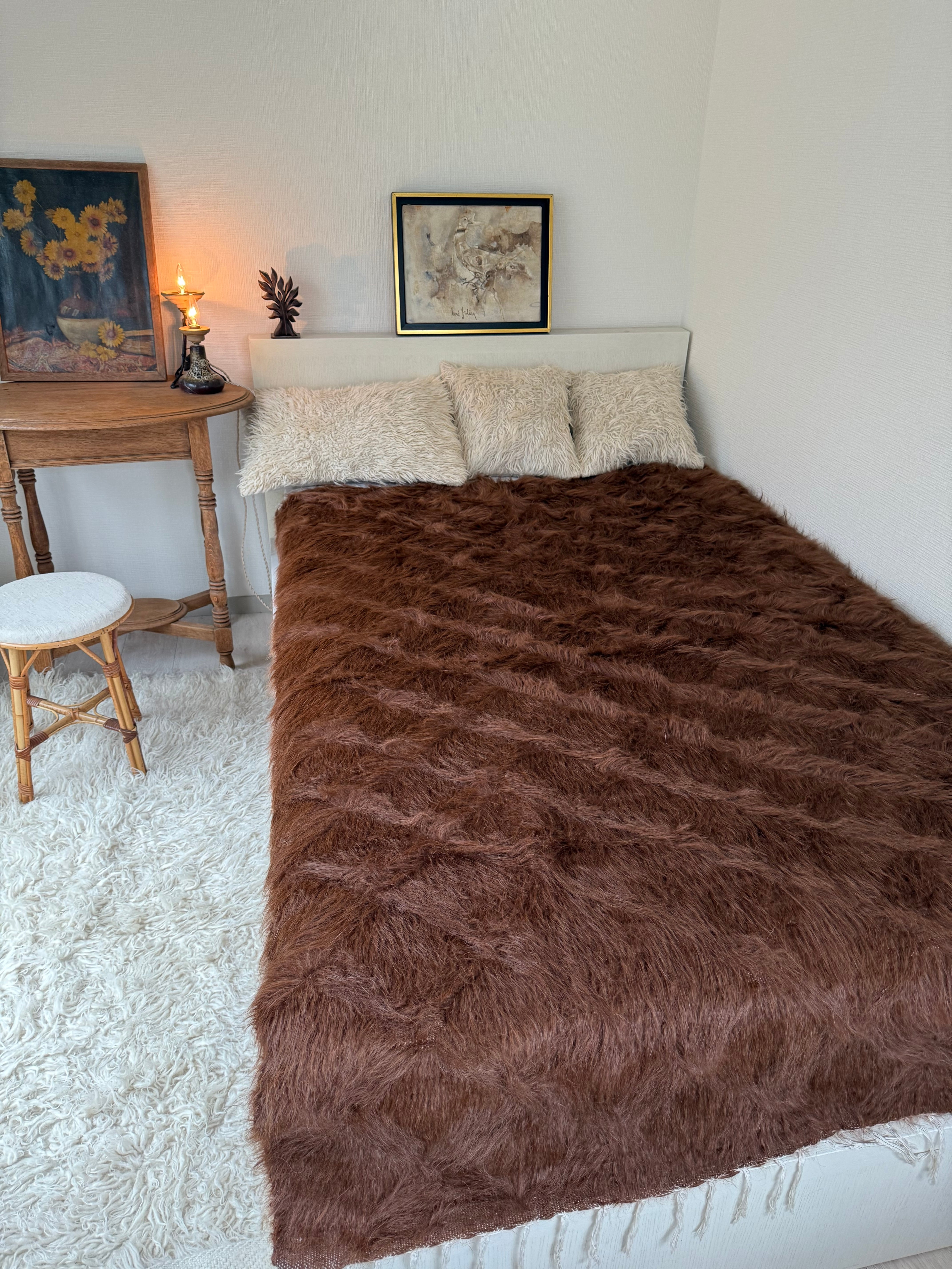 (アンゴラ山羊の毛は現代に私たちが慣れている羊毛やナイロンなどよりも、ツヤとはりがあります。だからこそ輝くのですが、肌着などで座られるとちくちくと感じる方もいらっしゃるかもしれません。普通のコットンのスカート、パンツ、チノパンなどや、秋冬の服で座られたらどなたでも気にならないと思います。もちろん足元に置かれる分にはさらさらとしてとても気持ちがいいと思います)