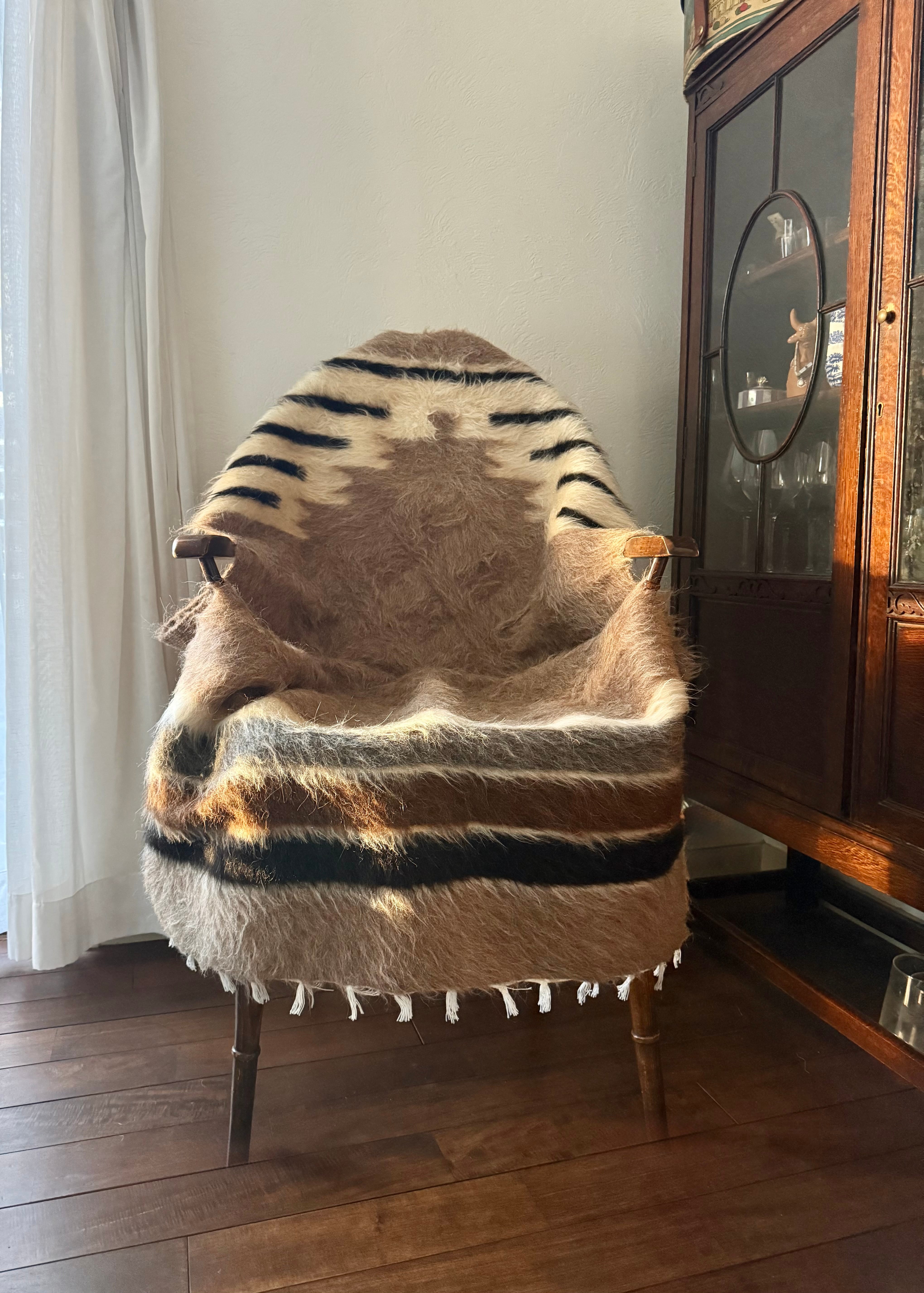 バッターニエは、アンゴラ山羊の毛で織られています。羊やウサギの毛などより、ツヤとハリがあり、夏の薄着や肌着で座ると、ほんの少しちくちく感を感じるかもしれません。(個人的にはこちらはあまり感じませんでした)