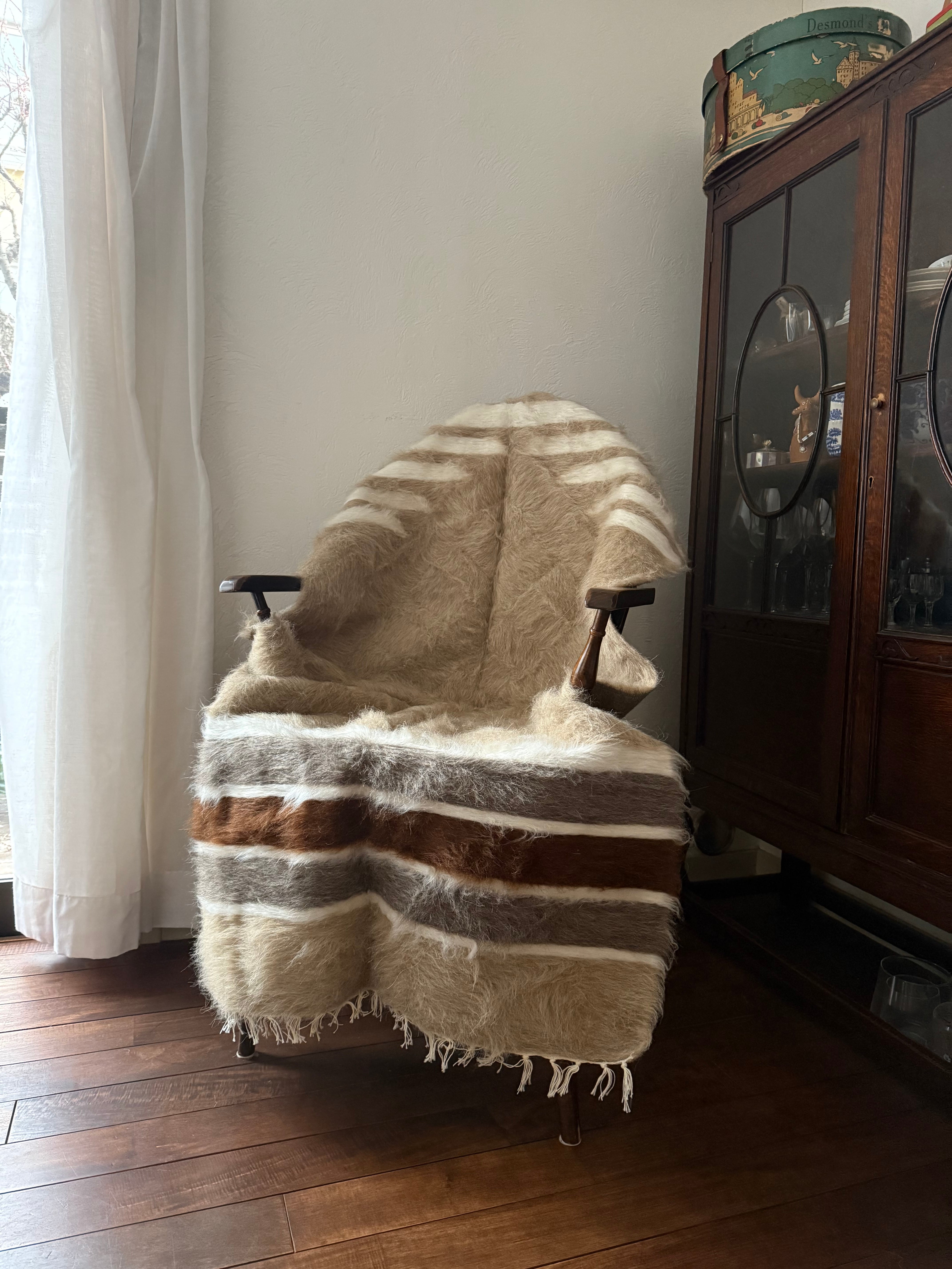 バッターニエは、アンゴラ山羊の毛で織られています。羊やウサギの毛などより、ツヤとハリがあり、夏の薄着や肌着で座ると、ほんの少しちくちく感を感じるかもしれません。