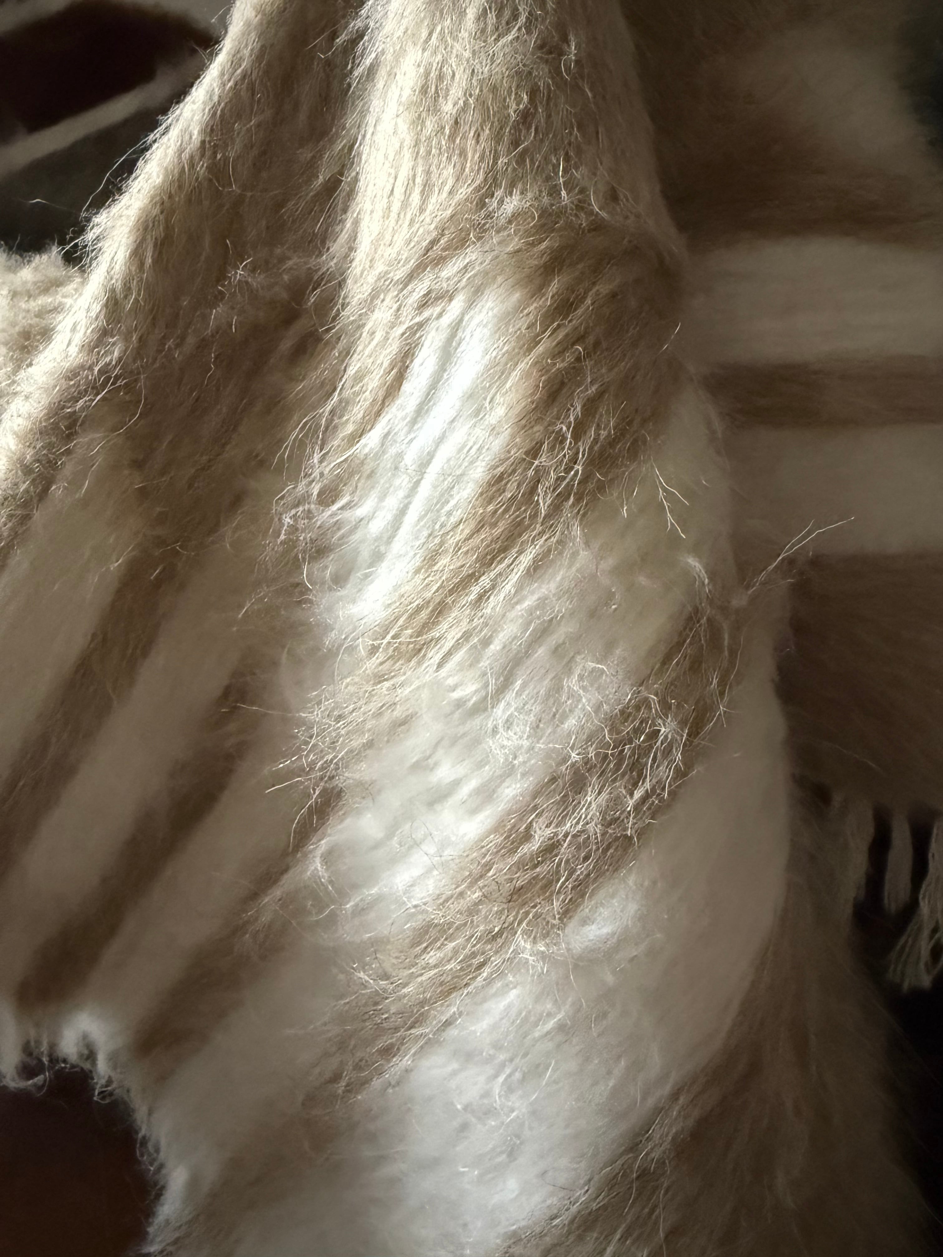 毛質も繊細で細くふわふわとした巻毛のものから、太めでしっかりとしたものまで一頭ずつ違うので、1枚1枚どんな毛を使っているかでモヘアの個性が変わってきます。