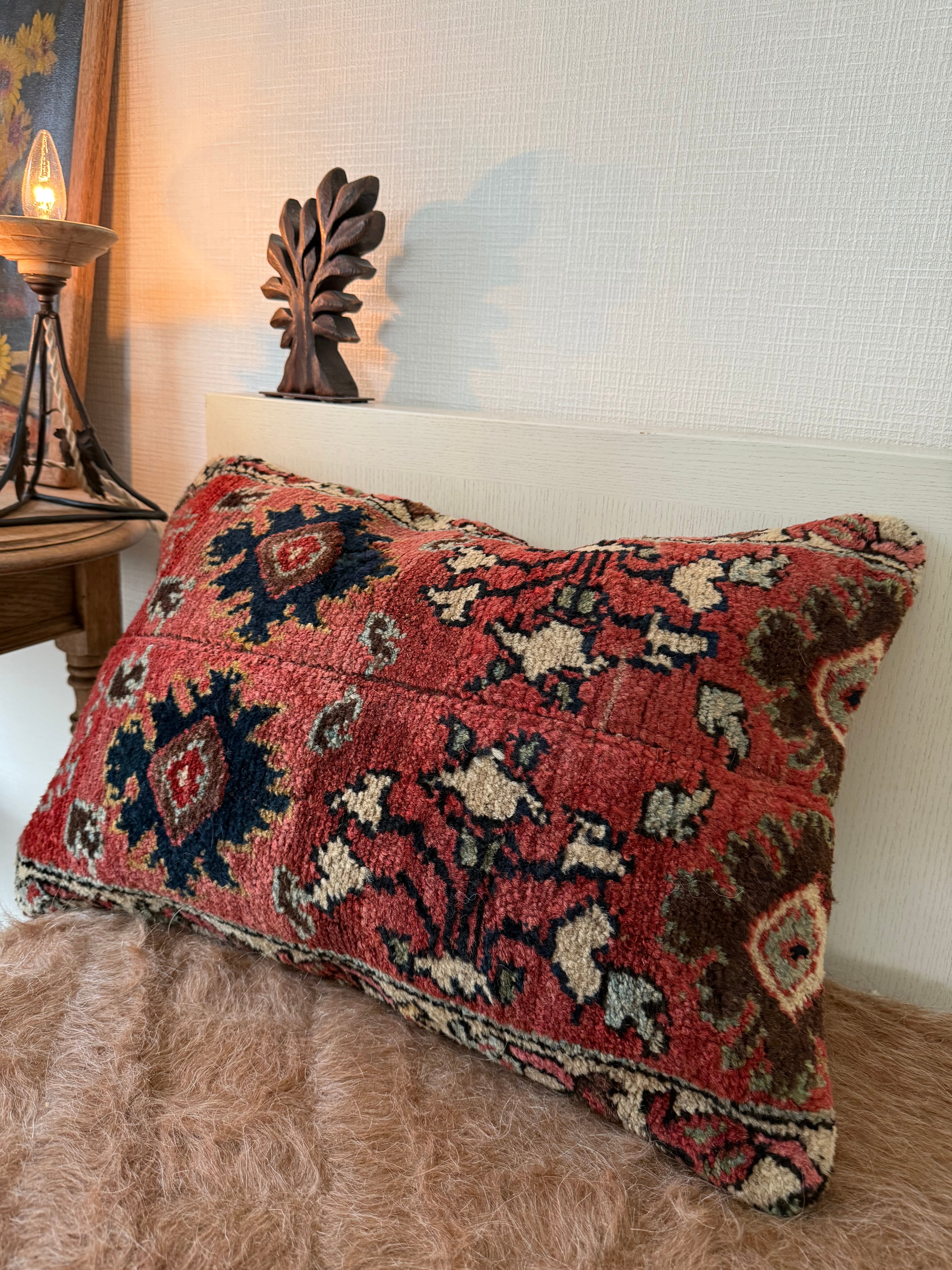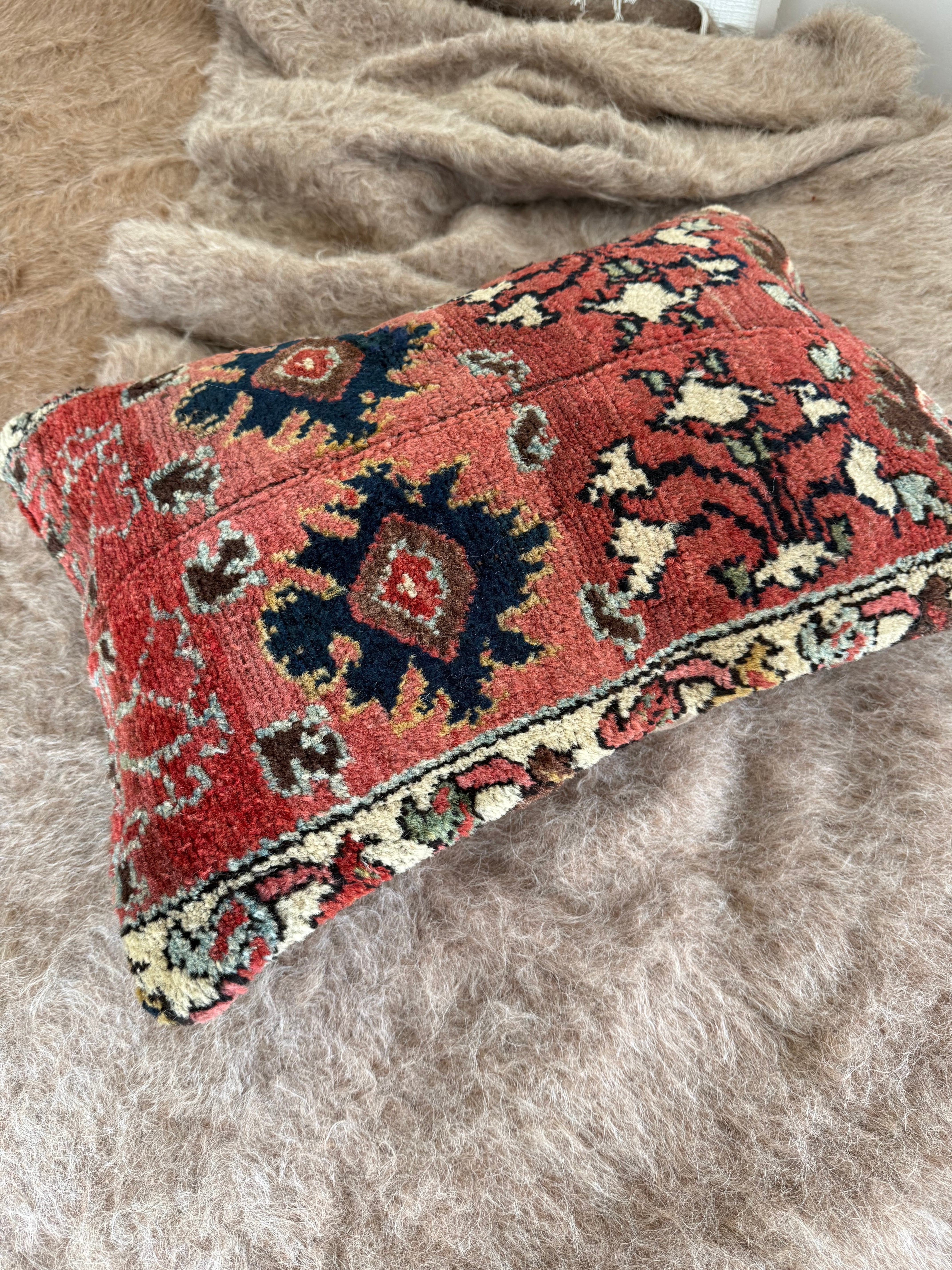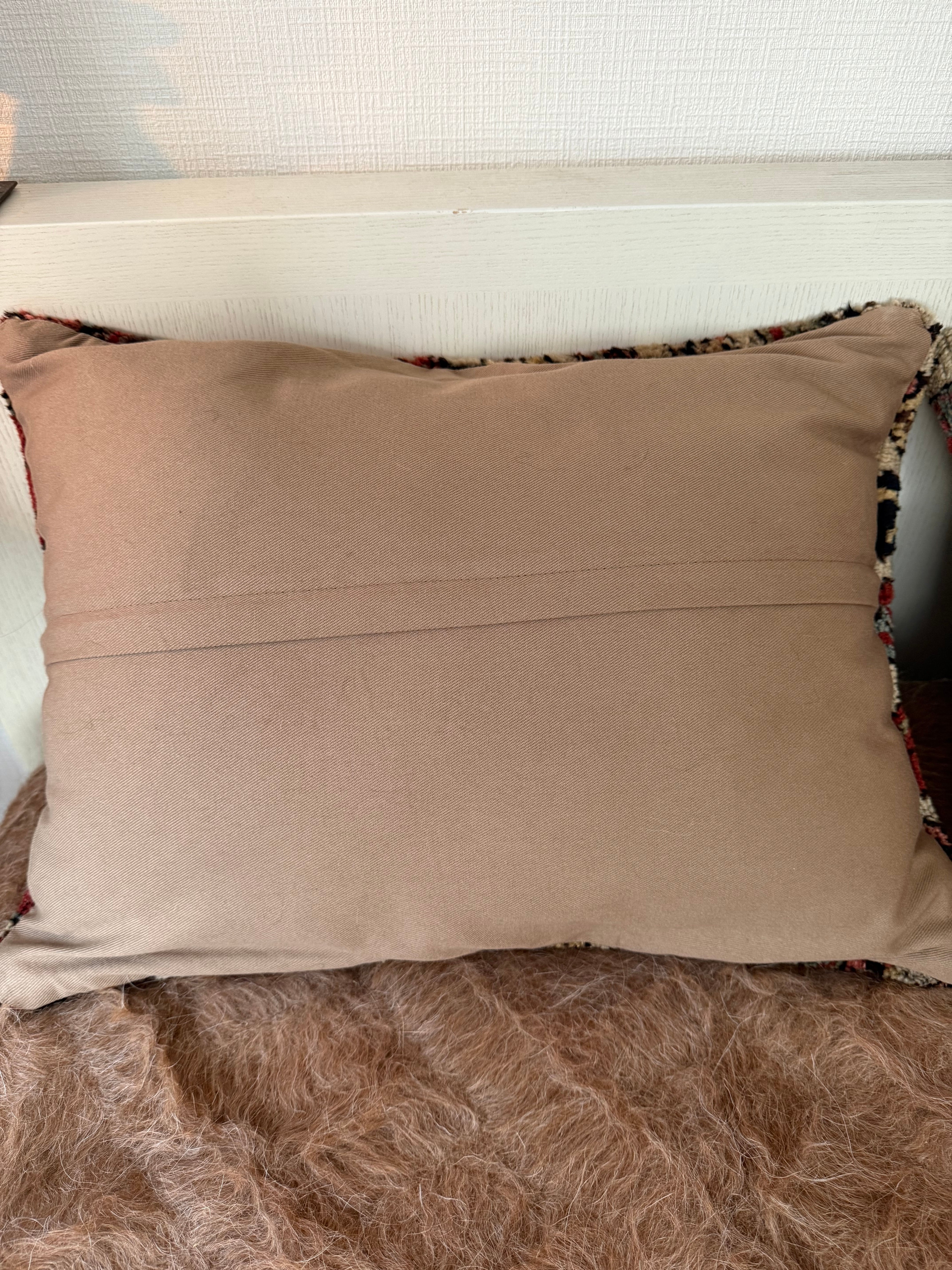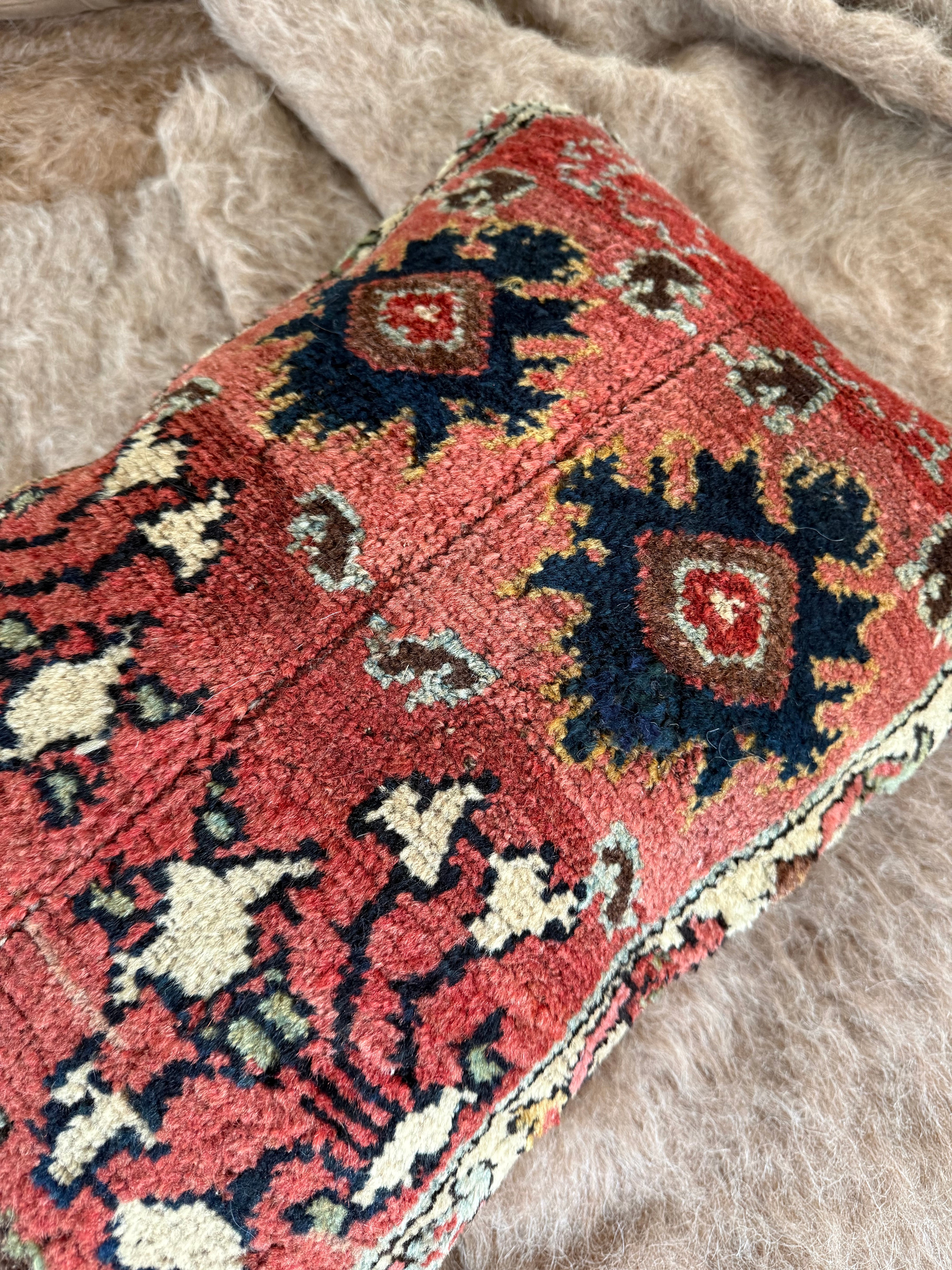 およそ140年前に織られた、大きなラグをアップサイクルして作られたクッションカバー。