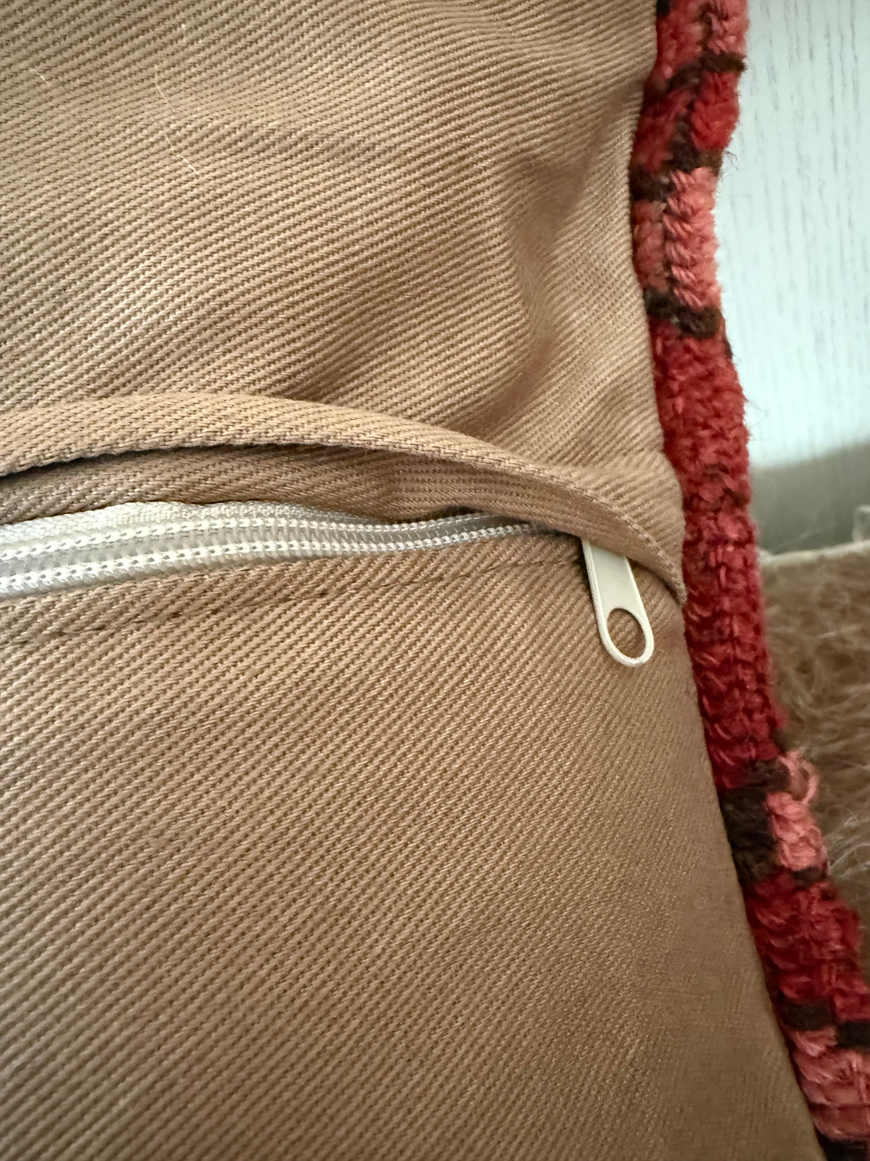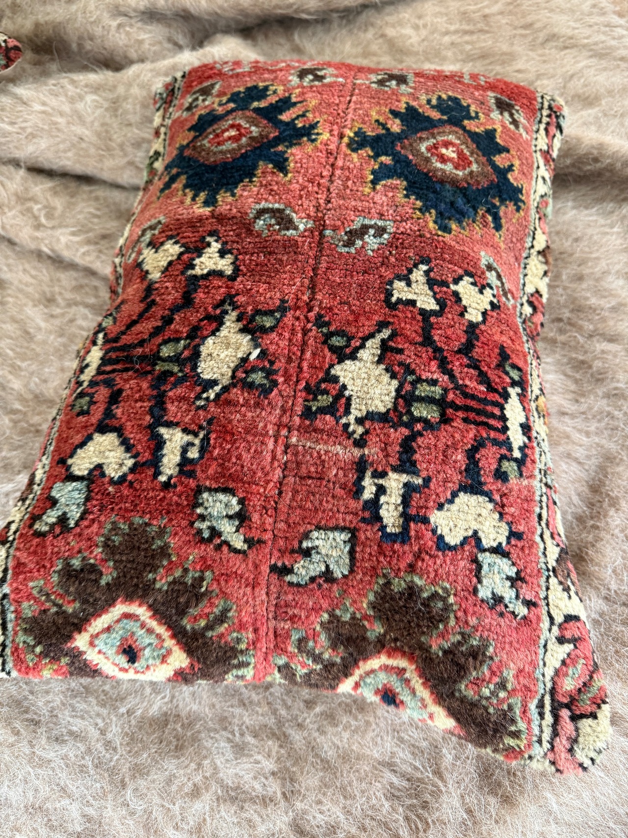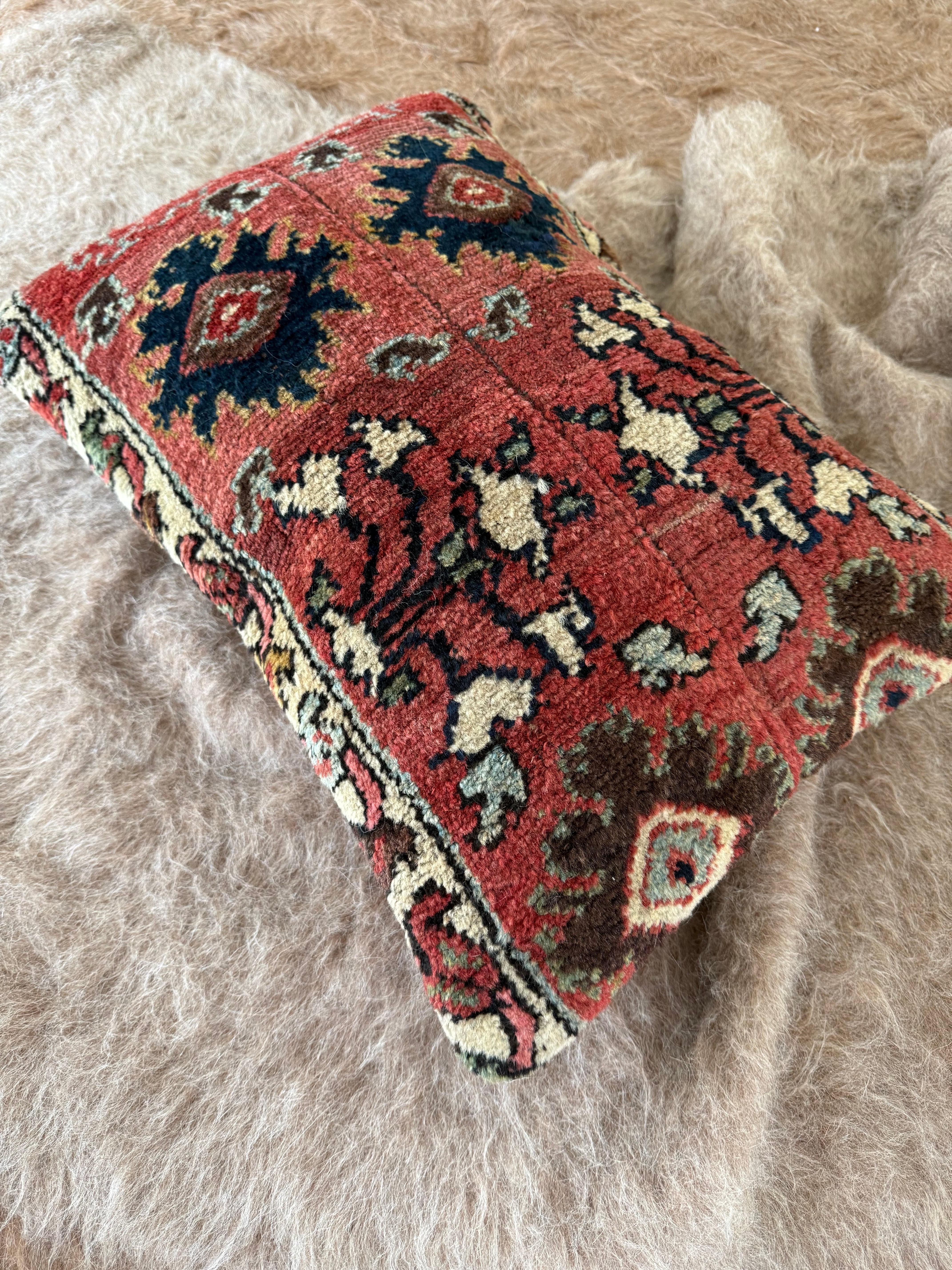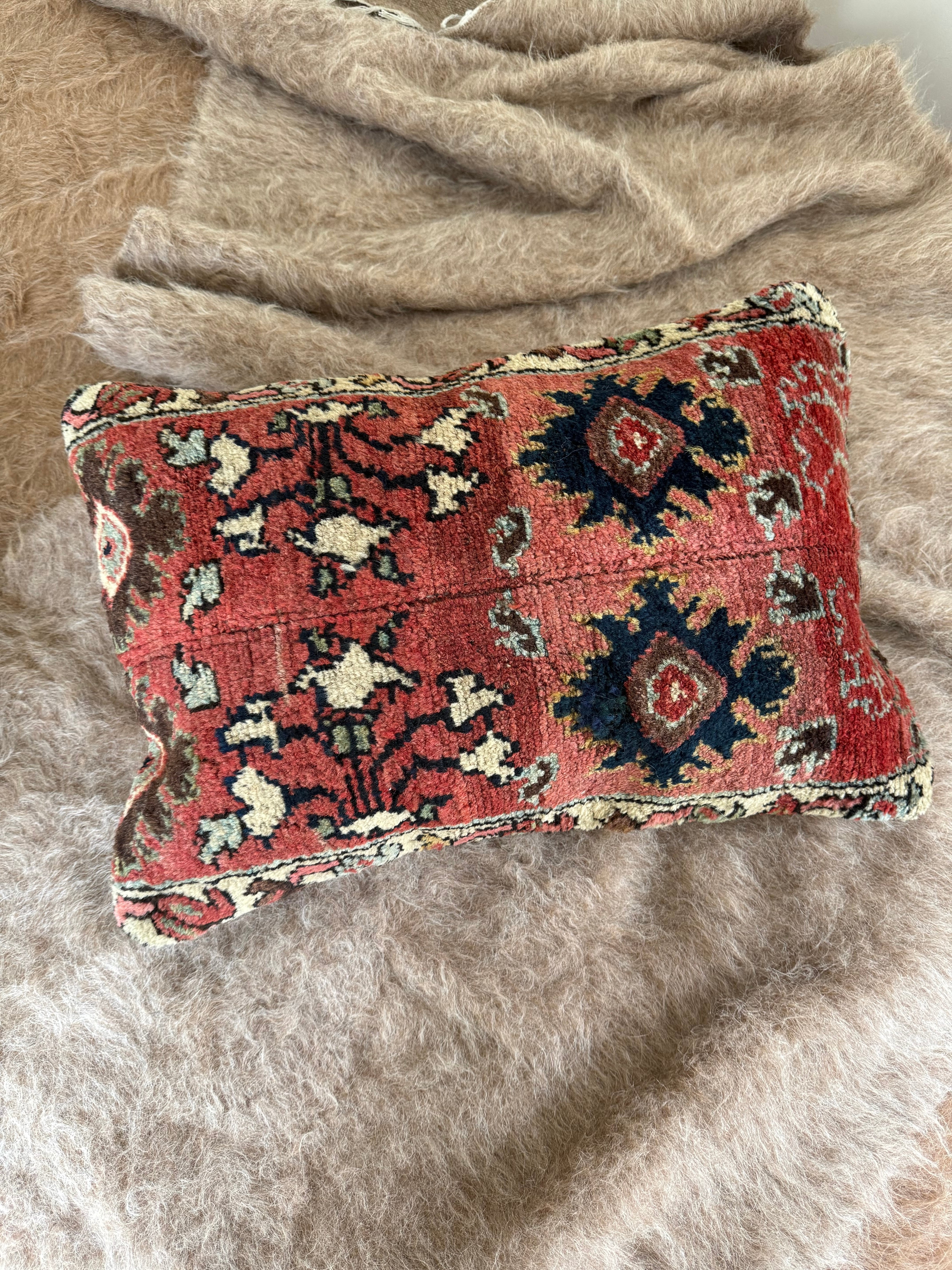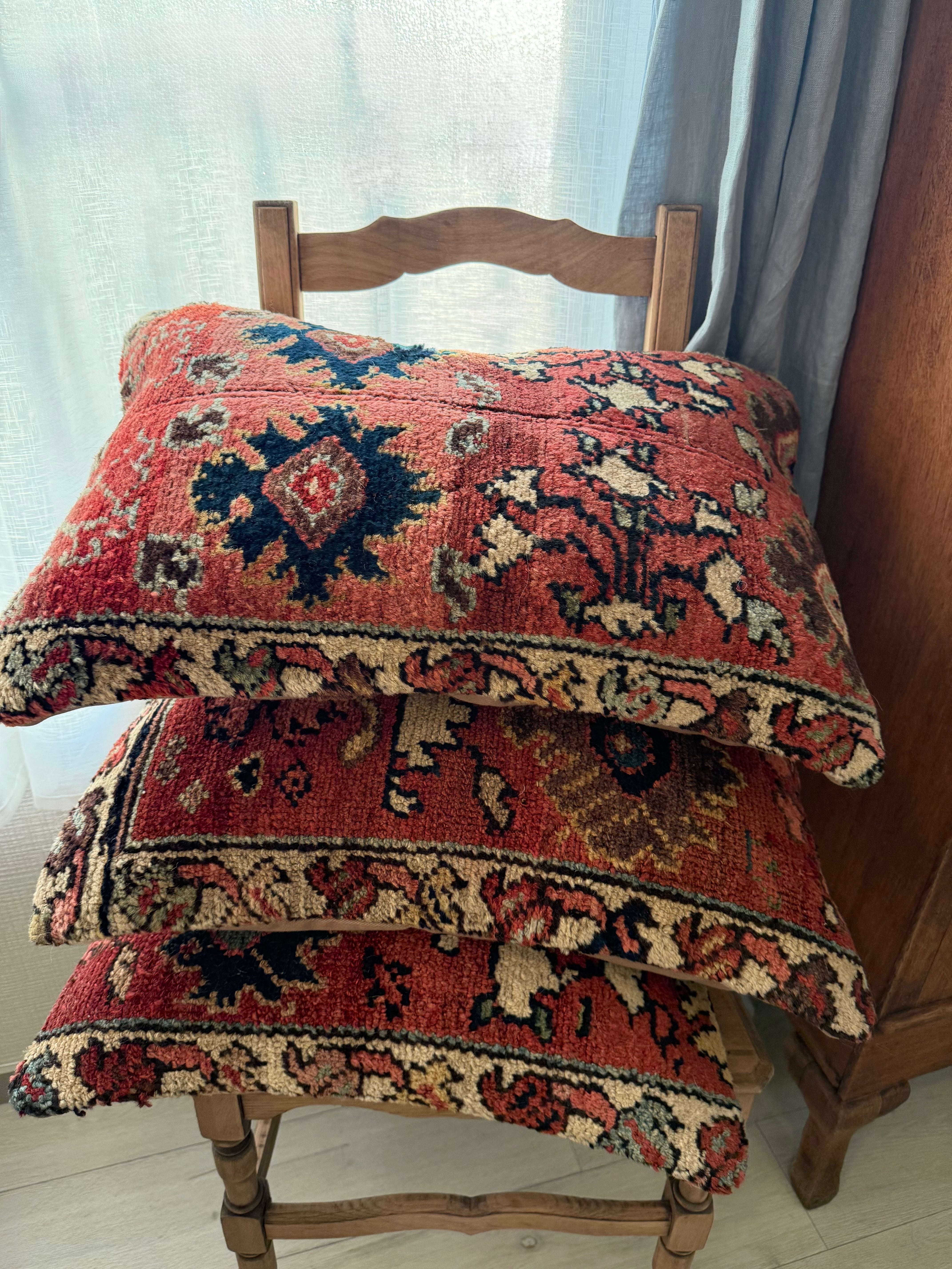 およそ140年前に織られた、大きなラグをアップサイクルして作られたクッションカバー。