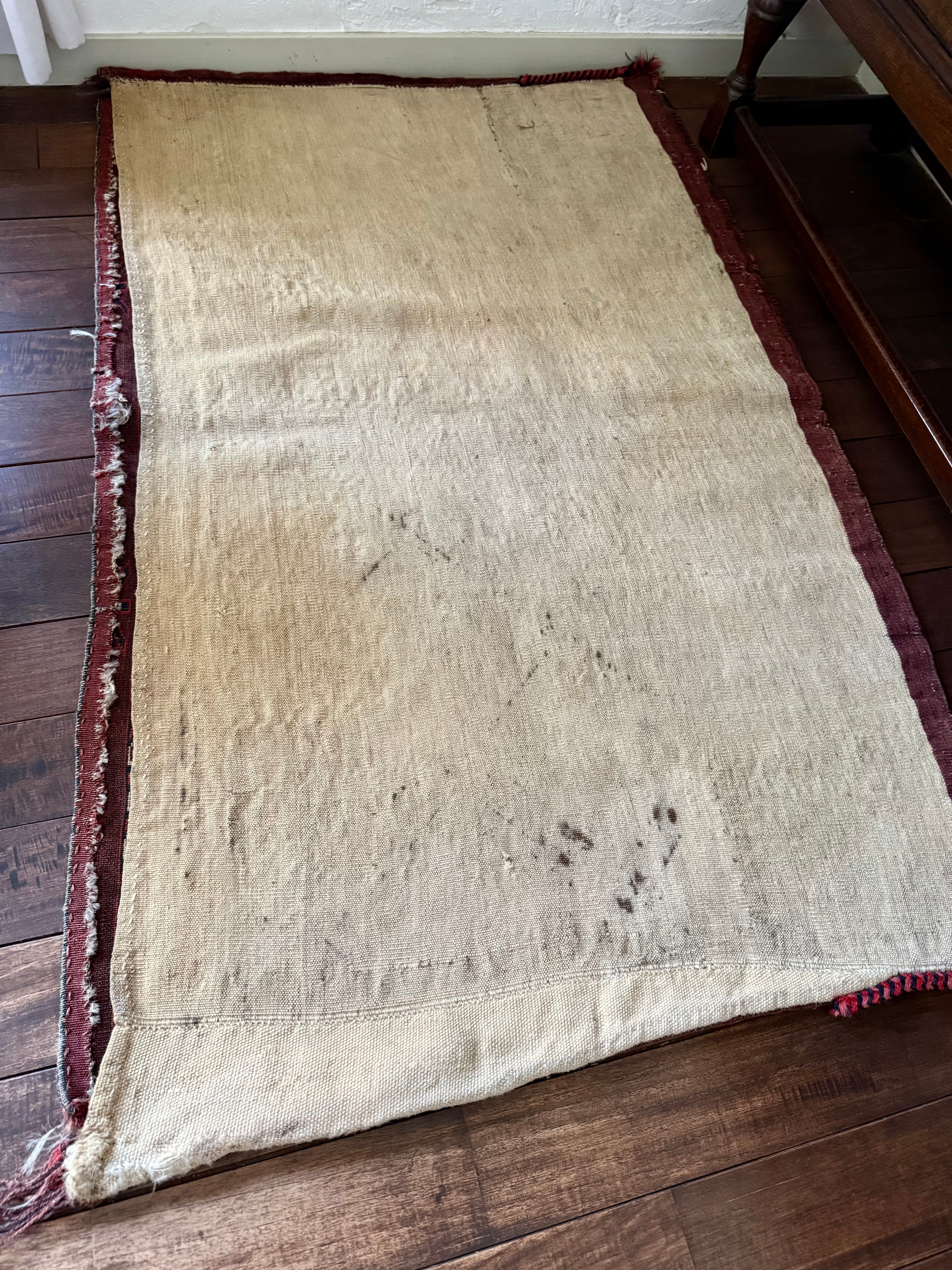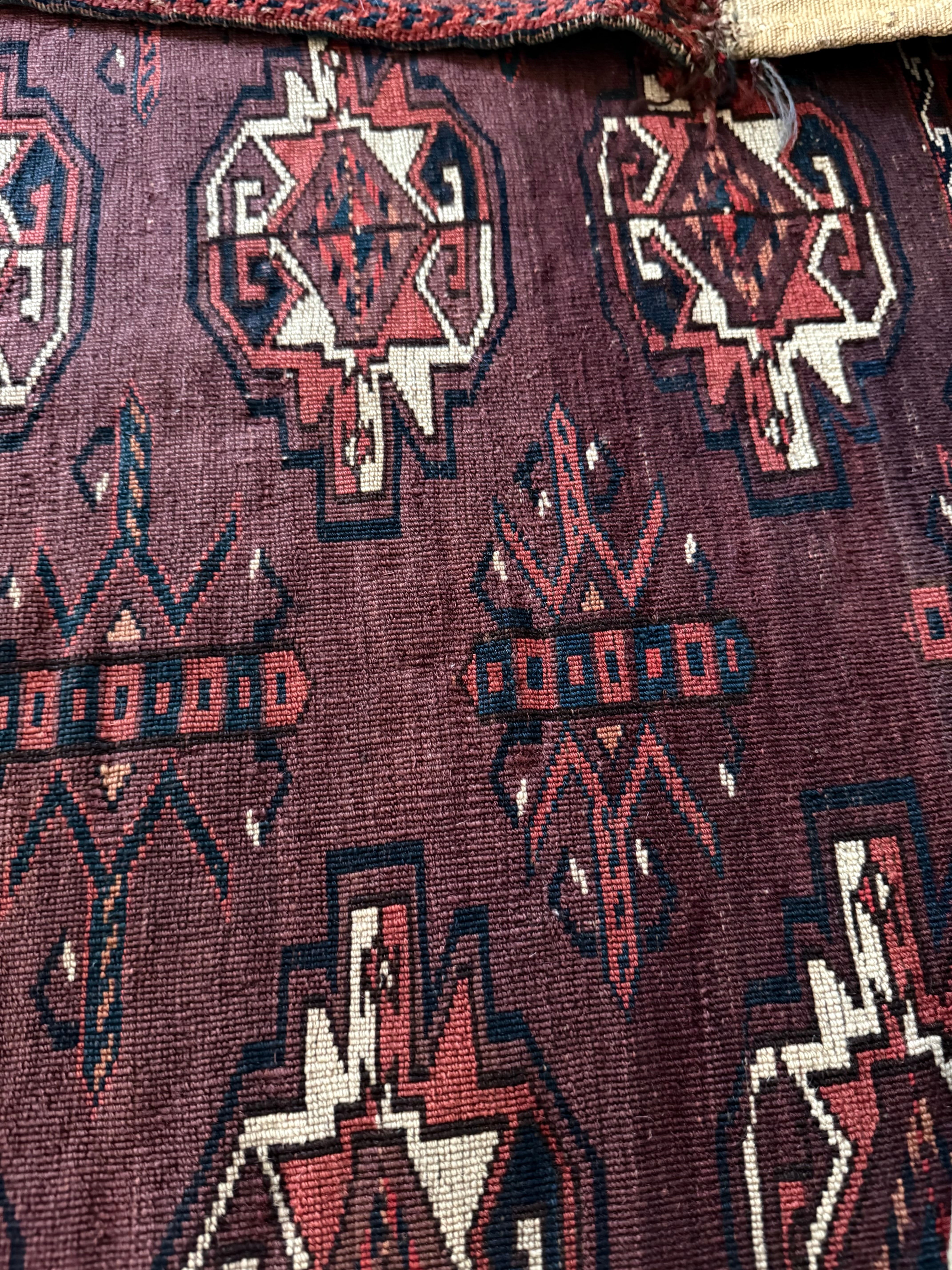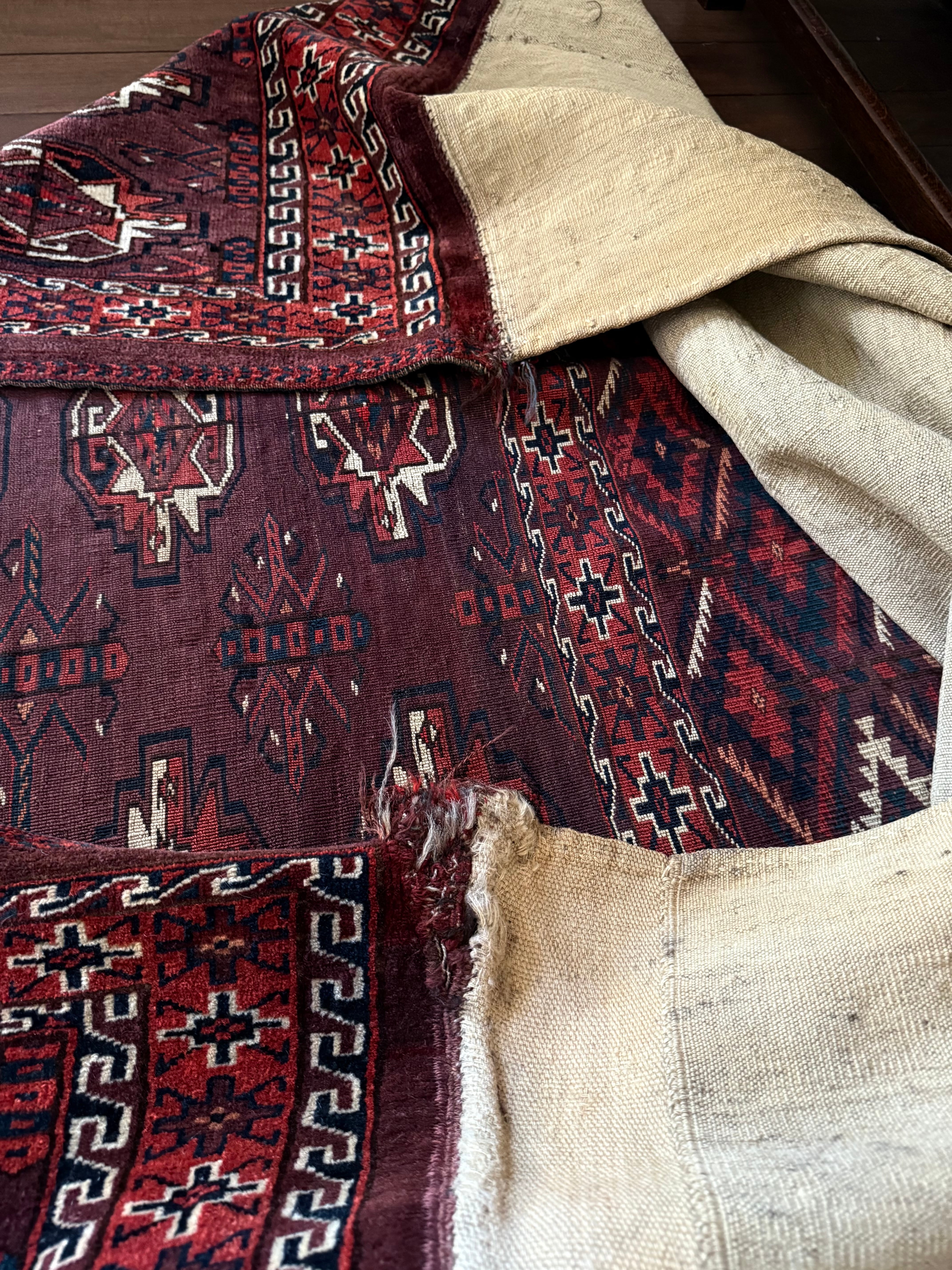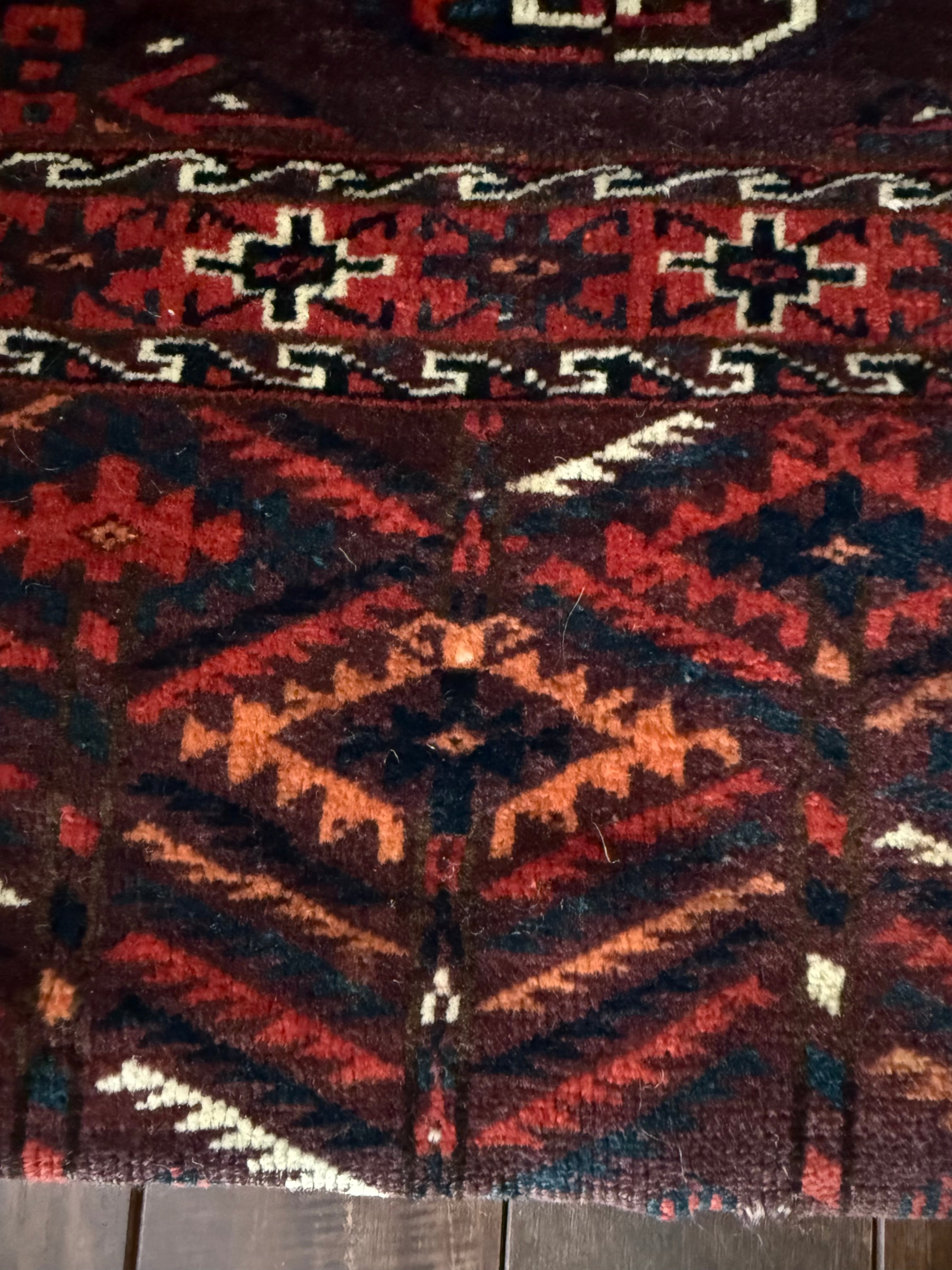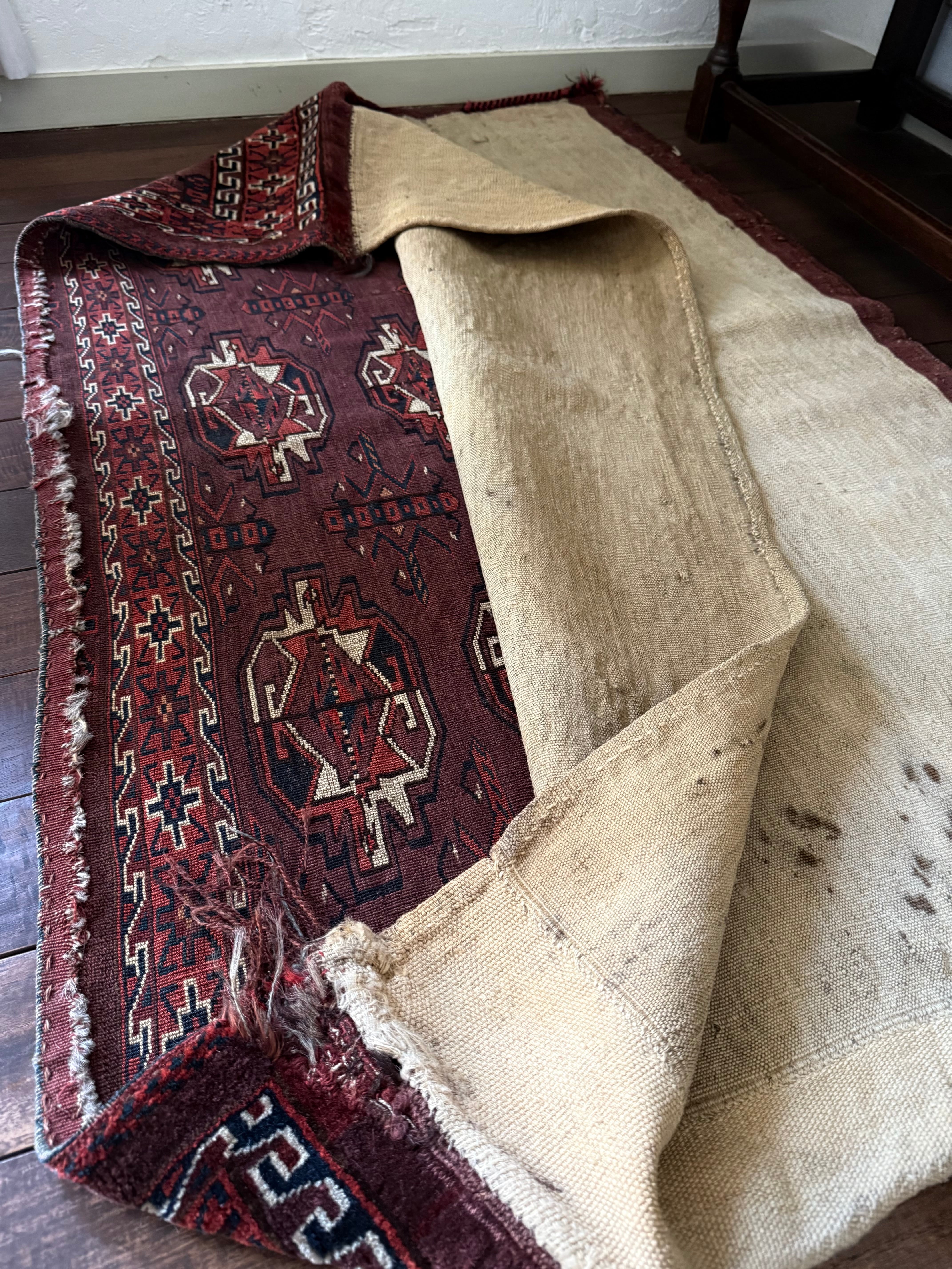 ビロードのような毛足のとても美しいラグで、おそらく150年以上前のものですが、表側のパイルにはダメージがほぼありません。(袋として使われていた場合は、足で踏まないので傷んでいないものが見つかります)上部の角に破れた箇所を修繕された跡(12枚目)がありますが、ラグとして使う時にはほぼ目立ちません。