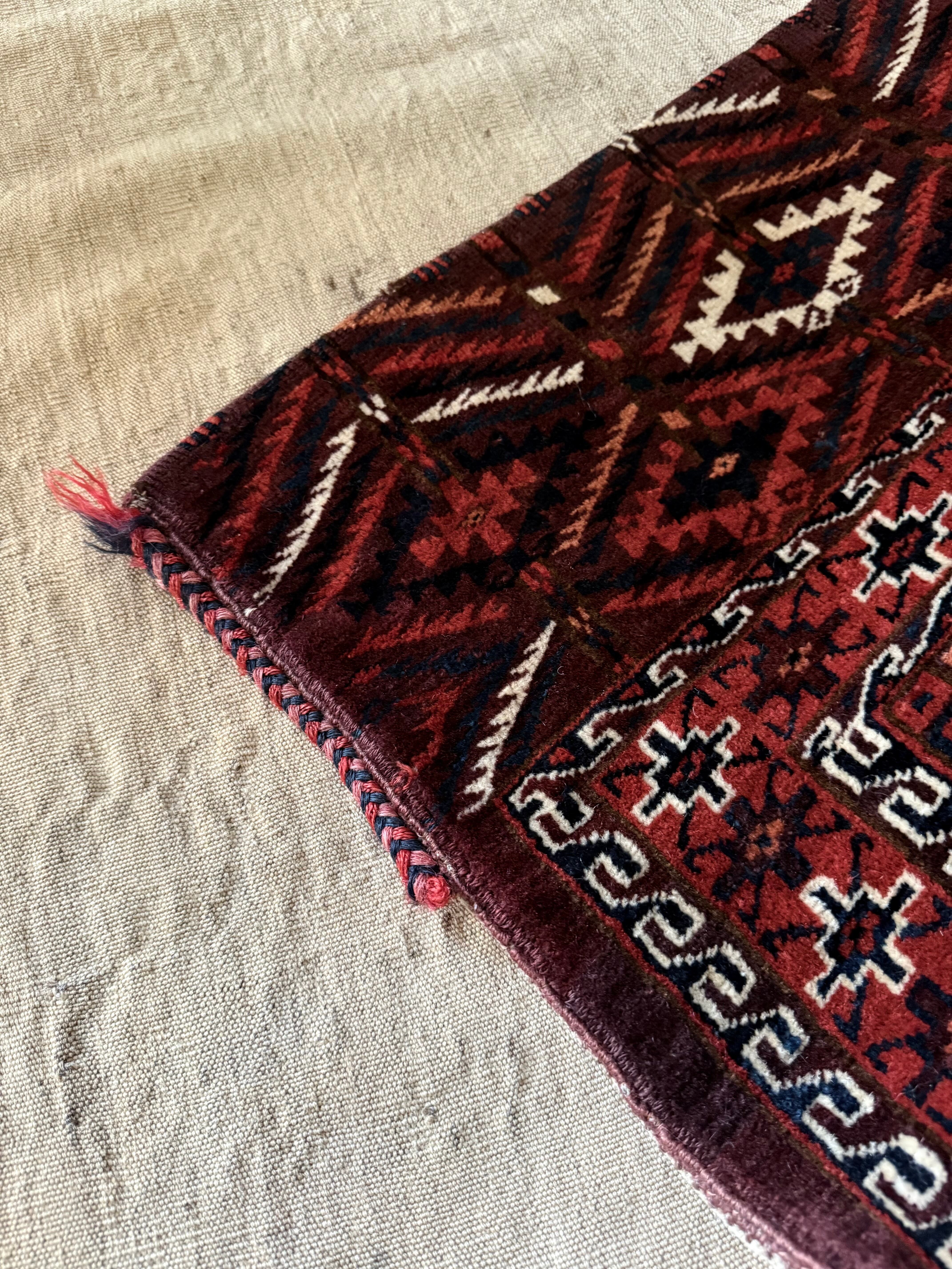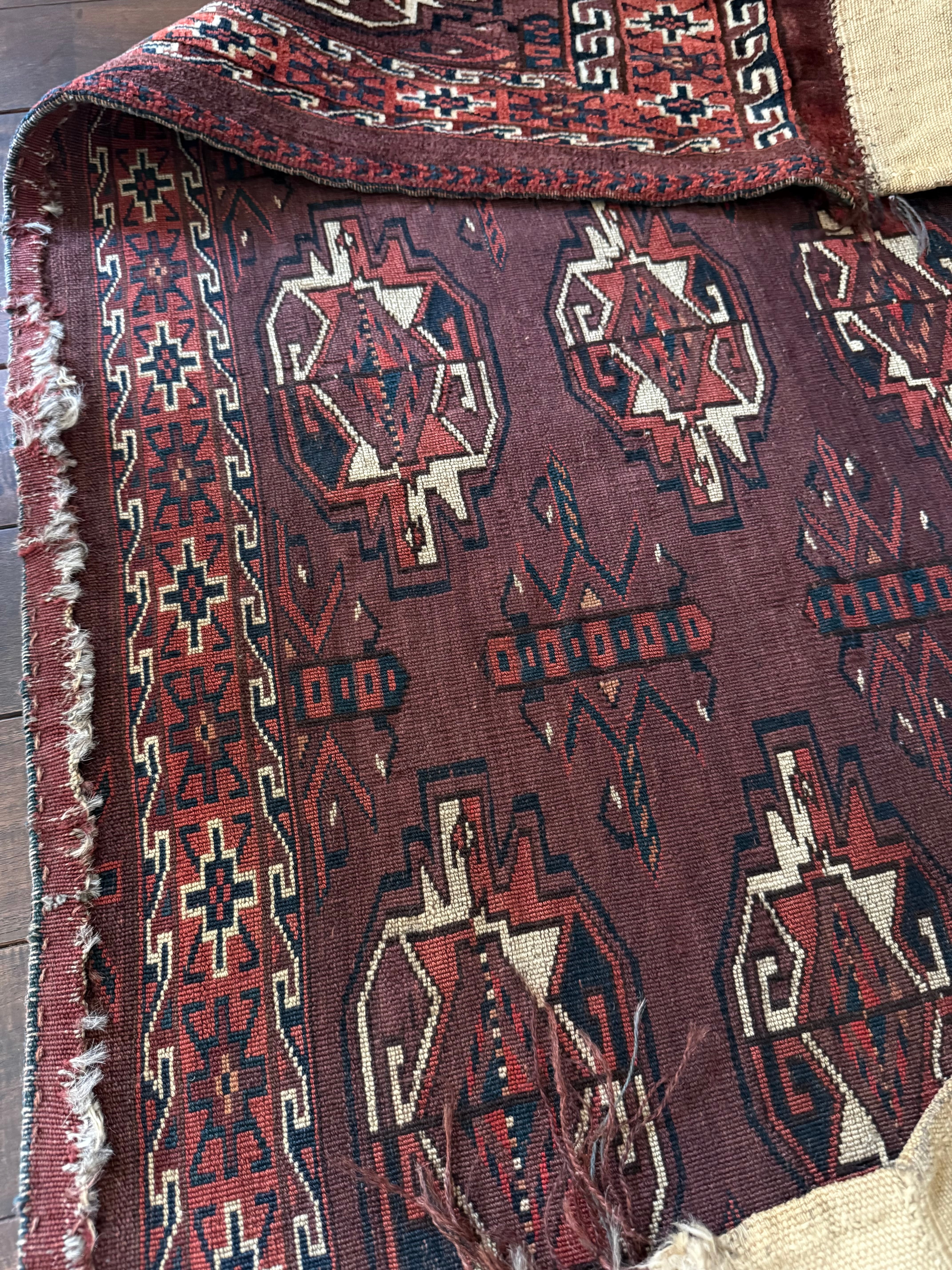 トルクメンは赤のラグの印象が強いですが、このシックなすみれ色は珍しいタイプです。