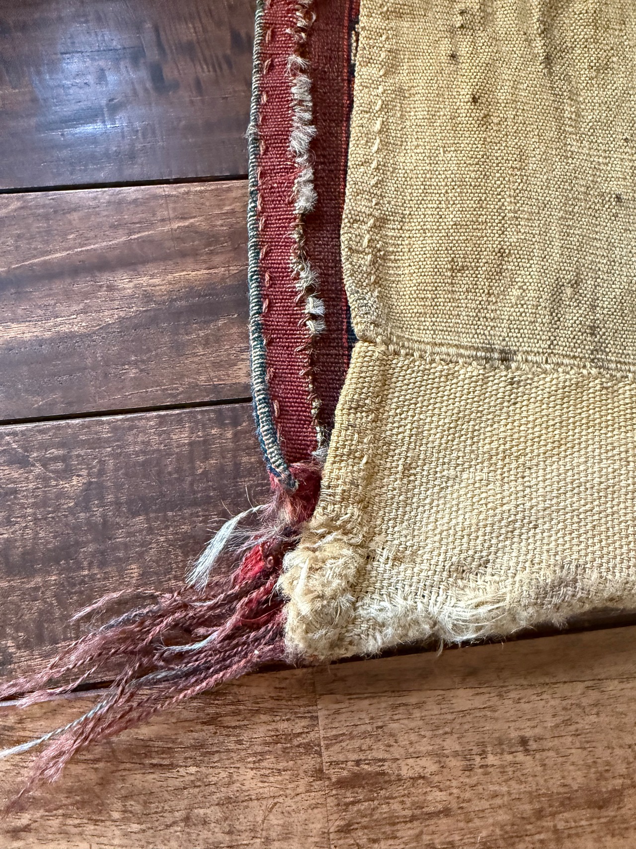 裏側は麻のような手触りの細く紡がれたウールの毛糸で織られた袋が付いています。表と裏の織物を止めている三つ編み部分(13枚目)の緋色と濃紺の色合わせがまた素敵です。