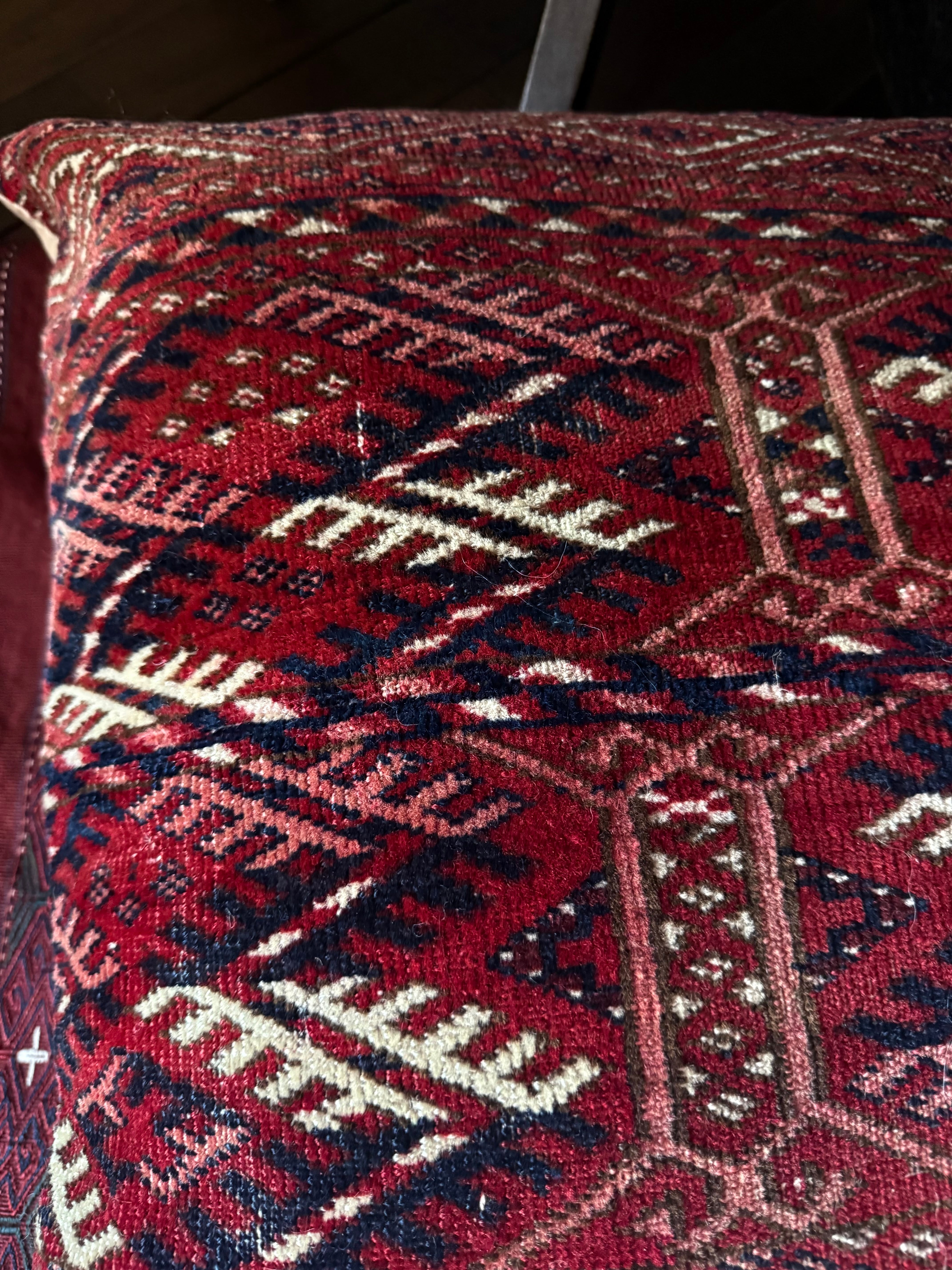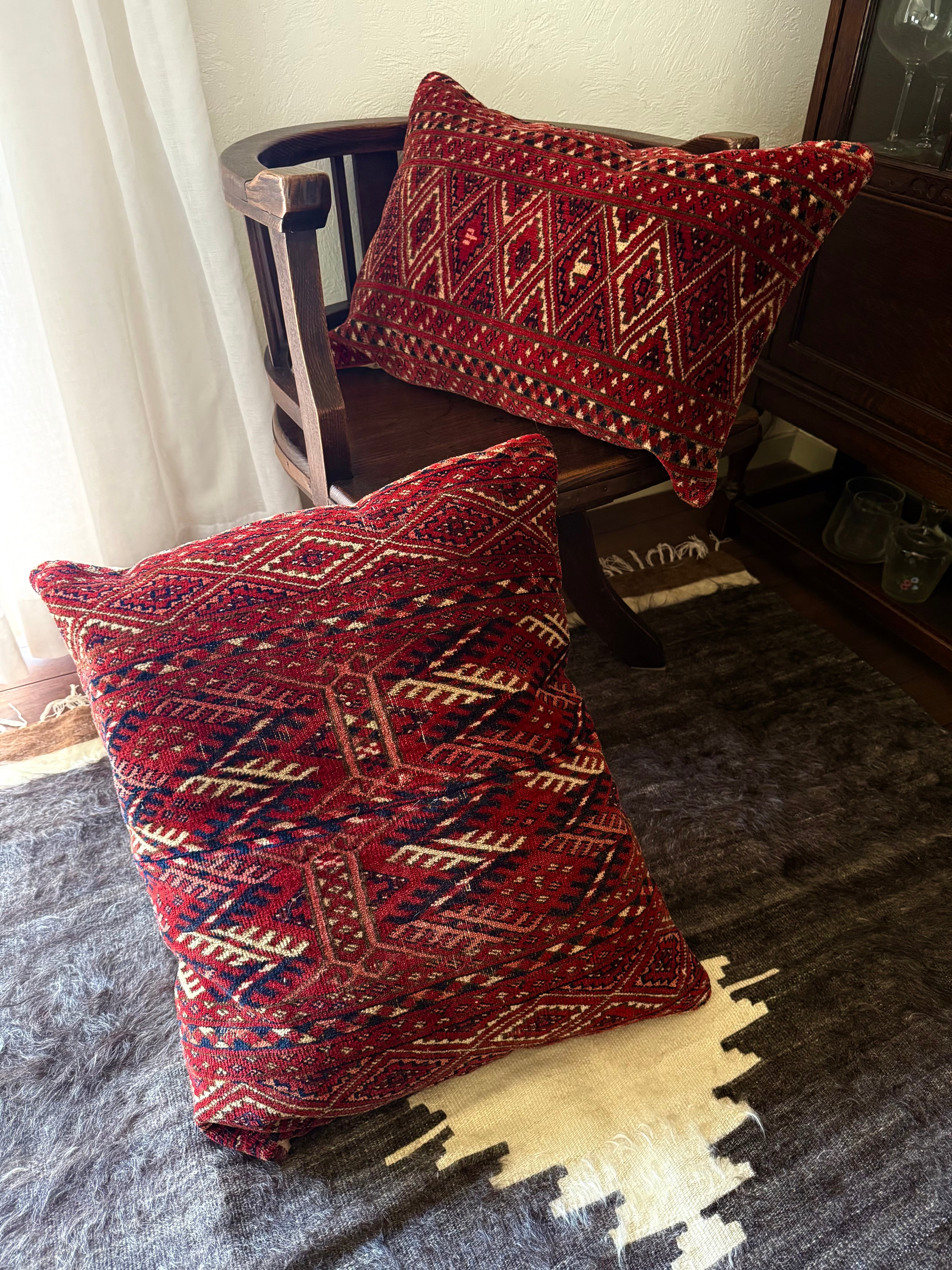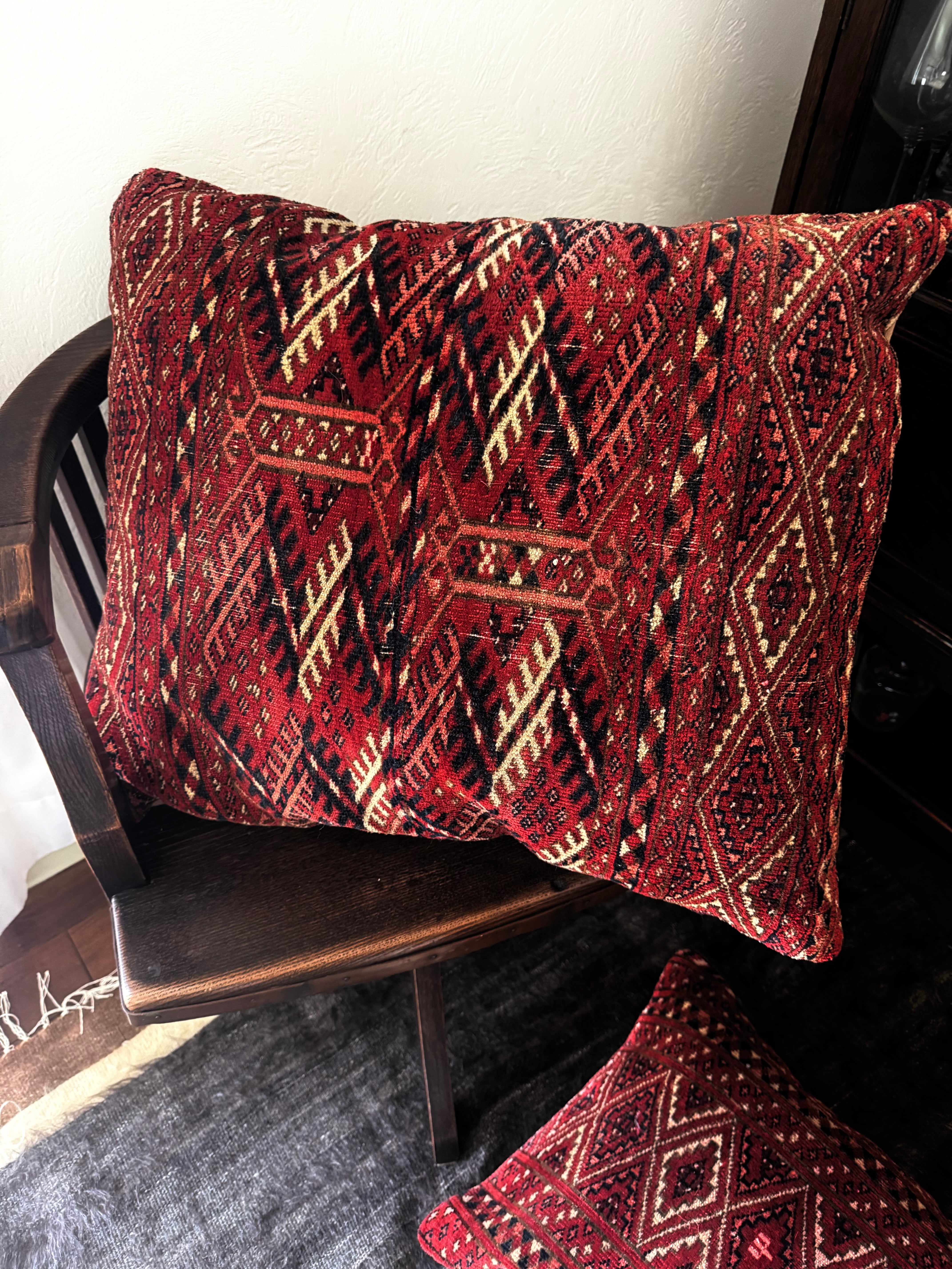 真紅の美しいテッケの大きなラグから作られたクッションカバー。こちらは特大サイズです。