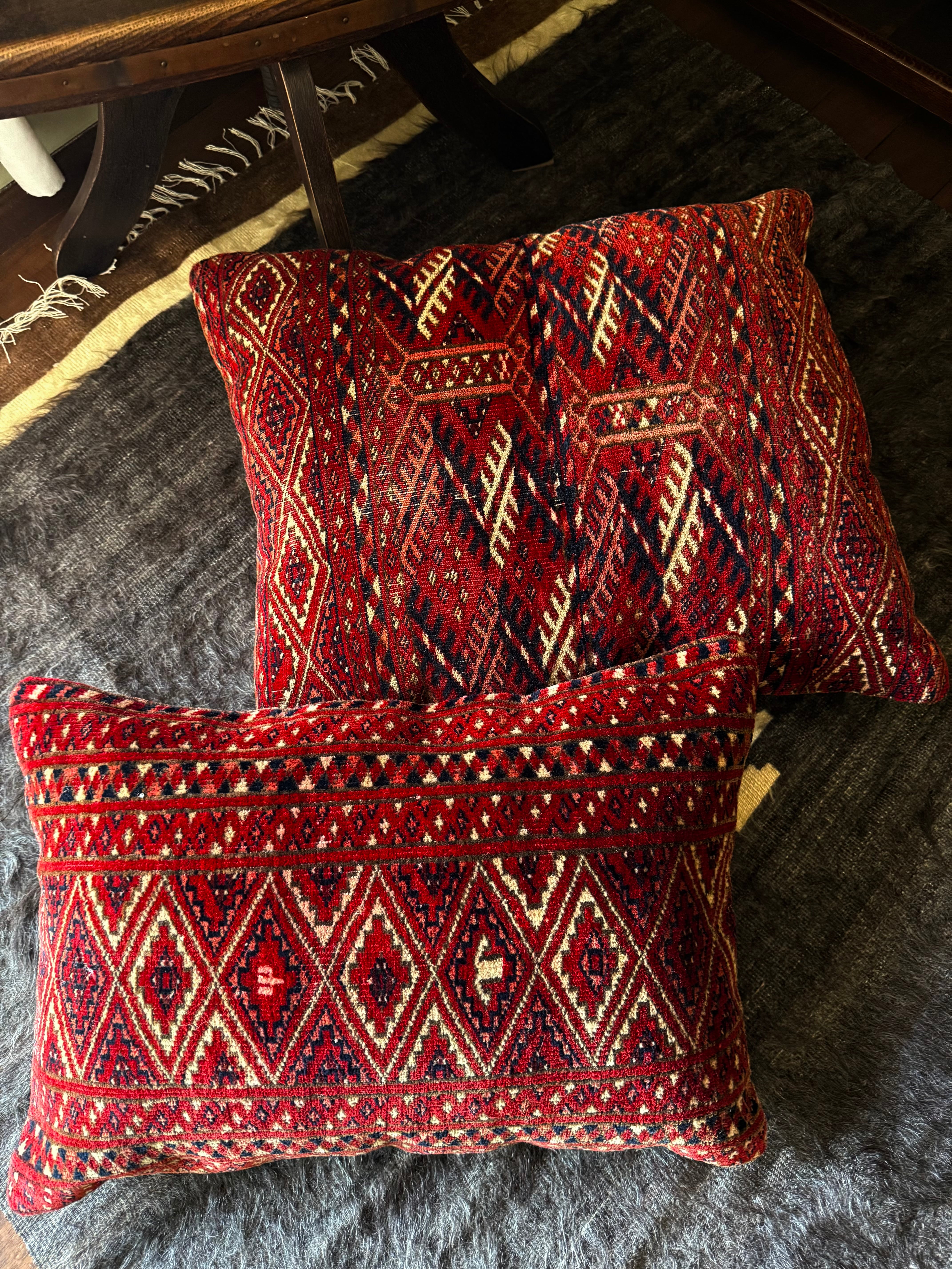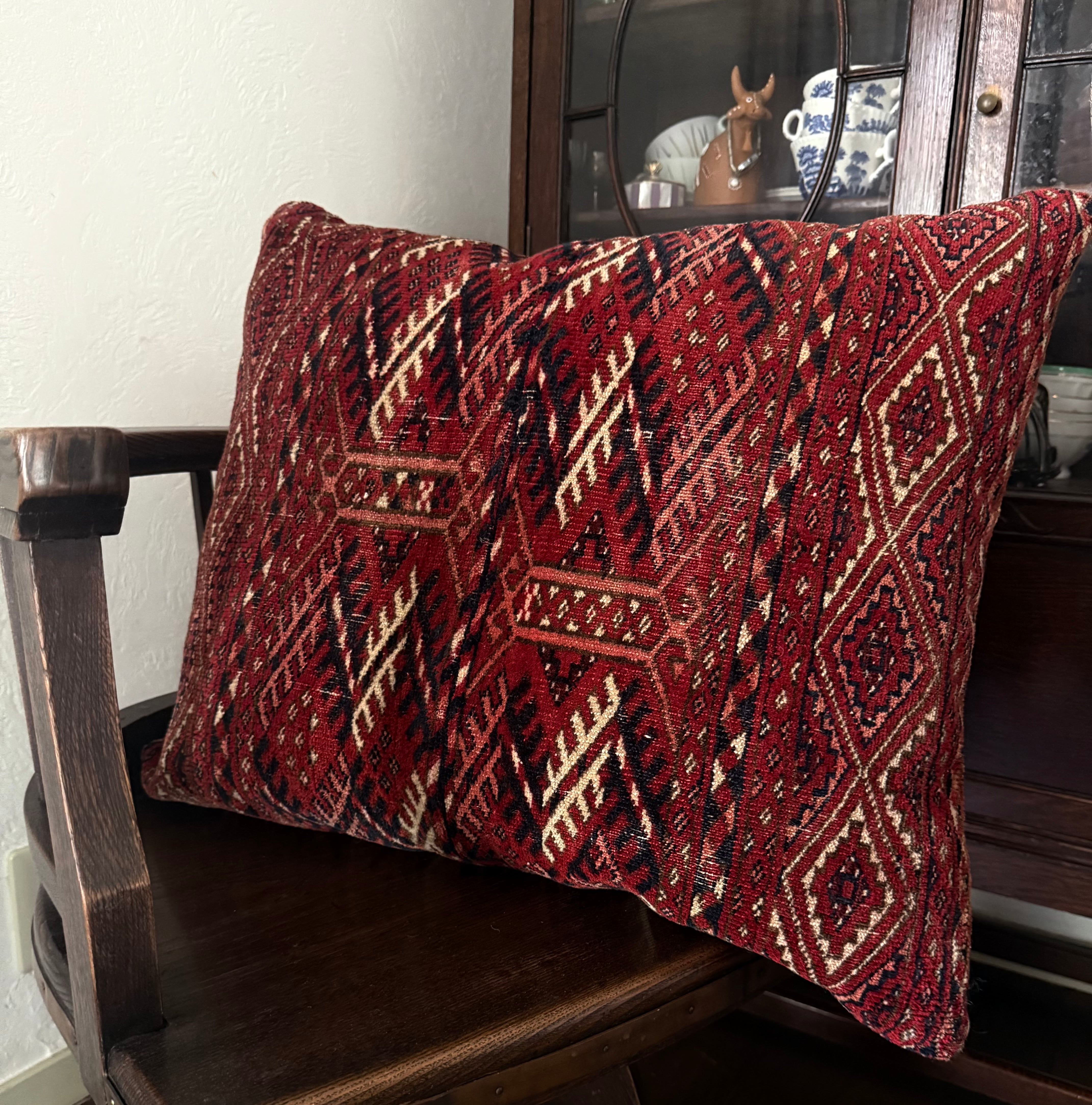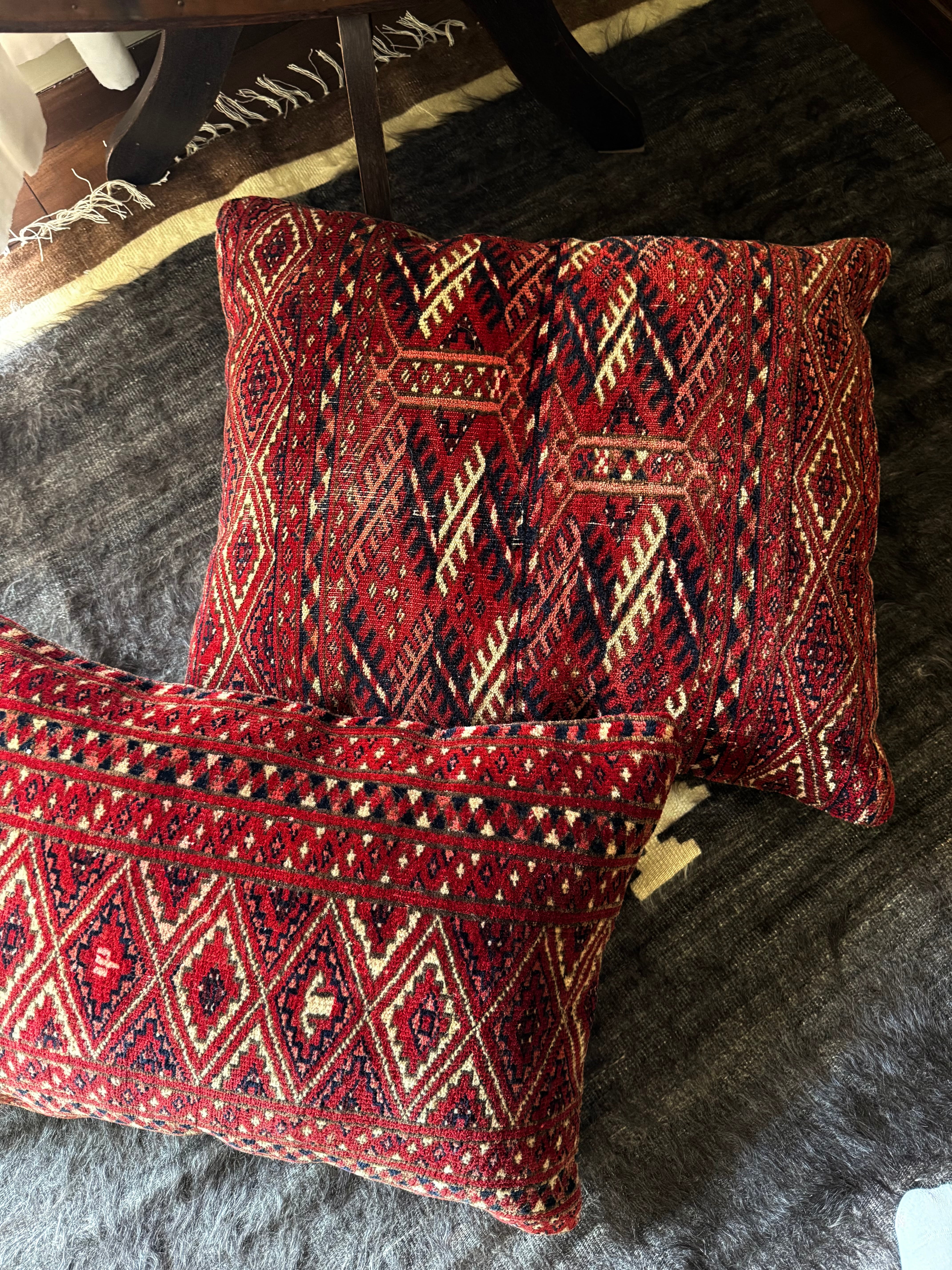 真紅の美しいテッケの大きなラグから作られたクッションカバー。こちらは特大サイズです。