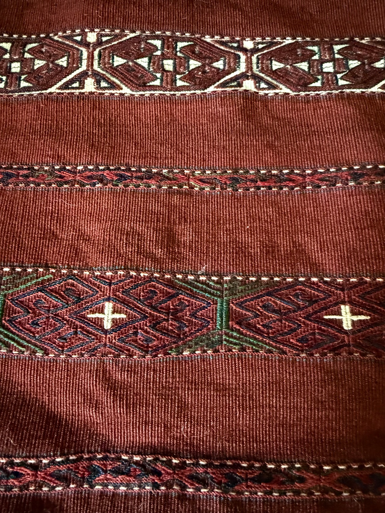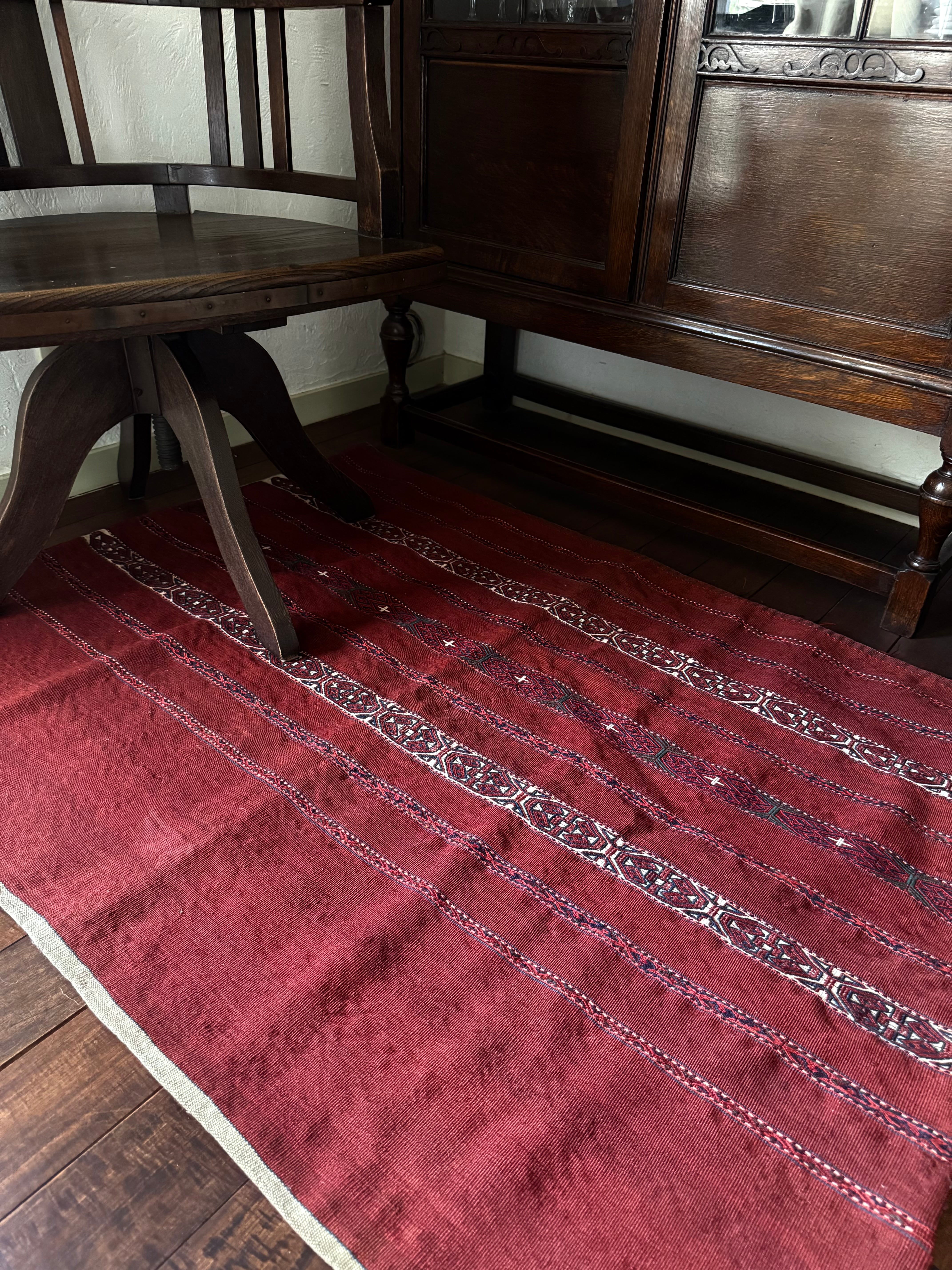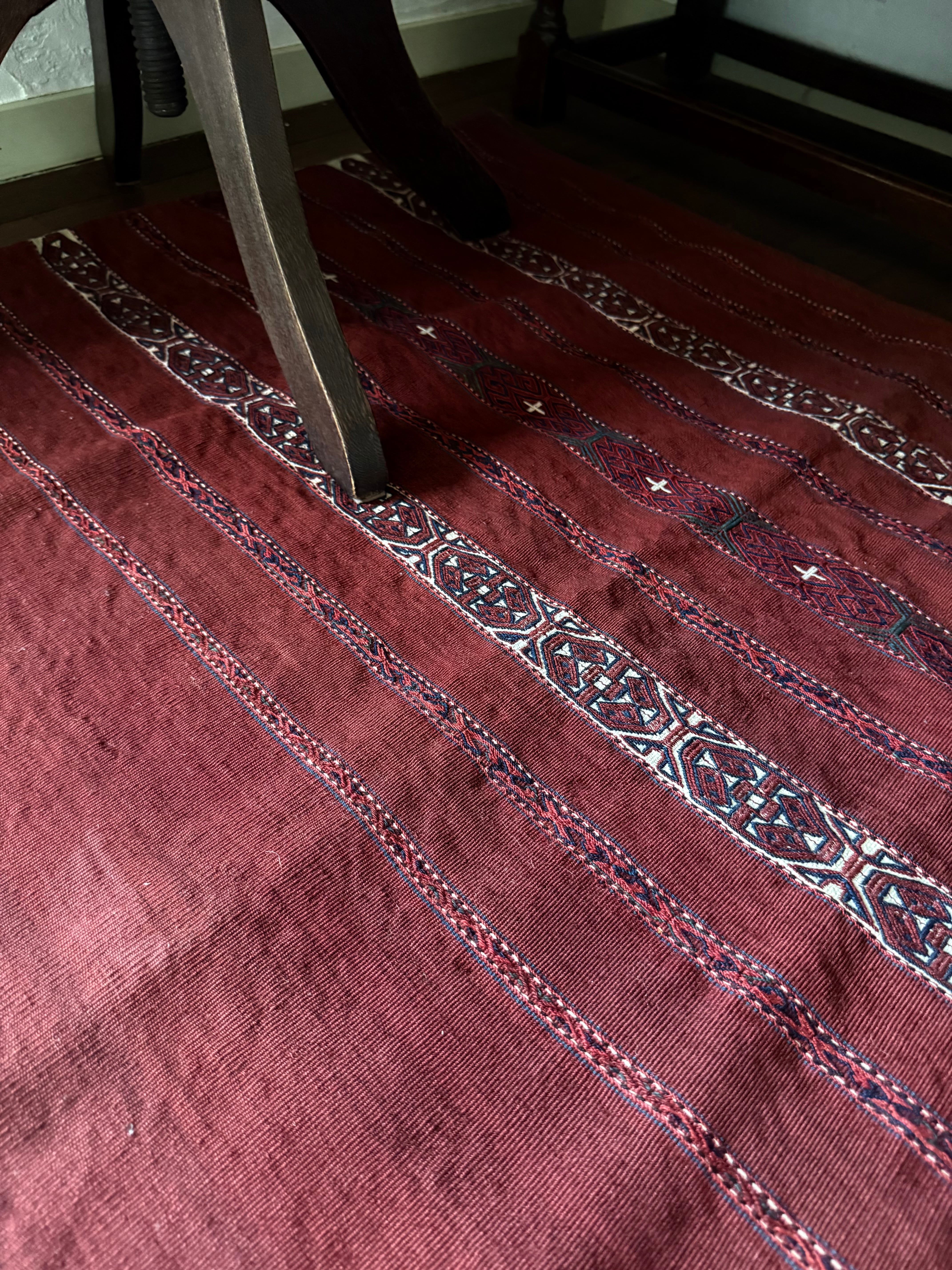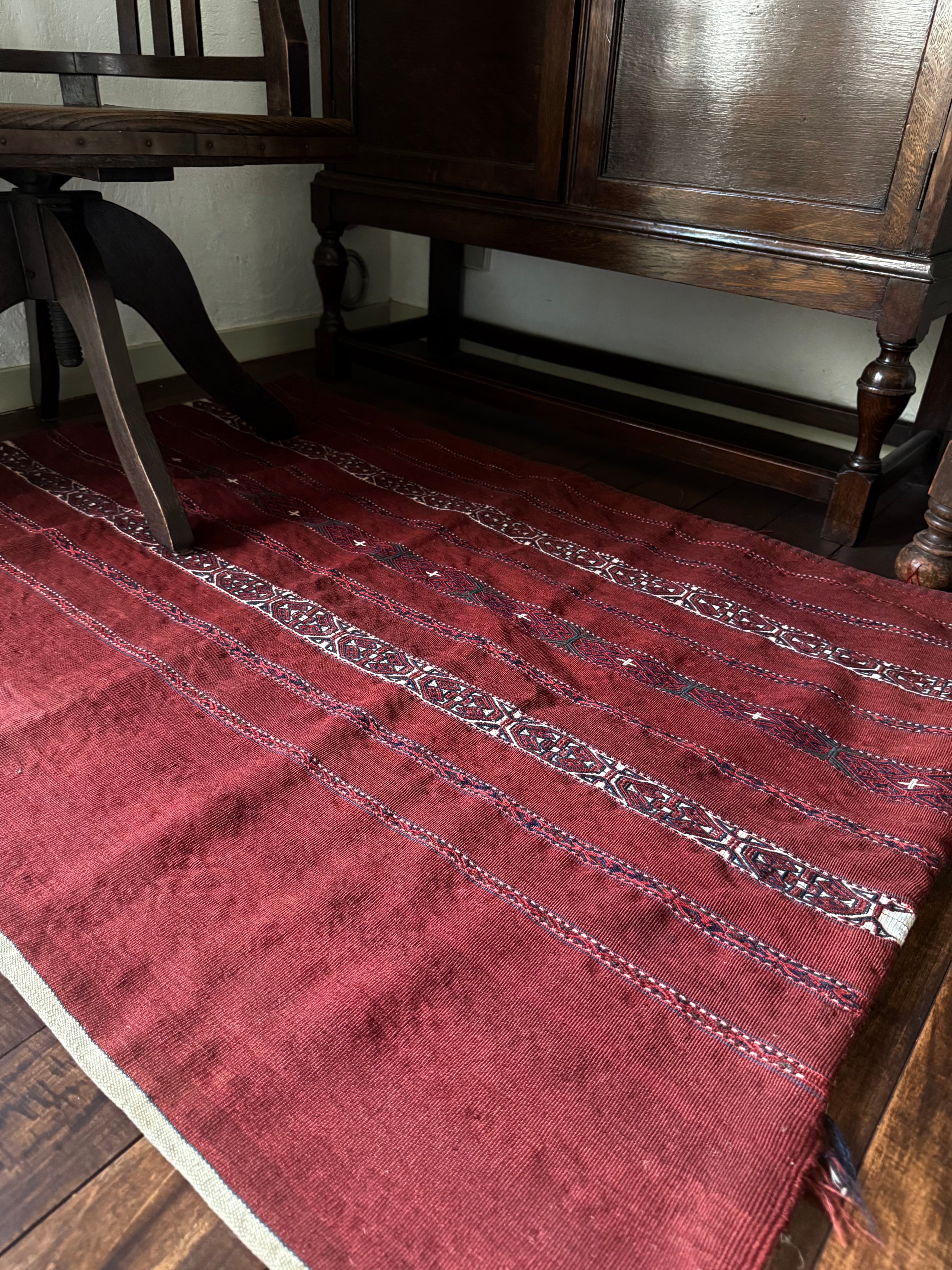 とても珍しい平織りのチュバル。テッケ支族によるものです。細い縞のなかに、非常に細かく緻密なギュルモチーフをジジム織り(縫い取り織り)で入れ込んでいます。