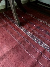 ちなみに、大きなサイズの織り機が生まれる前は、このような細い帯を縫い合わせる形で昔は織っていたようで、このパターンはその名残なのかもしれません。