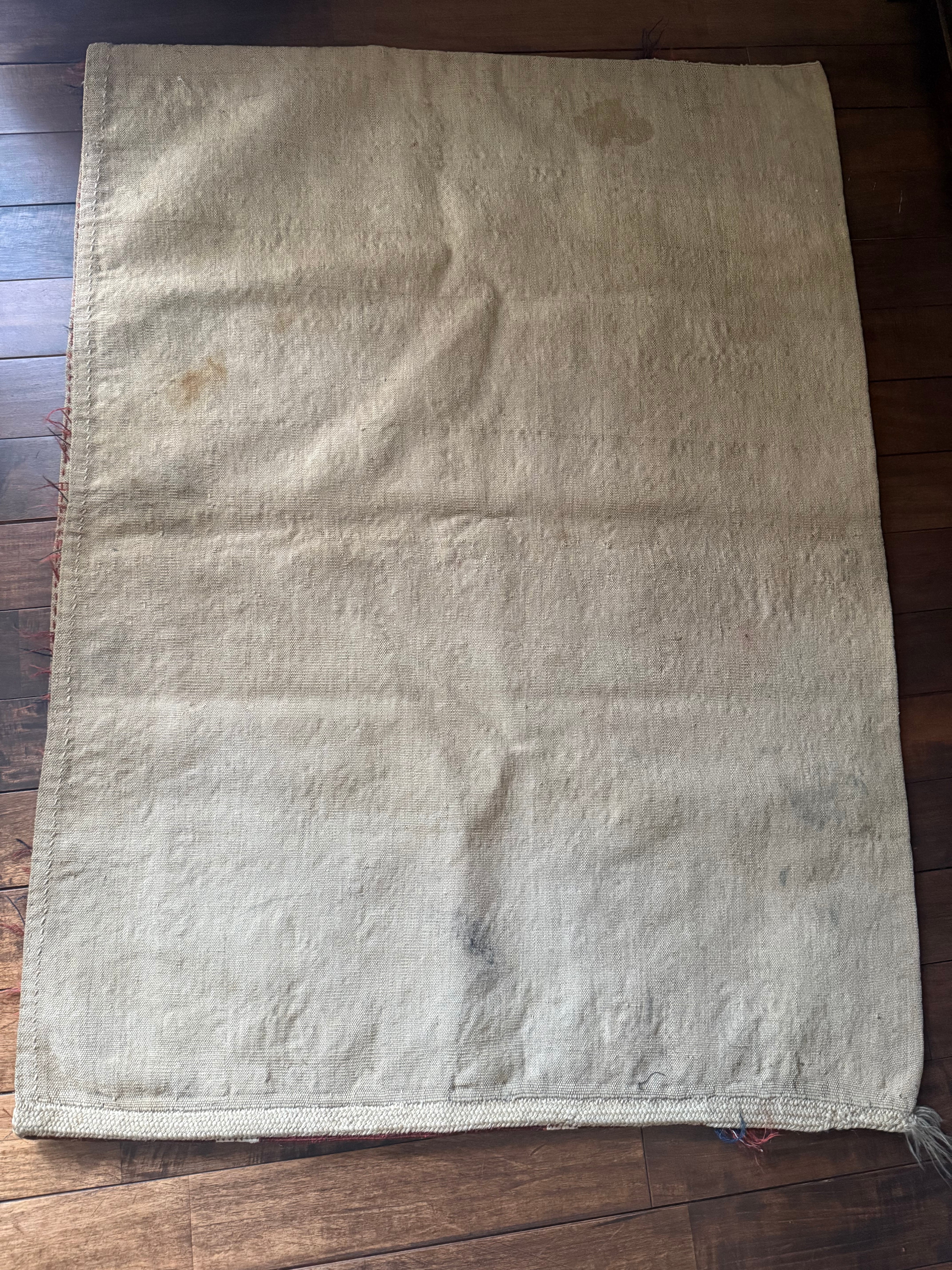 表側には、黄色みの少ないレンガ色をベースに、象牙色、濃紺、そしてわずかに鮮やかなグリーンが施されています。表側の織りに触るとその手仕事の完璧さに驚かされます。