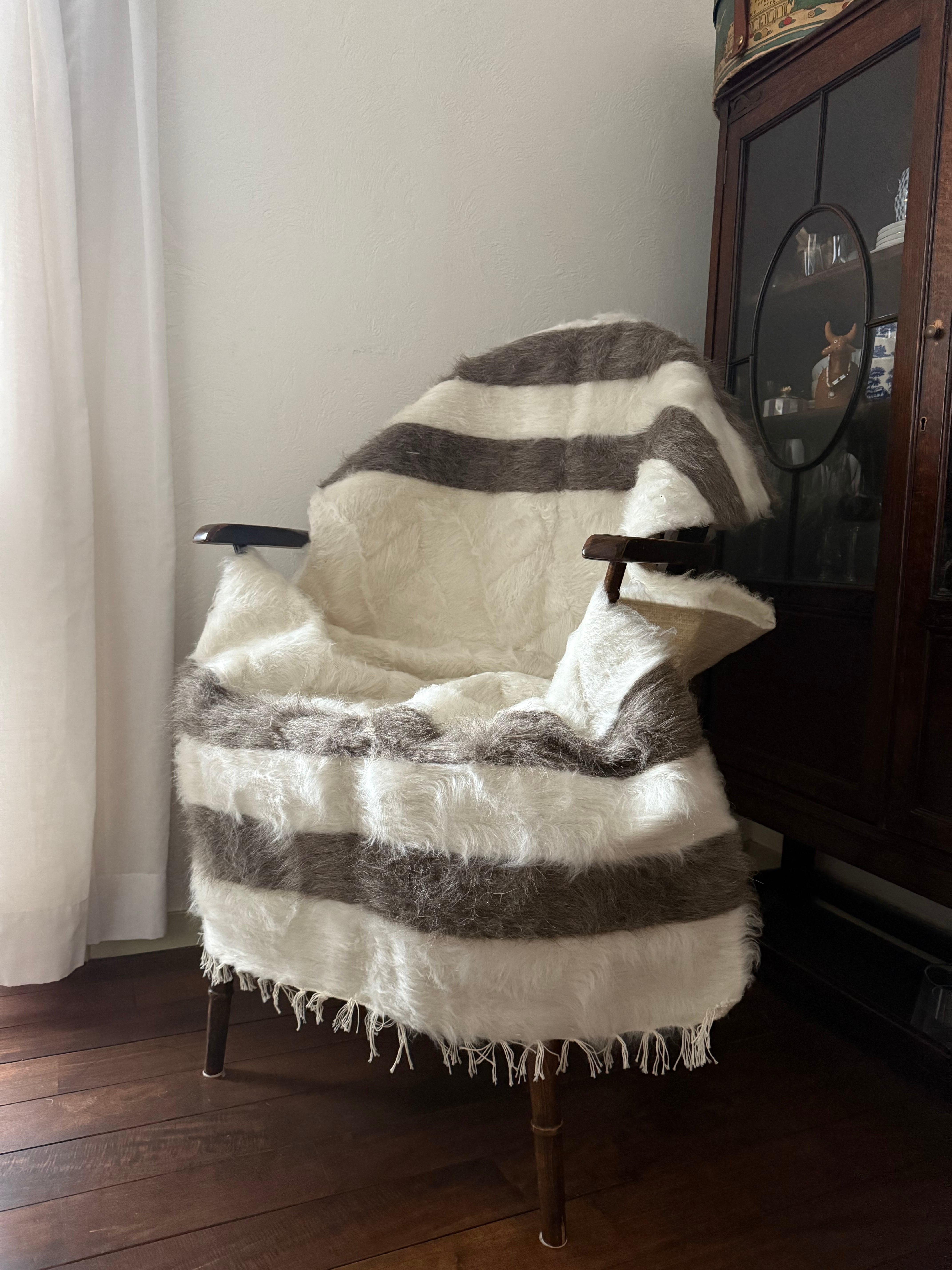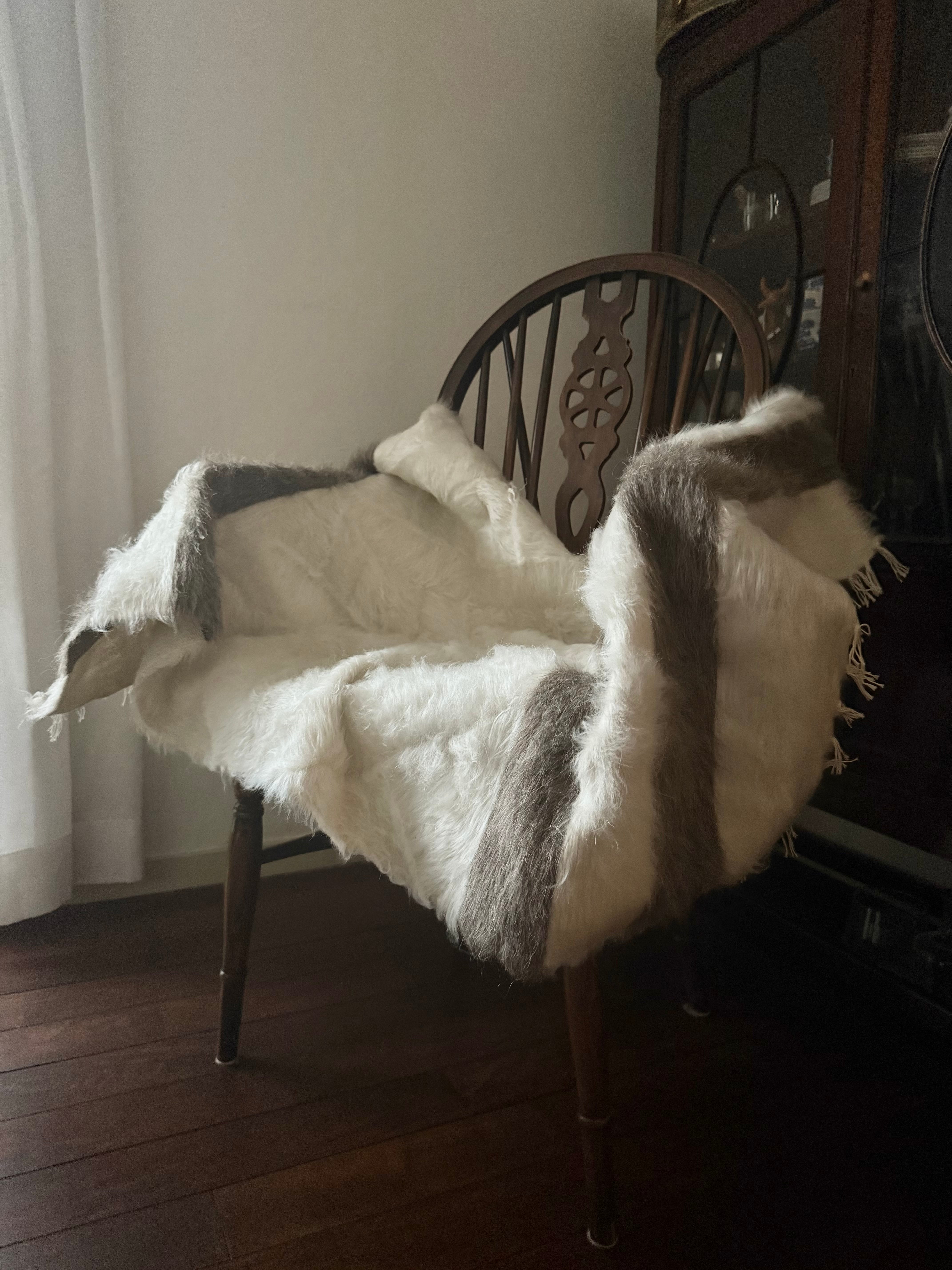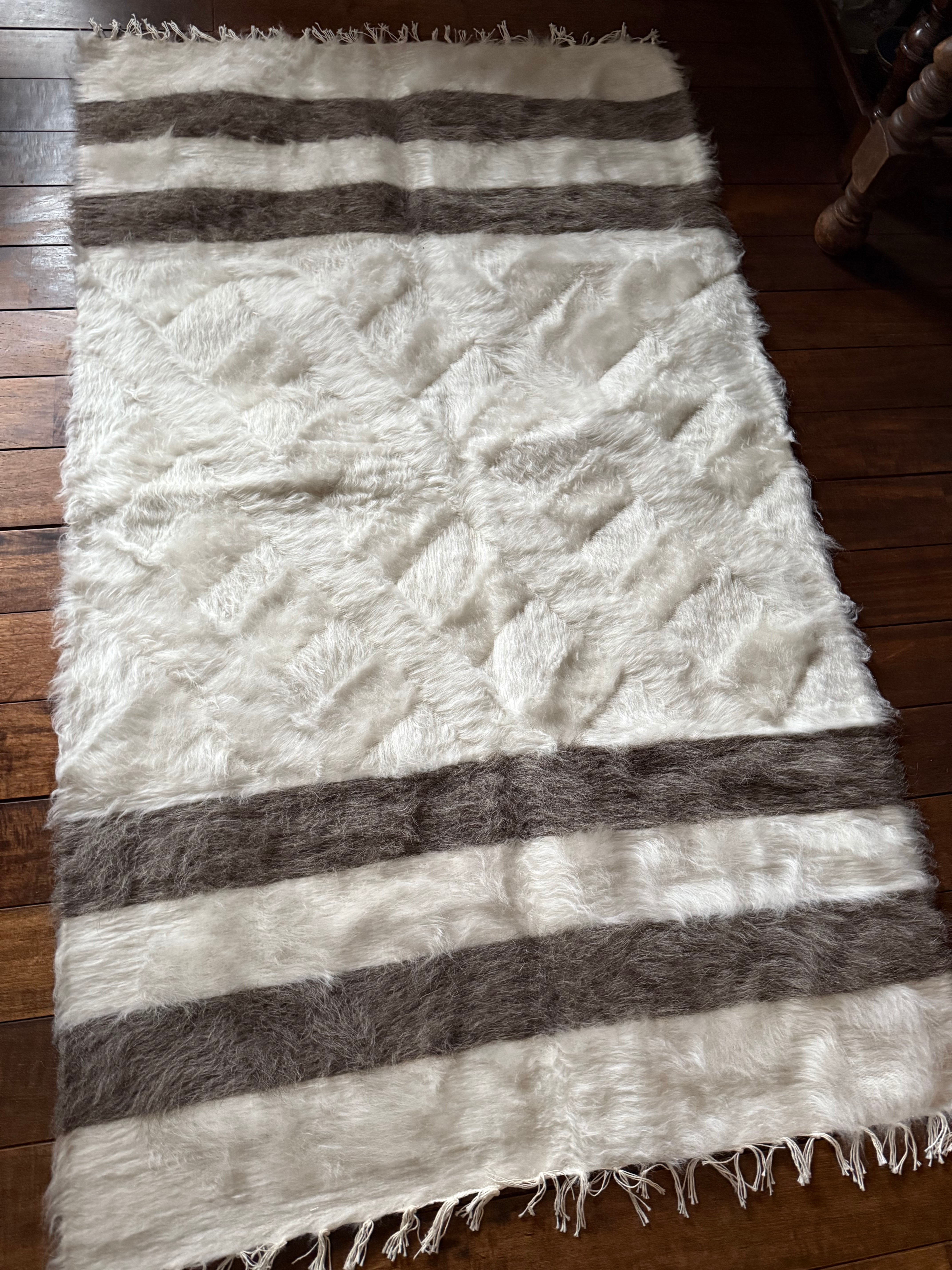 アンゴラ山羊の毛量はヴィンテージに比べて少ないのですが、布自体がしっかりとしていて、ラグとして気軽にどこにでも使いやすいものになります。