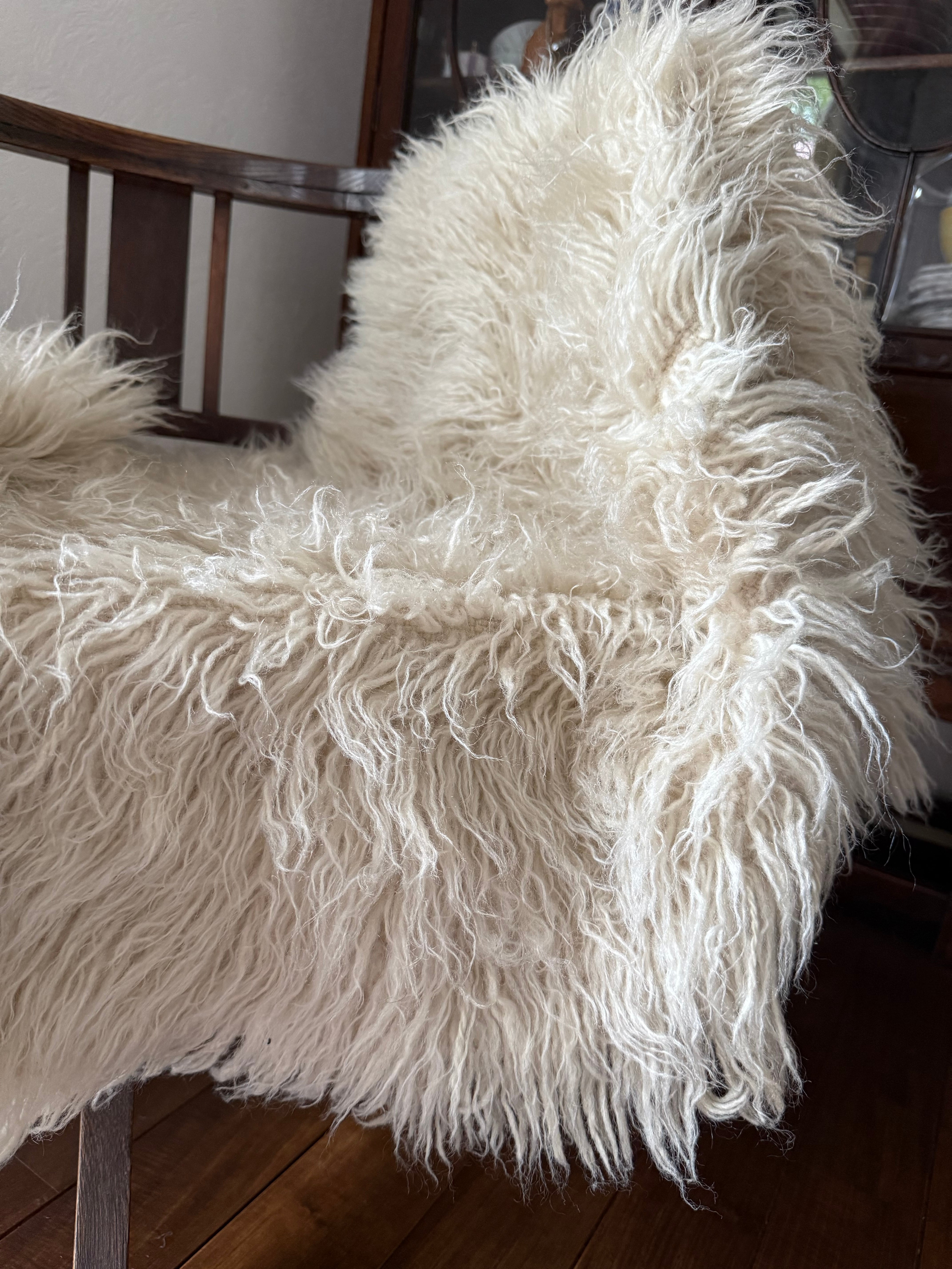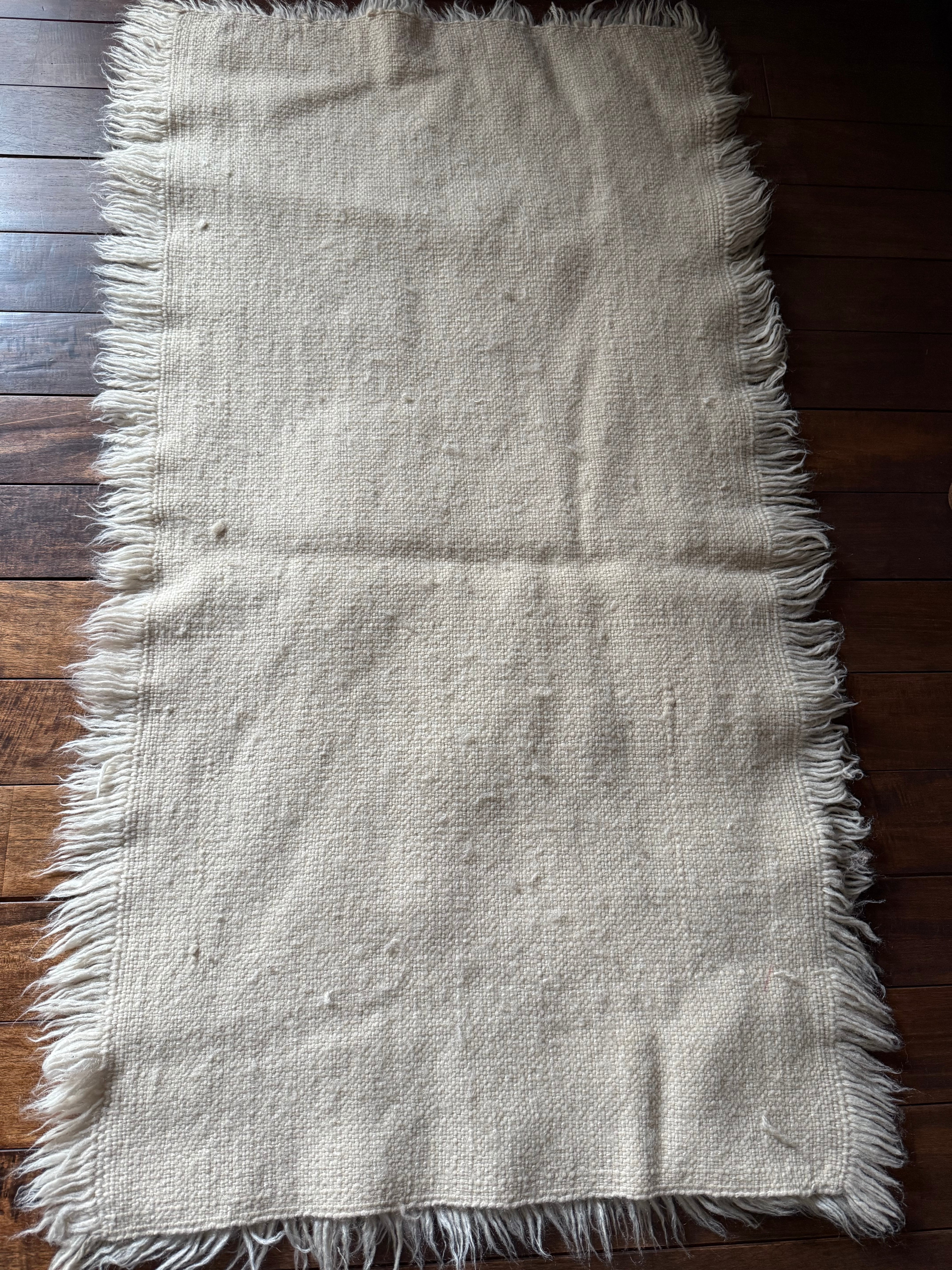 織り方はざっくりとしていて、いかにも家庭で織られてきた手織りの織り物。紡いだ長い羊の毛を織り込んでいます。
