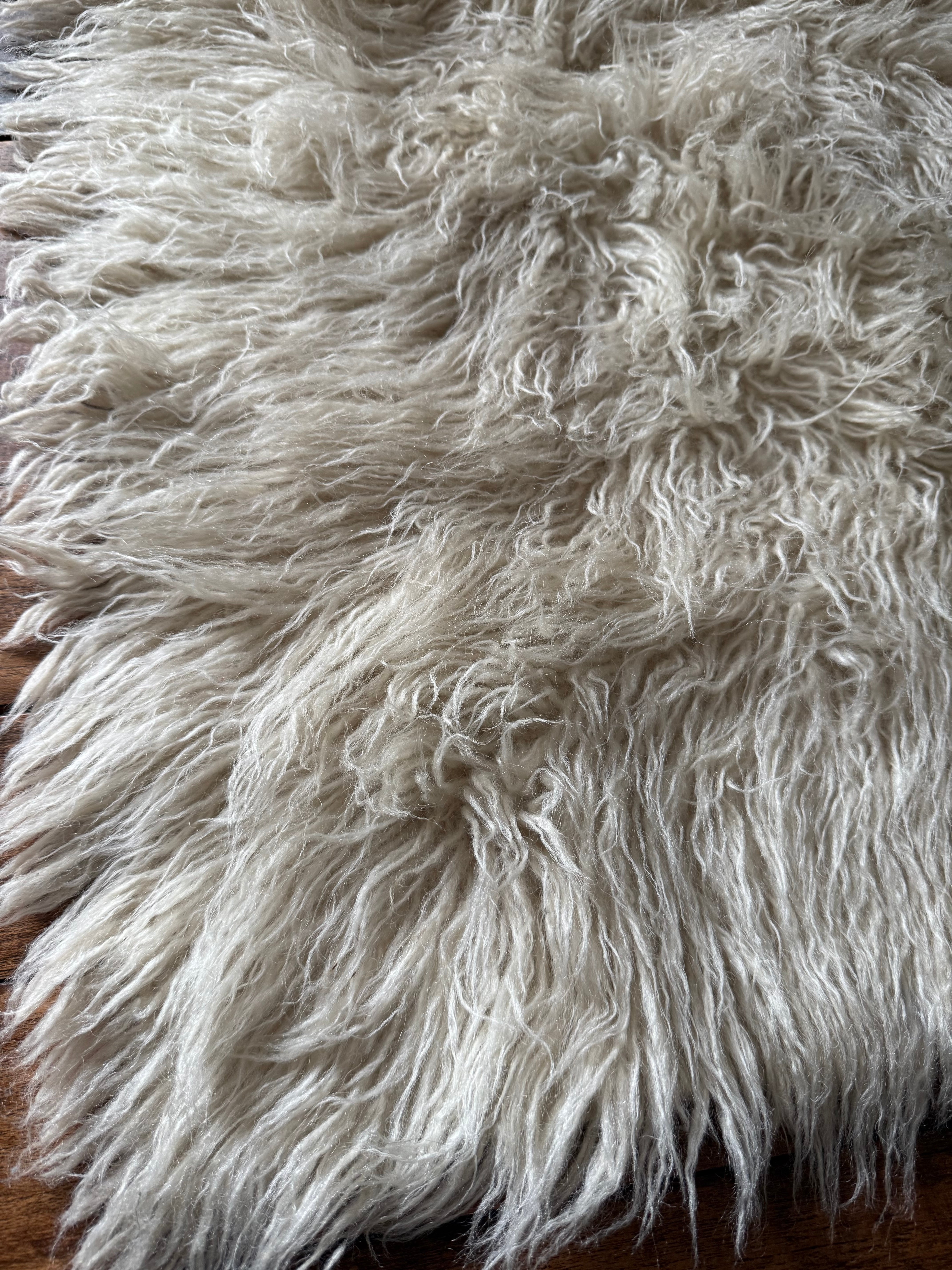 トゥルのSサイズ。やわらかなミルクのようなホワイトで、ふわふわ、ふさふさです。パーリーな艶があります。