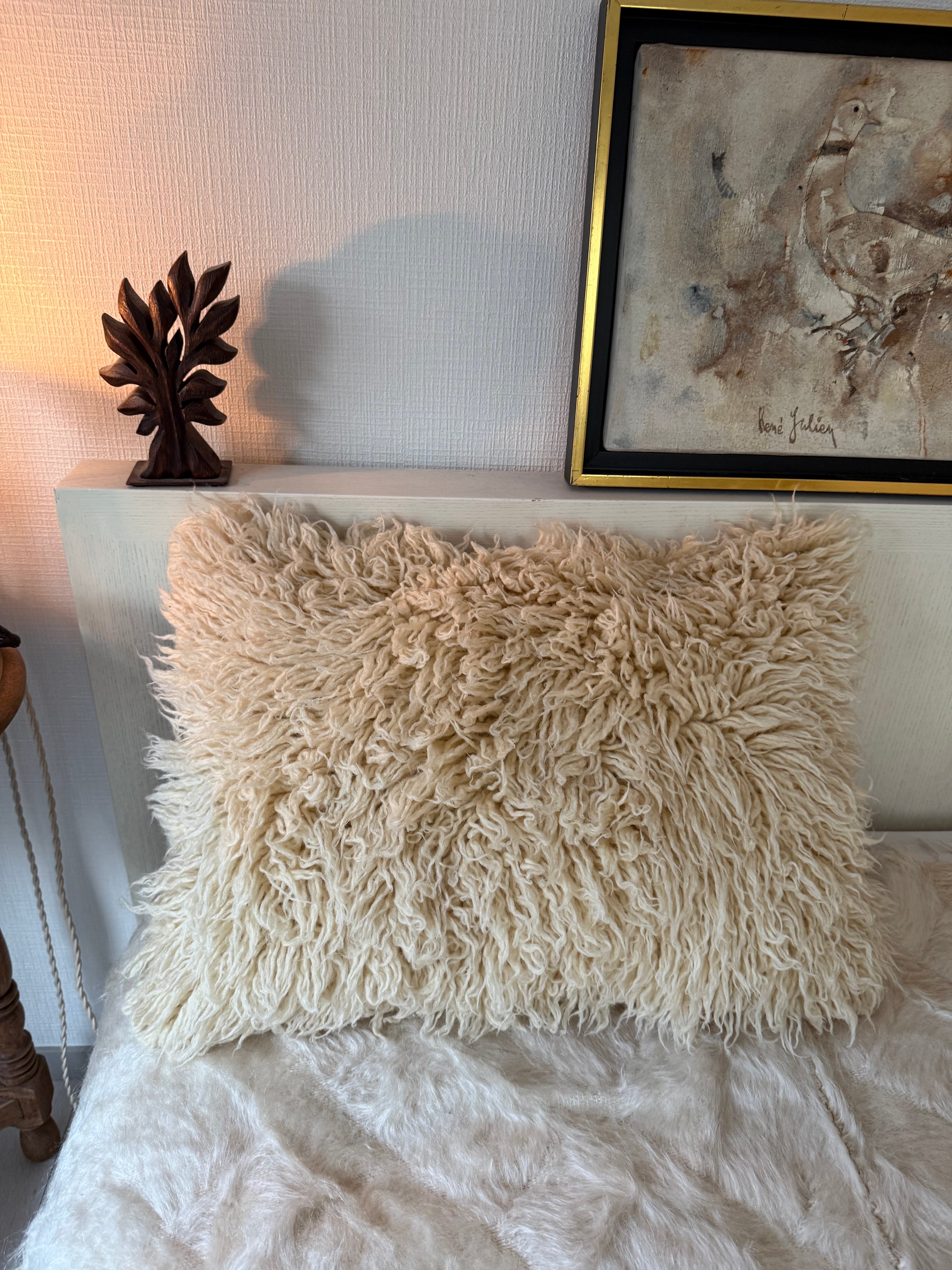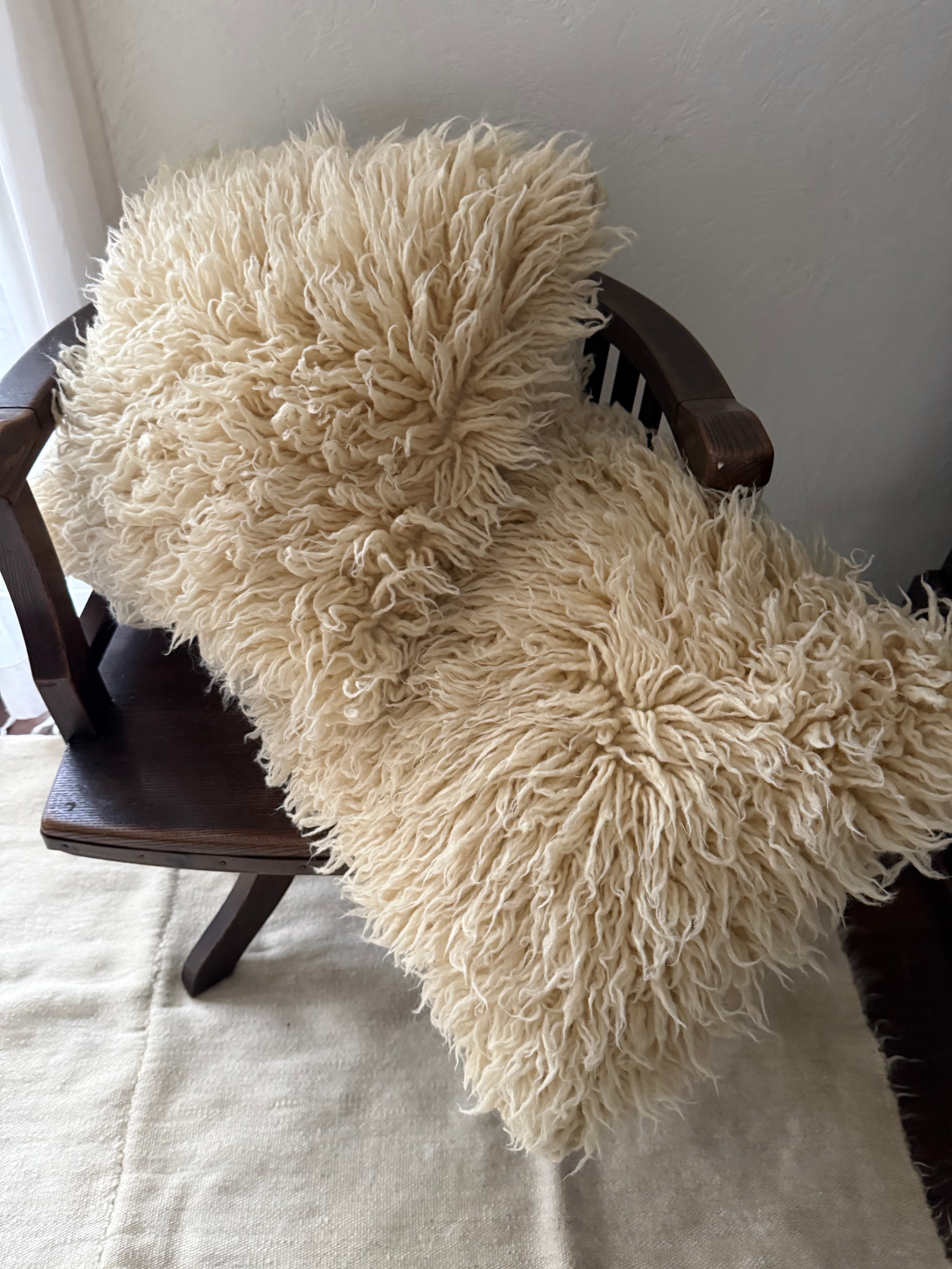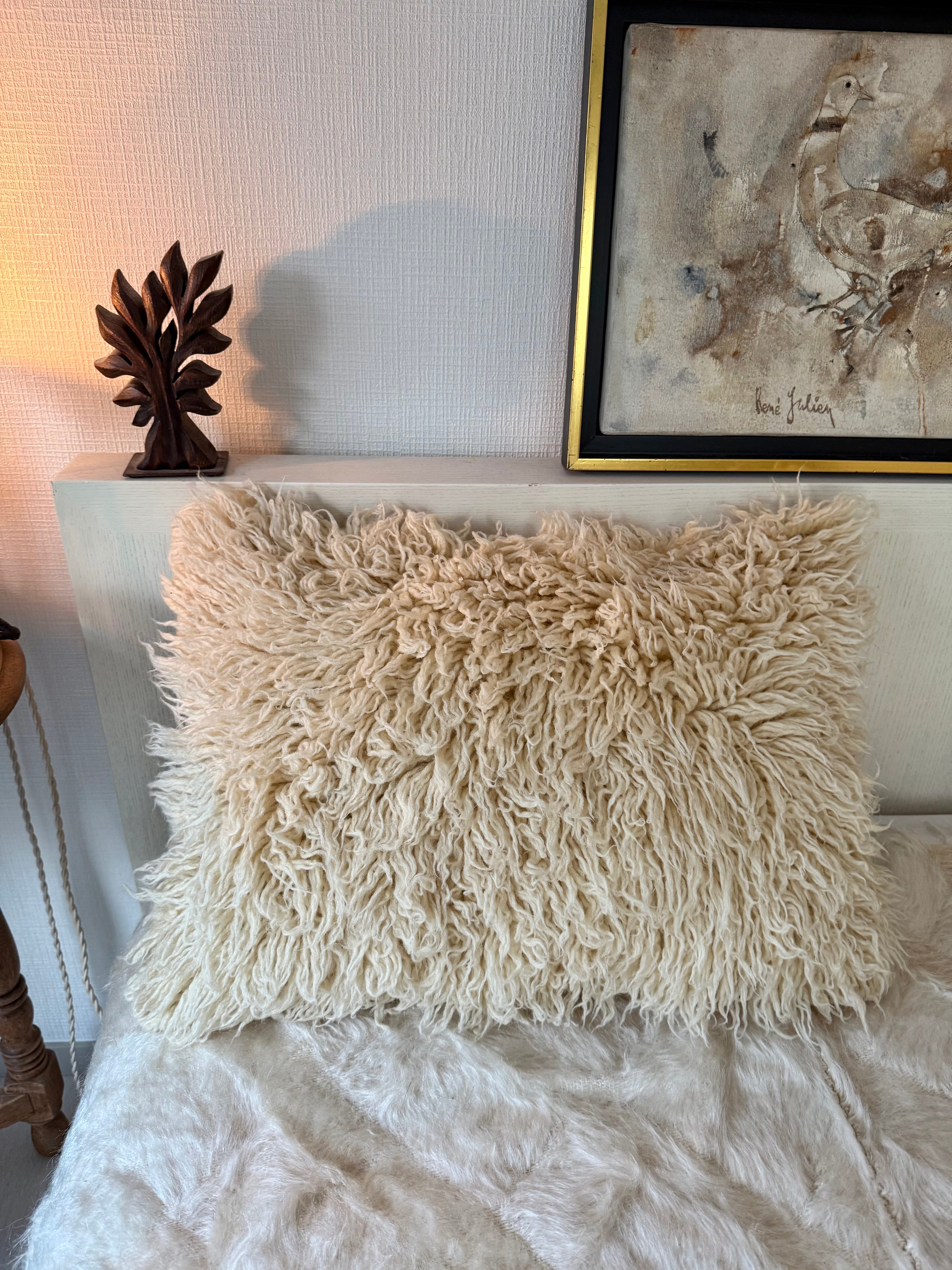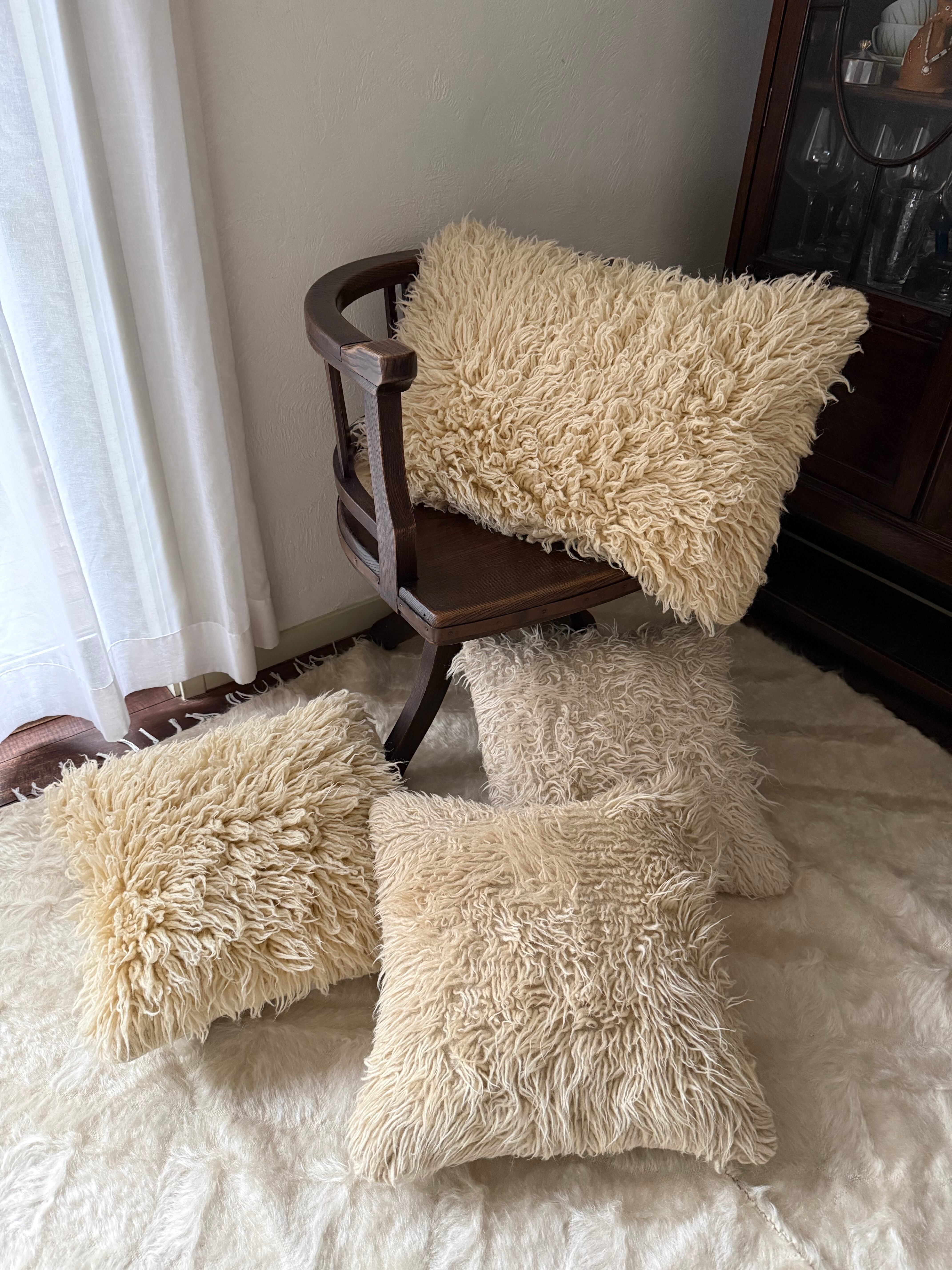 長い毛足のもしゃもしゃのTulu(トゥル)のクッションカバー。大きなトゥルをリサイズして作られています。