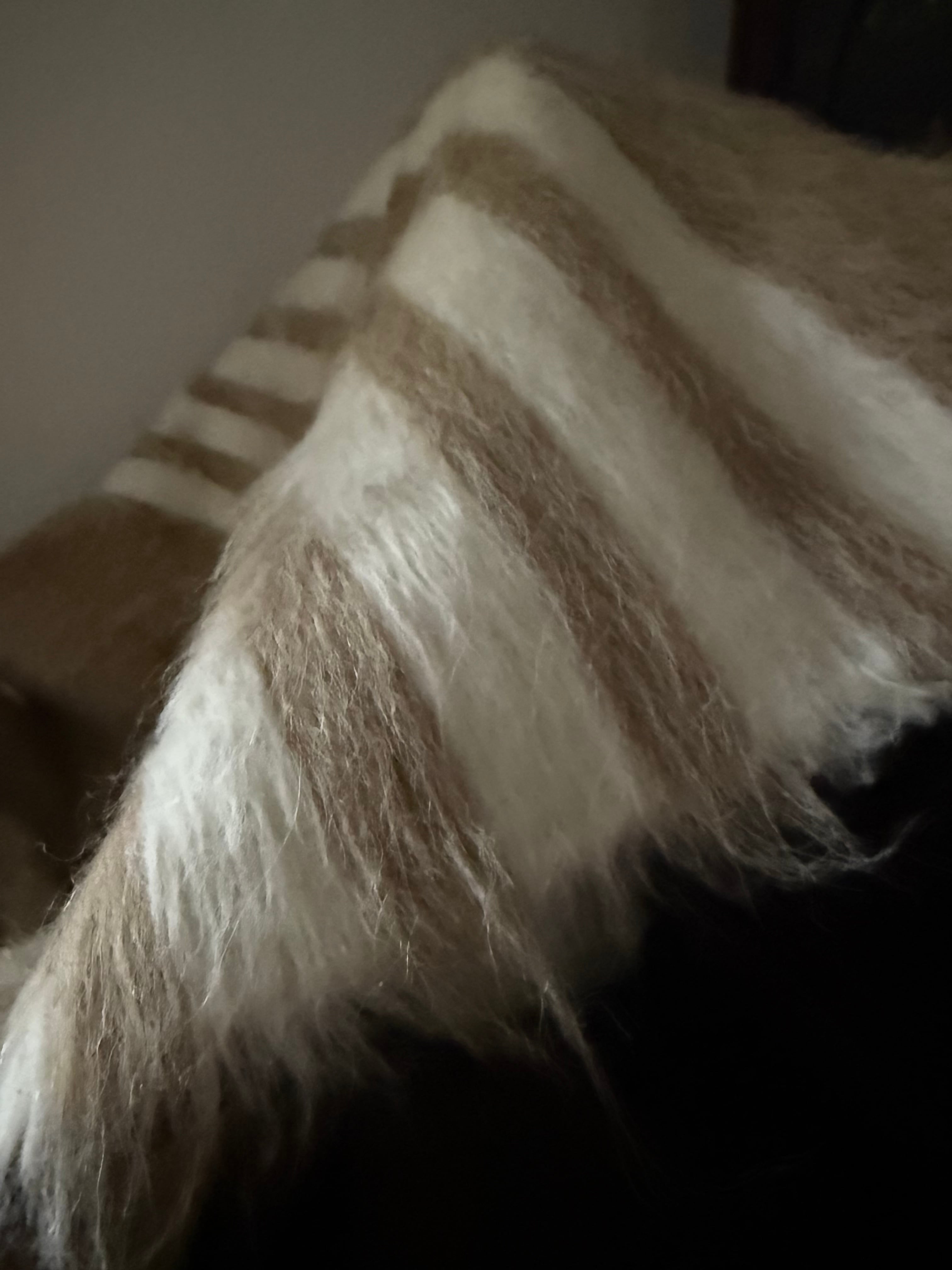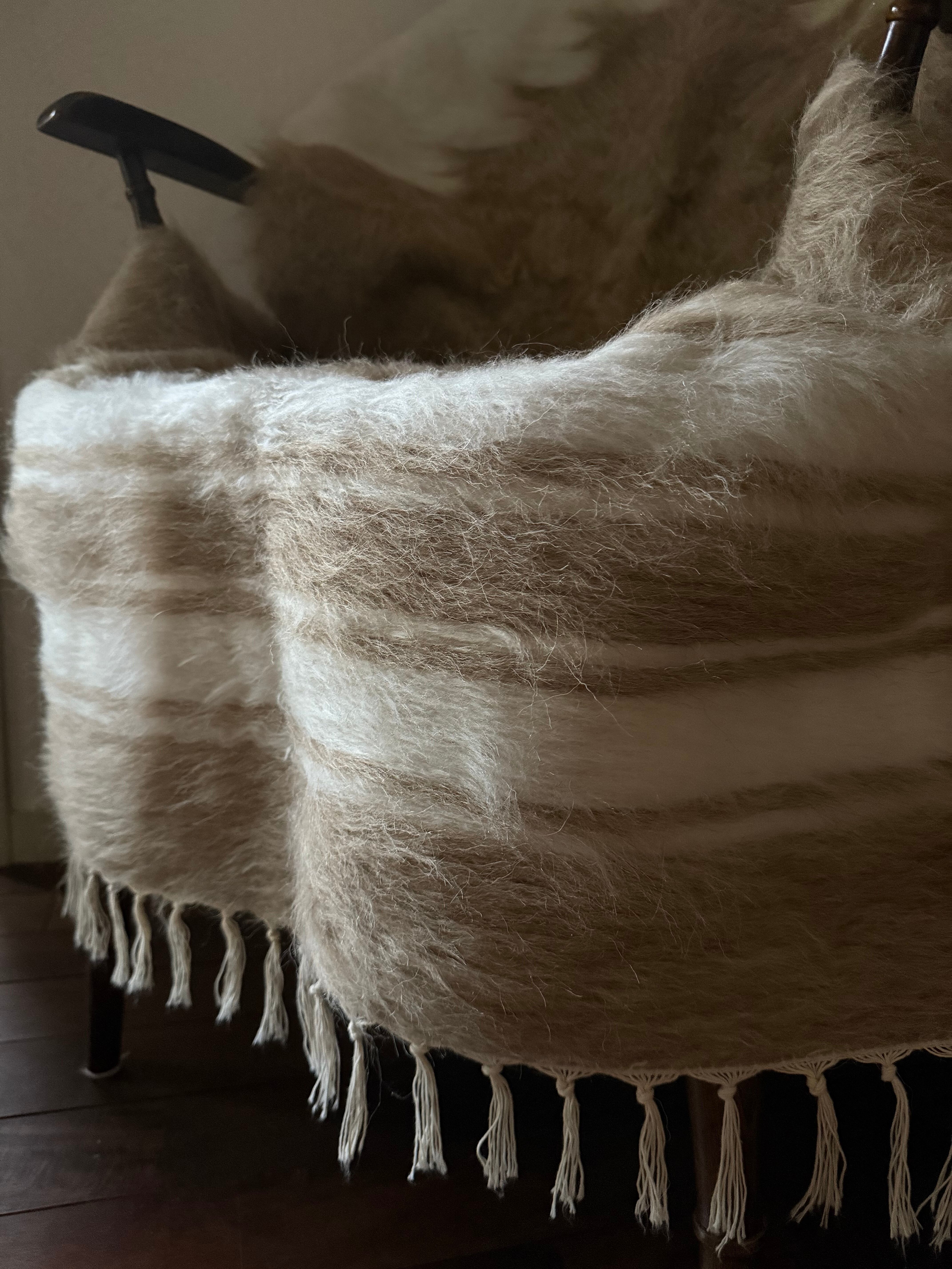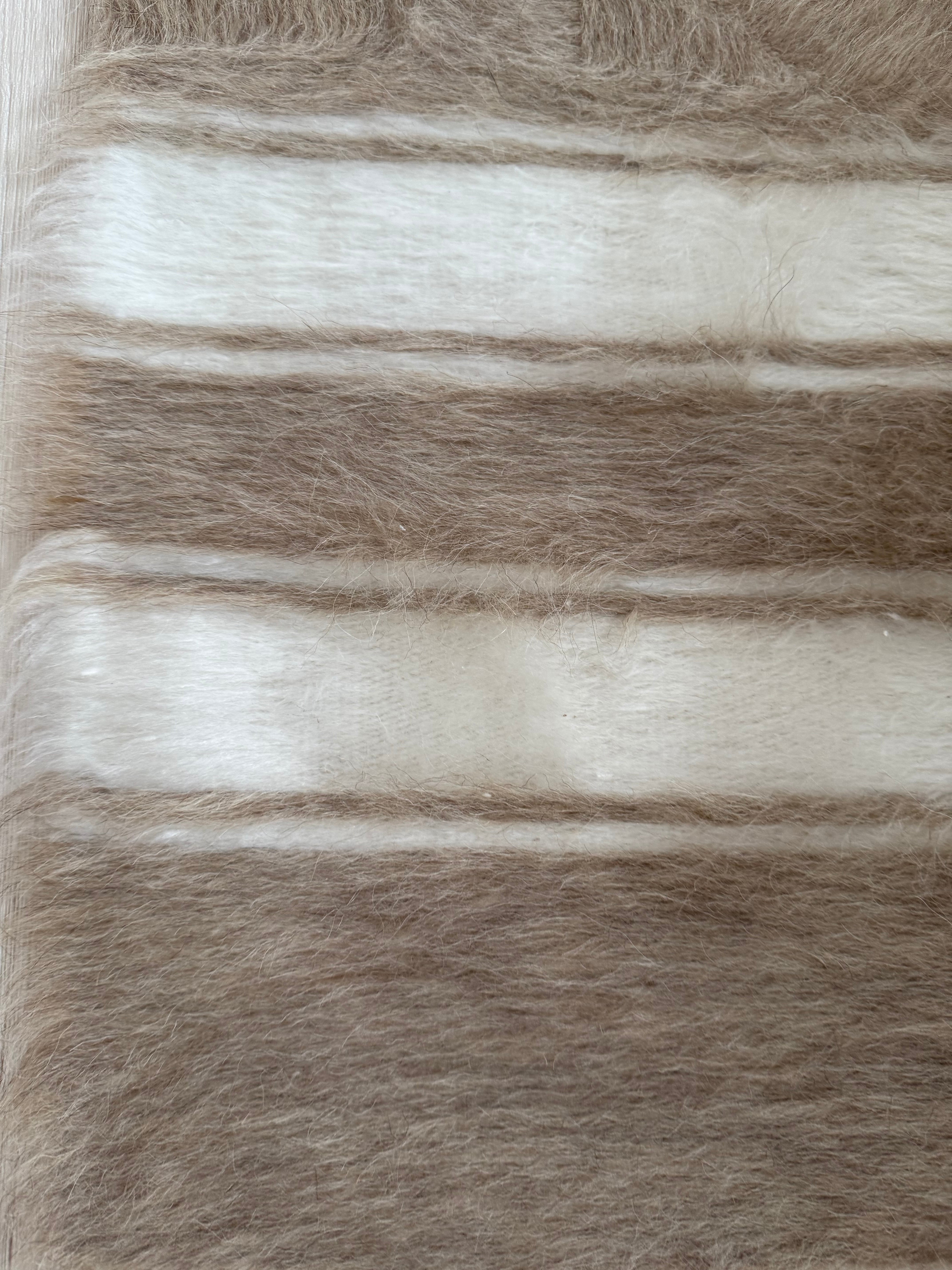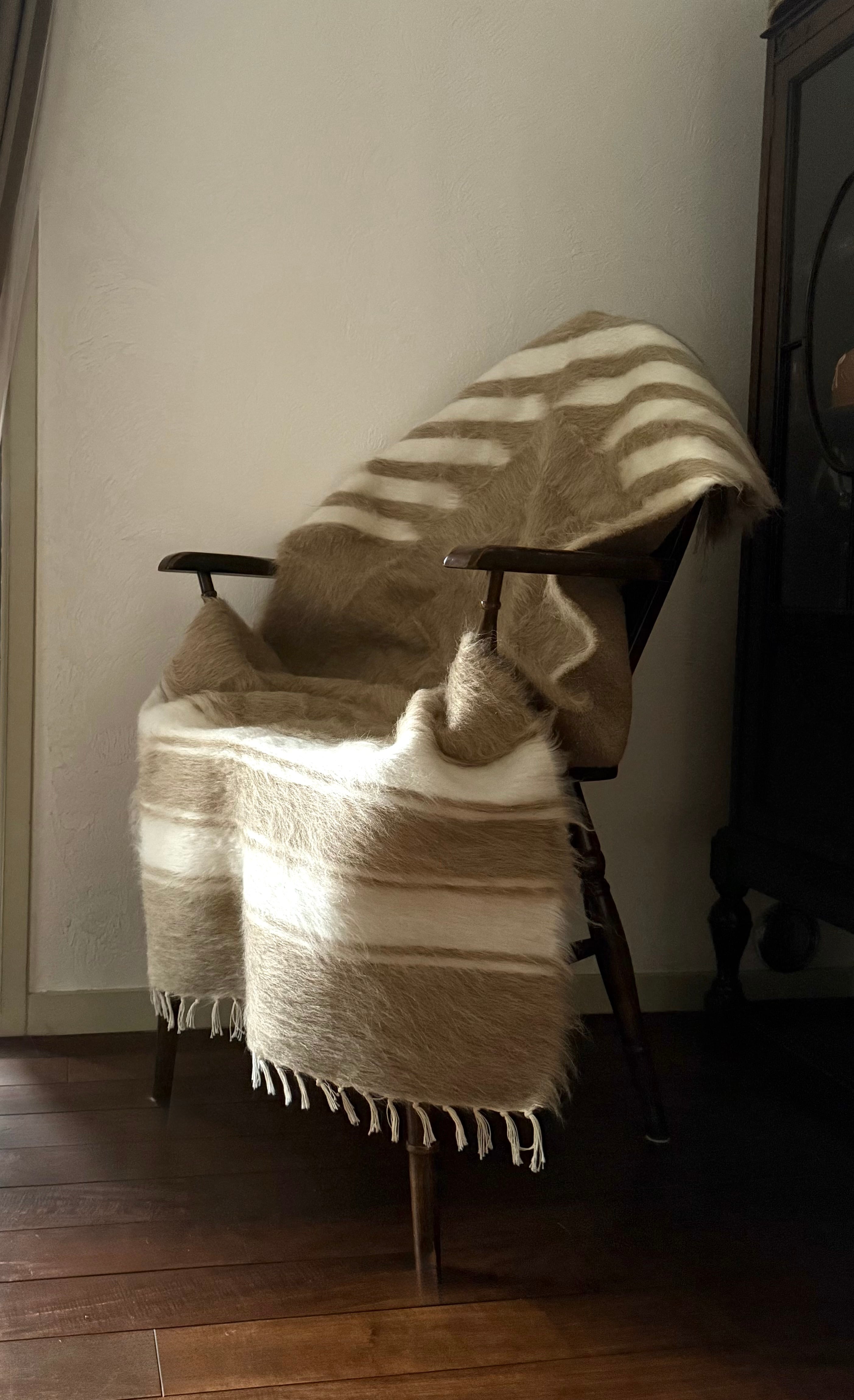 新品はヴィンテージより手触りがしっかりとしているので、毛布(ブランケット)というよりラグ向きですが、こちらのベージュは新品の中でもやわらかめ。