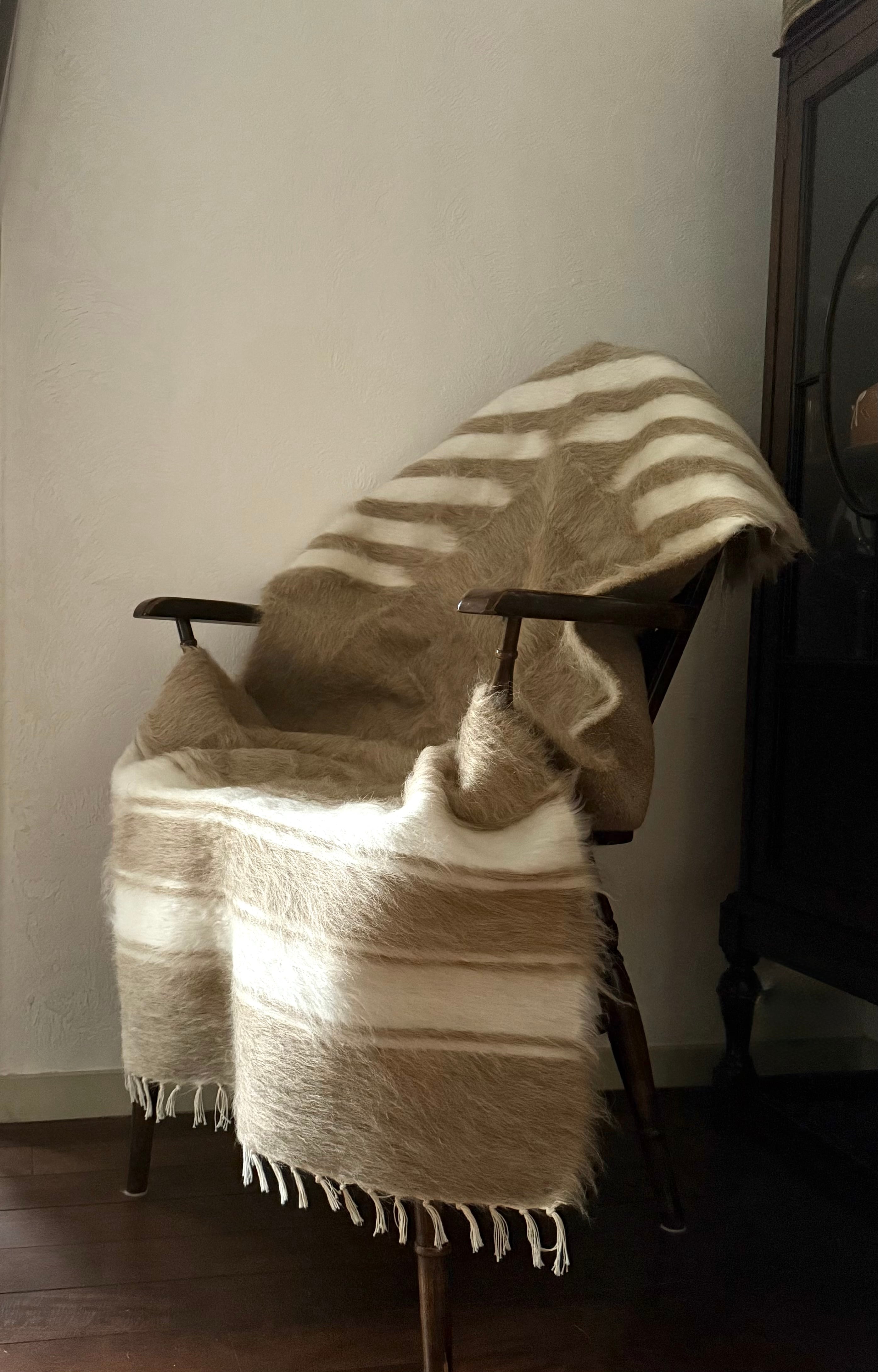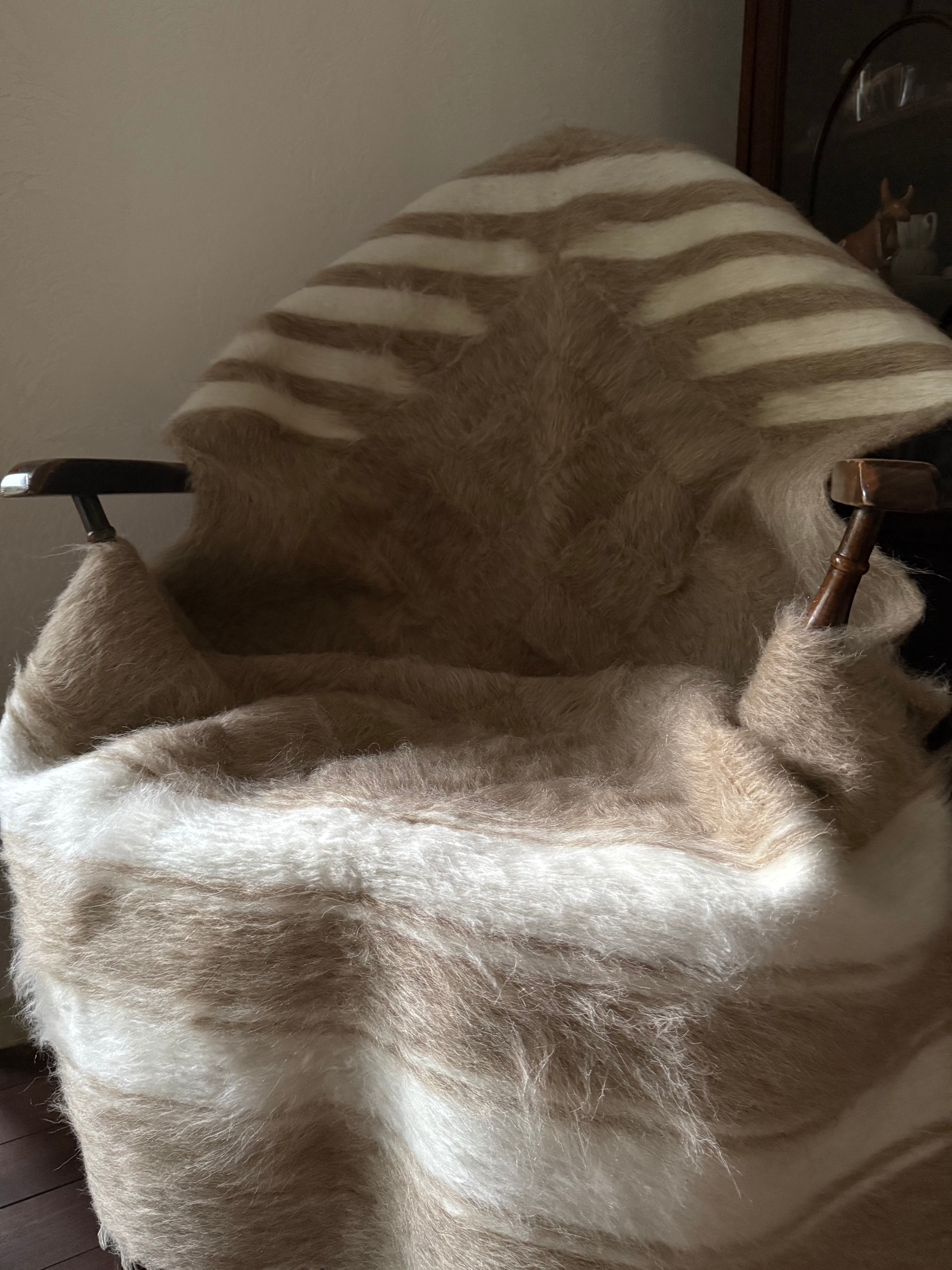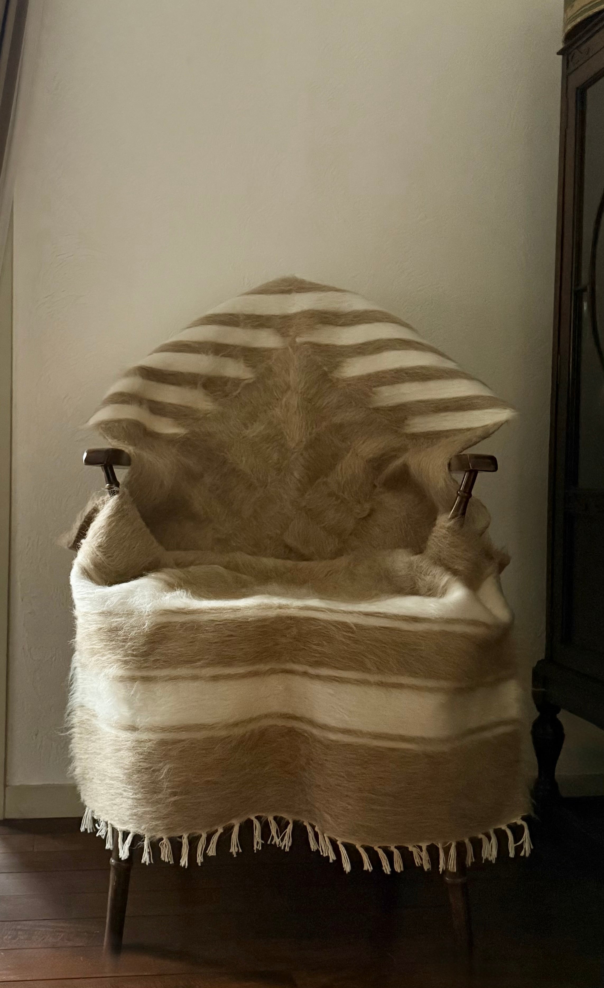 ヴィンテージは、アンゴラ山羊の毛の毛量が多く、まさに毛皮のような厚みと柔らかさが魅力。色合いやデザインは一つ一つ違います。最高級のアンゴラ山羊の毛を使ったヴィンテージのバッターニエは、最近人気が出ているため、数年後には無くなることが予想されます。柔らかいのでベッドやソファにかけても、贅沢な毛布としても。